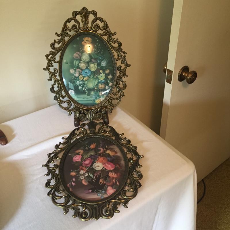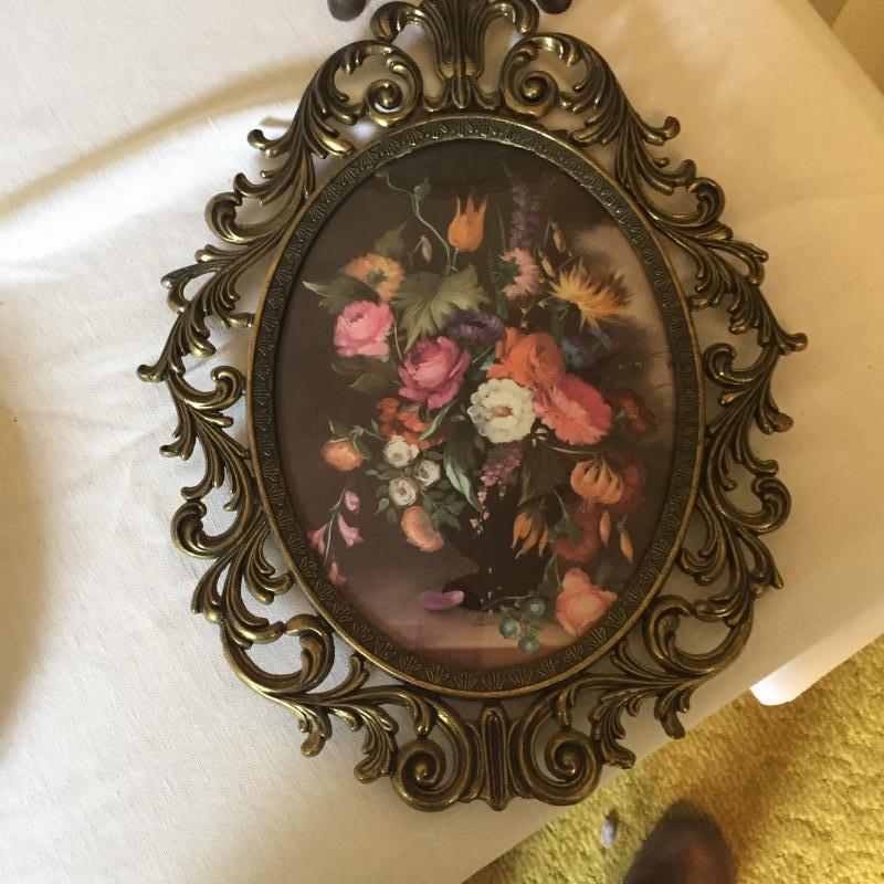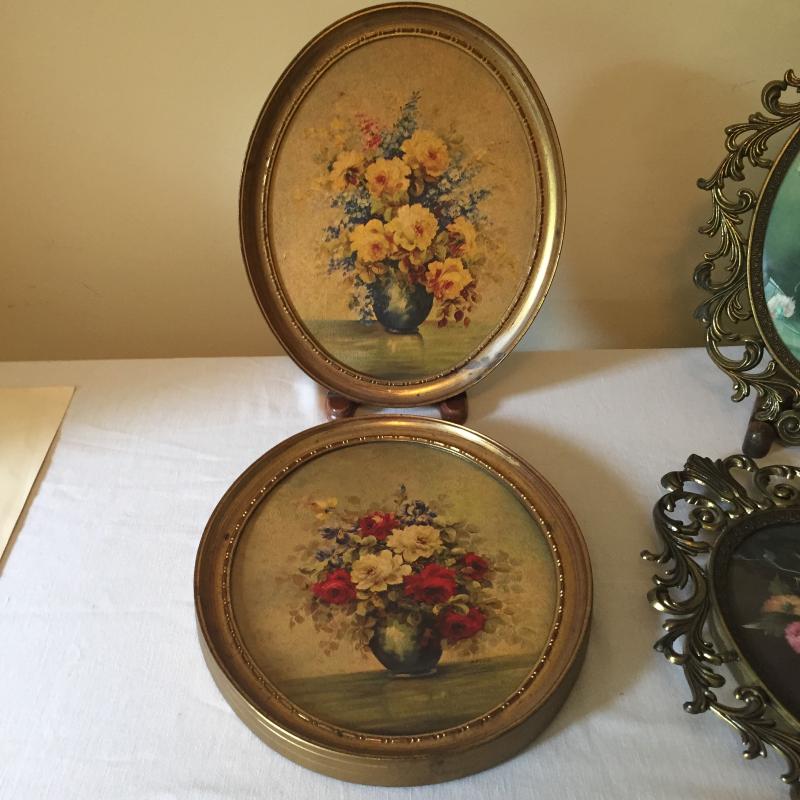 Pair of Italian floral wall hangings, measuring 13.5" x 10.5". Seton Finch print from Biltmore House library measures 16” x 12”. Water damage on top. See Pics. Shipping available.