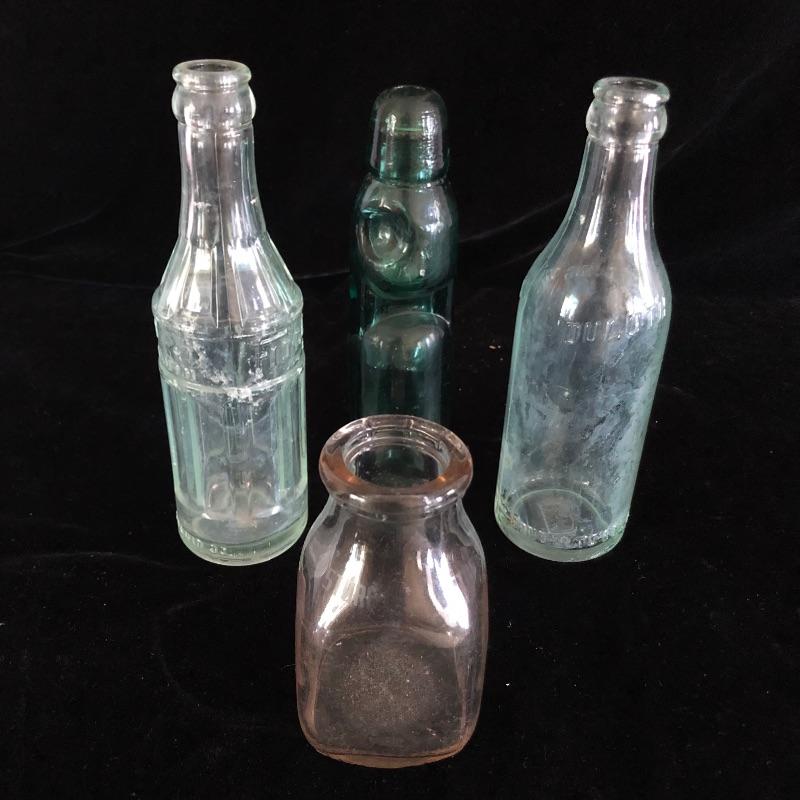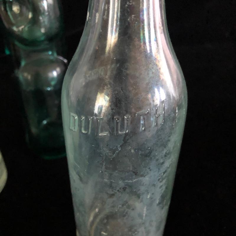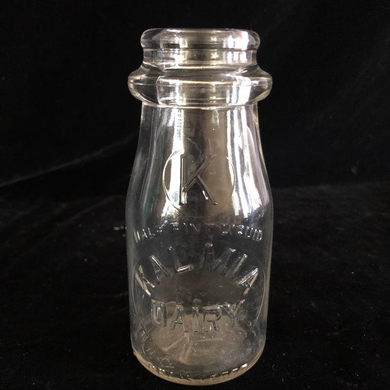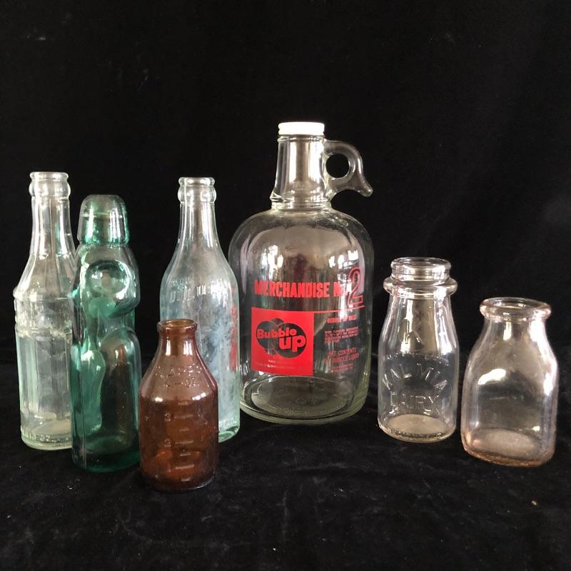 A total of seven vintage glass bottles for all you collectors. We have clear, green and brown bottles. The largest bottle is a 60 ounce one that measures 10” tall. See images for any markings and the note that comes with the Kalmia Dairy bottle as this appears to be from between 1911-1957 in the Hendersonville area.