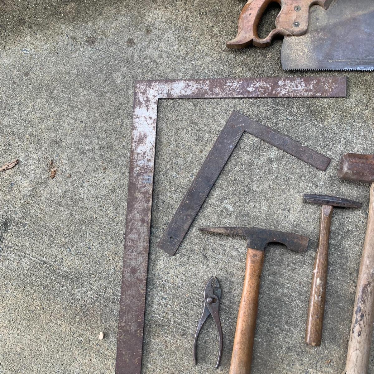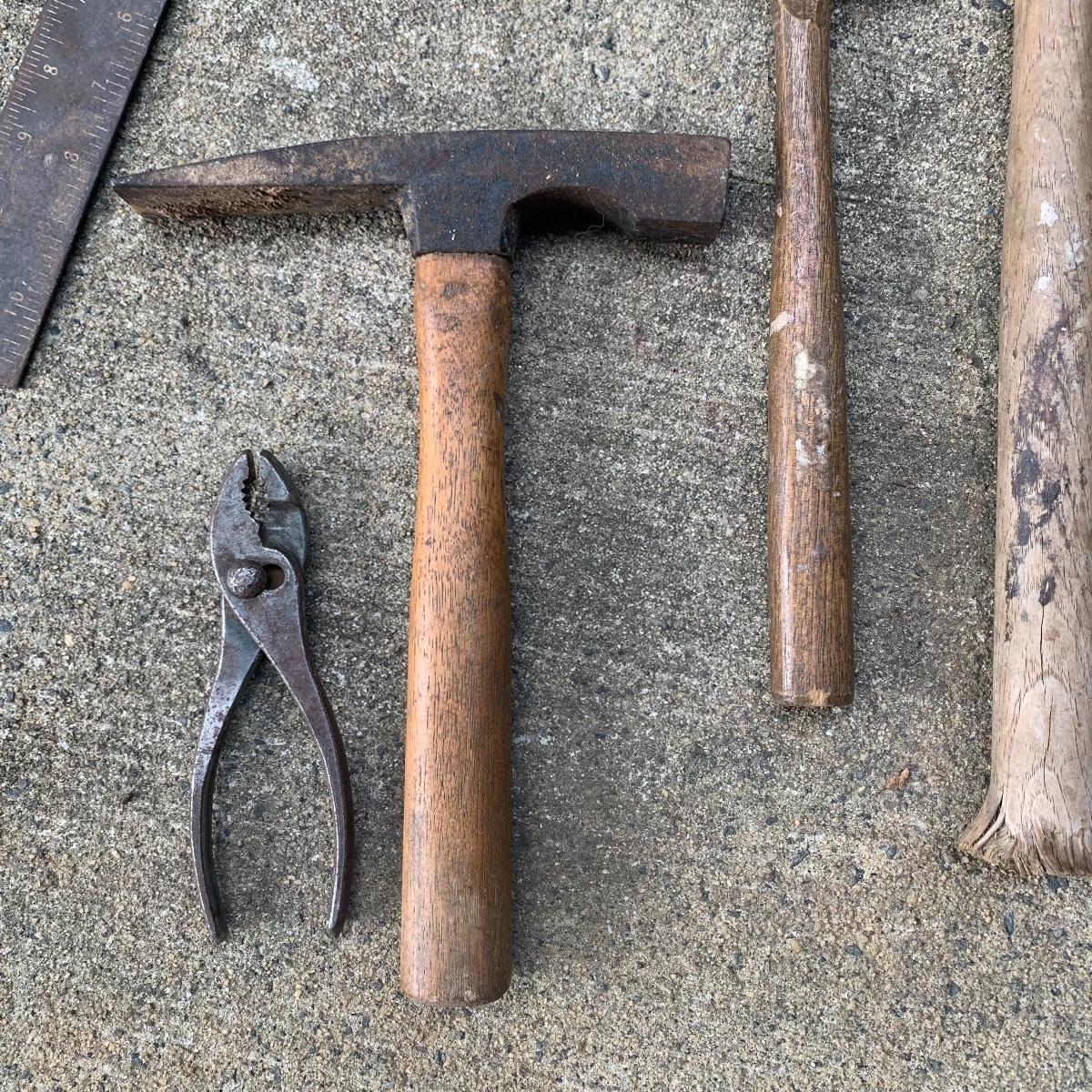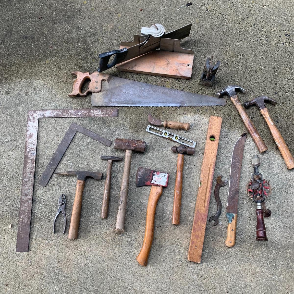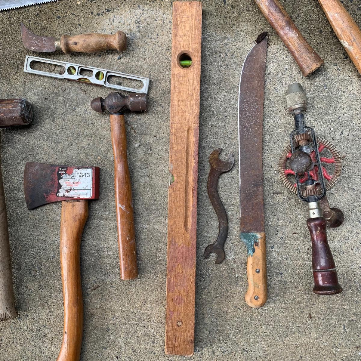 Attention lovers of vintage tools! Don’t pass up this lot! This collection includes two framing squares, pliers, a hand saw, a miter saw, numerous hammers of different sizes, two levels, a hatchet, a curved wrench, a manual drill, a machete, and a small vice. All items have acquired a wonderful vintage patina throughout their tour of duty. One hammer has beat up handle, see pictures. Local pickup only