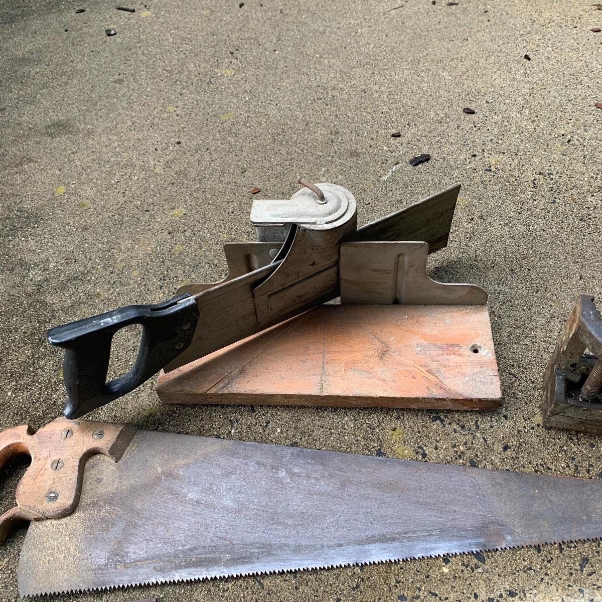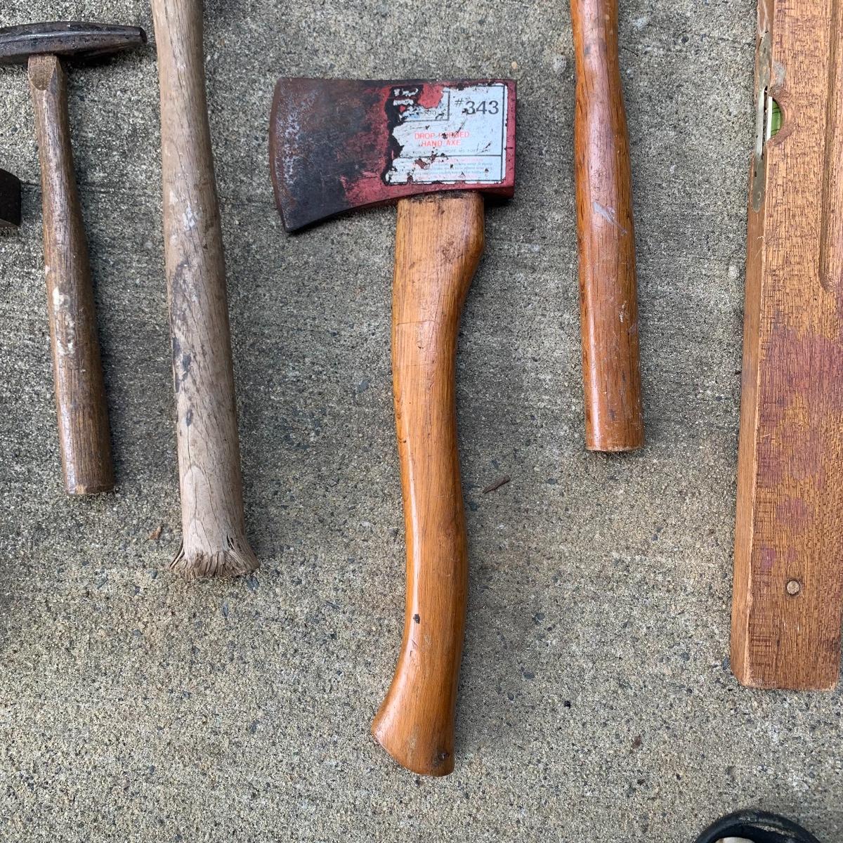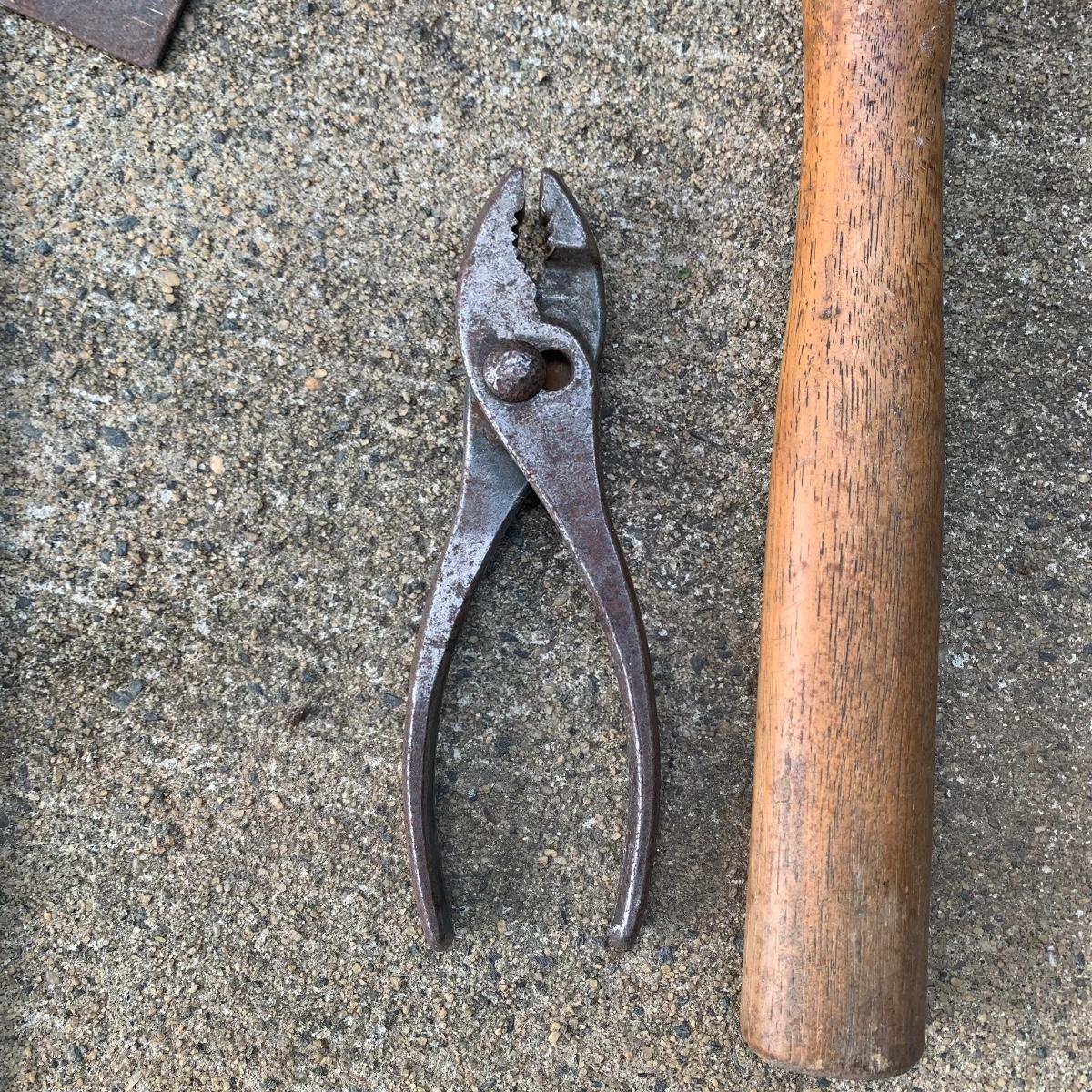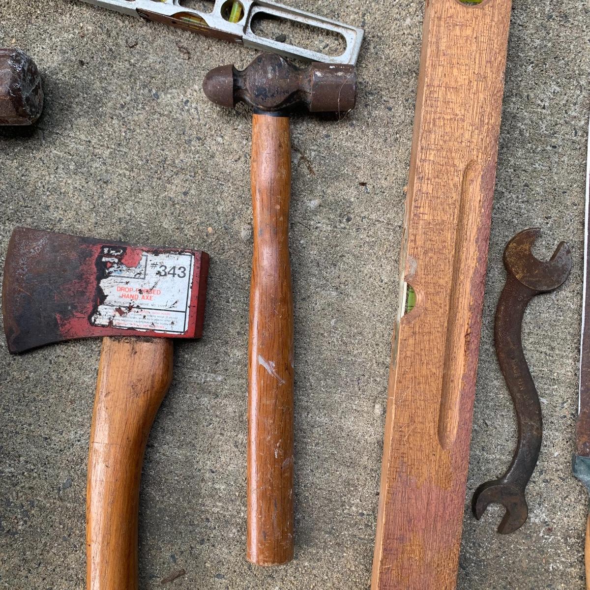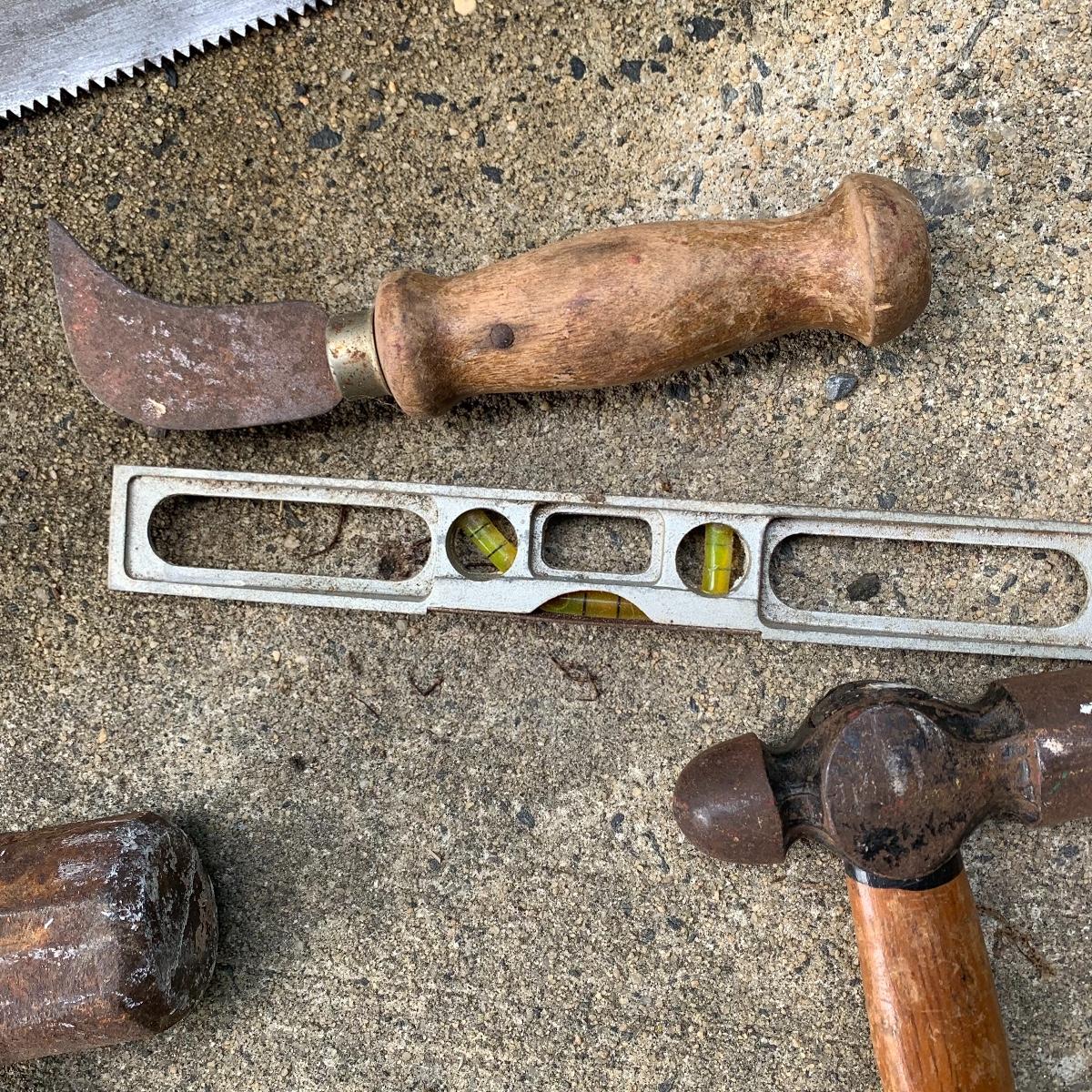 Attention lovers of vintage tools! Don’t pass up this lot! This collection includes two framing squares, pliers, a hand saw, a miter saw, numerous hammers of different sizes, two levels, a hatchet, a curved wrench, a manual drill, a machete, and a small vice. All items have acquired a wonderful vintage patina throughout their tour of duty. One hammer has beat up handle, see pictures. Local pickup only