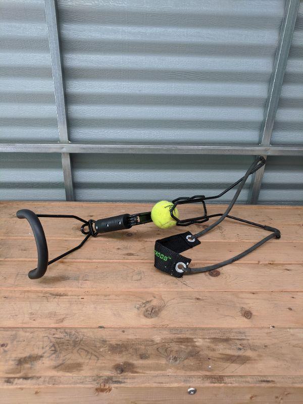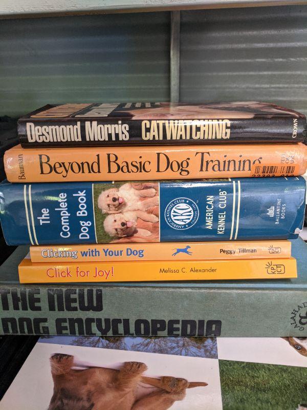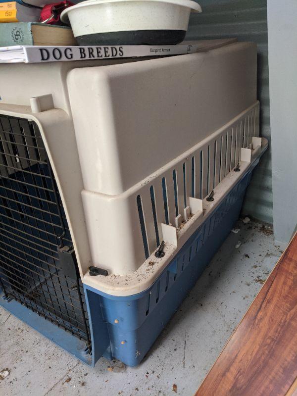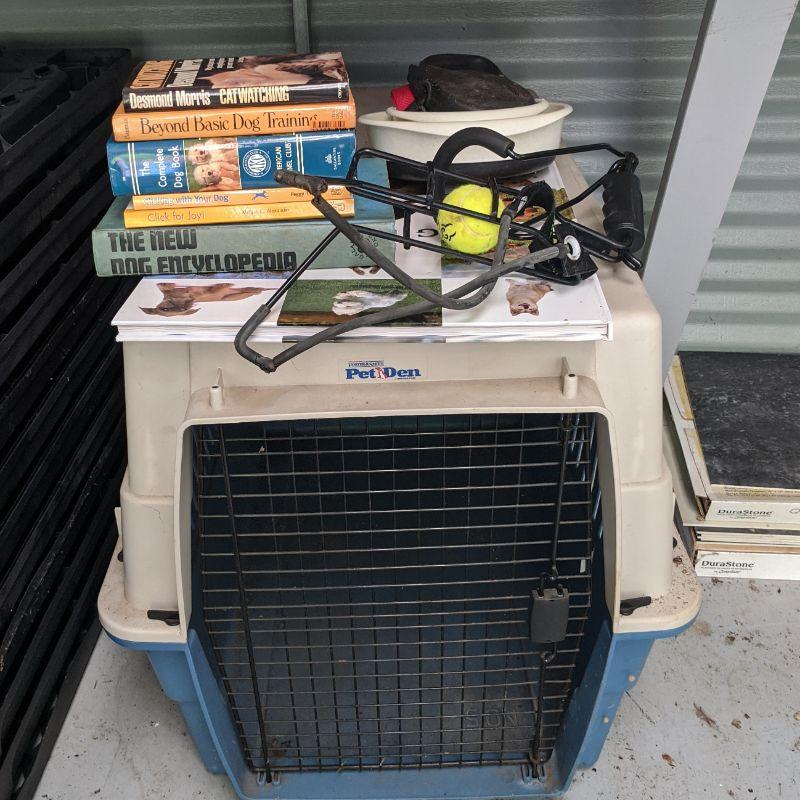 This lot is perfect for you new dog! The cage is a Pet Den cage and is approximately 3' length, 2'6" height, 2' wide. There is a Hyperdog tennis ball slingshot. Another item is 2 food and water bowls that have chee marks on them also there is a leash and collar. There are a couple books on dog training. See photos for more details.