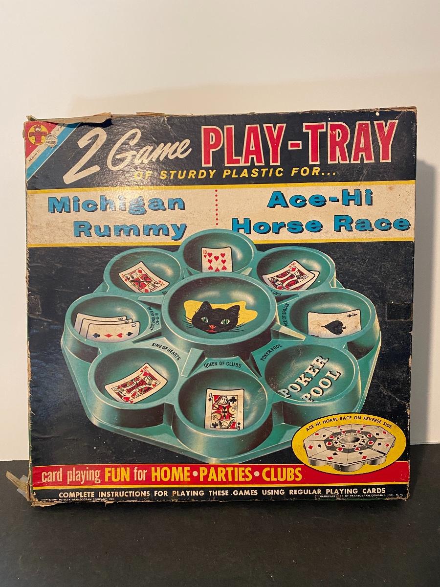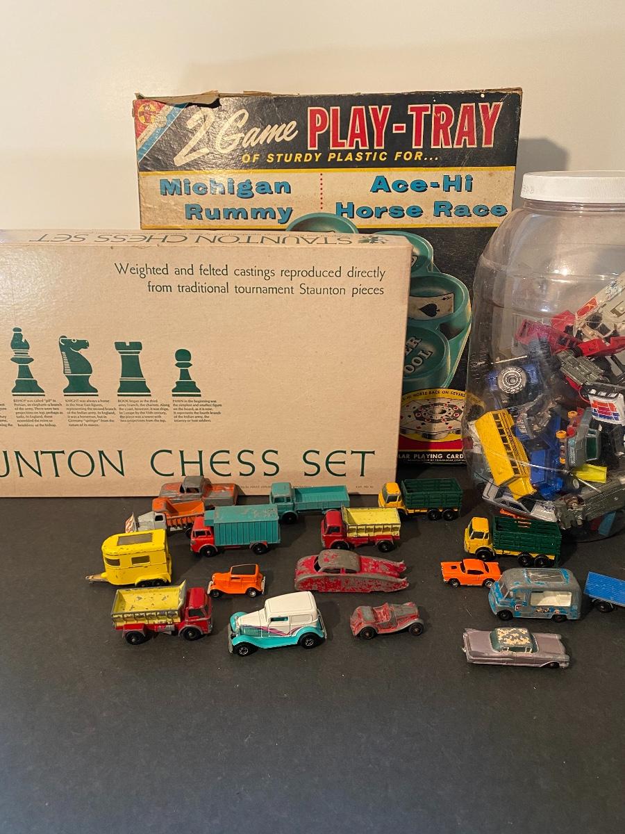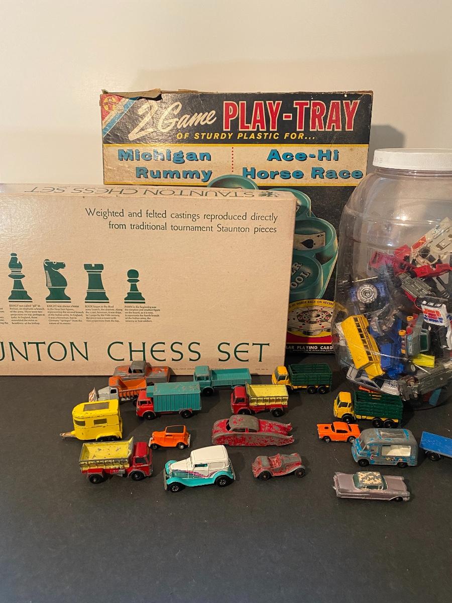 Vintage lot of mixed cars old and new, vintage complete Staunton Chess Set, and vintage Rummy Play-Tray with great graphics. Please see pictures as they are the best representation of the item, the condition of the item, and the size of the item.