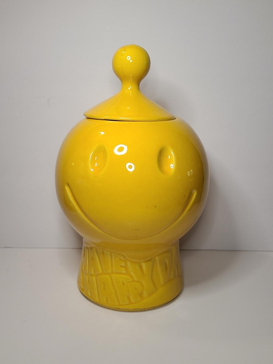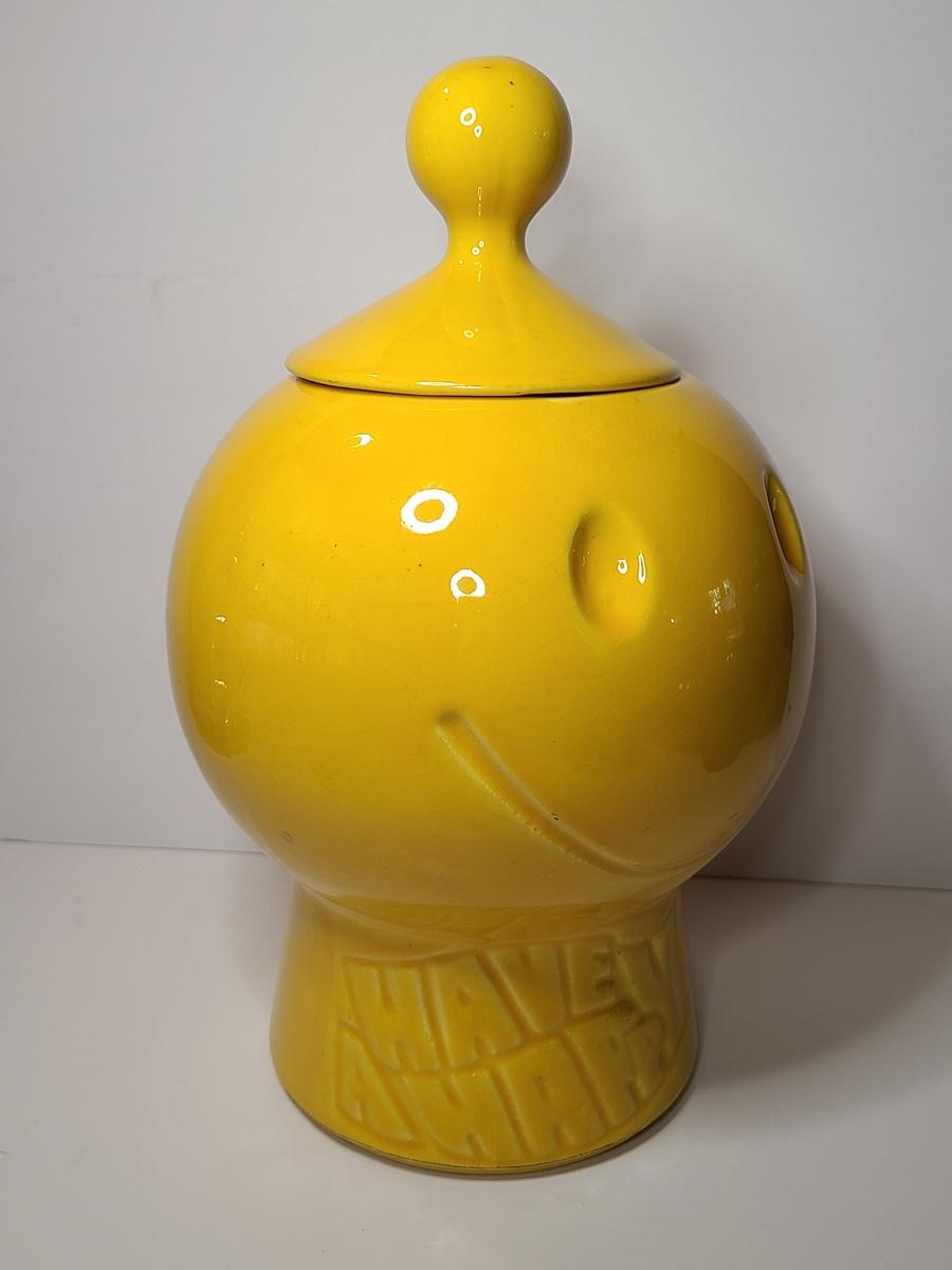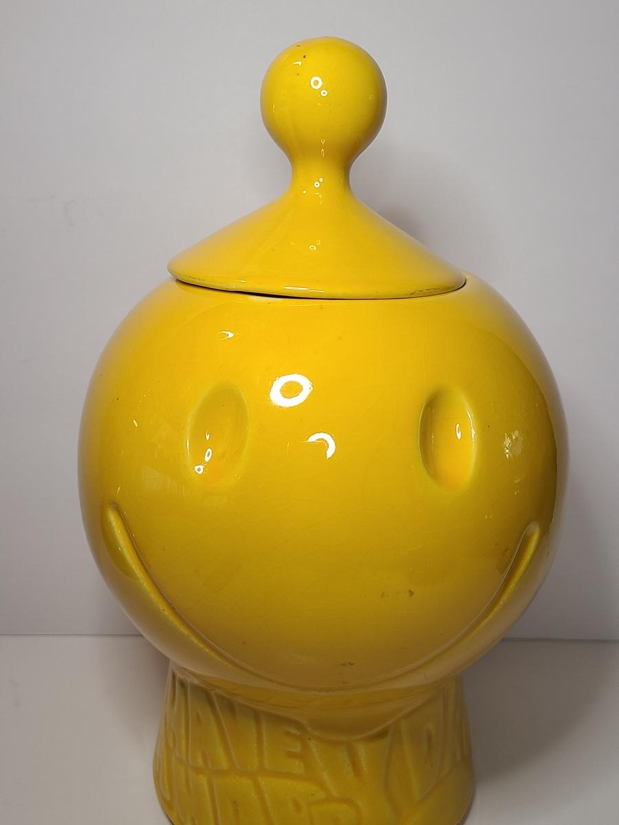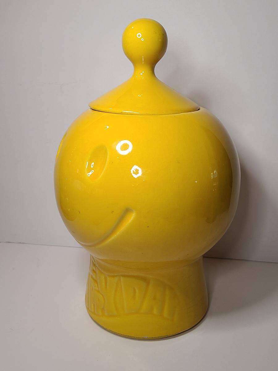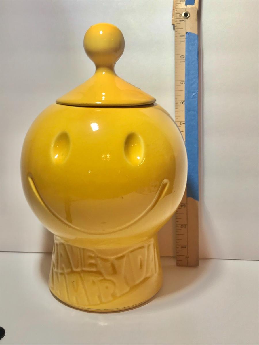 Blast from the past with this charming, bright yellow cookie jar by McCoy. This is marked but is hard to see due to age. Have a Nice Day with this Happy Face. Please see all pictures as they are the best representation of the items. The pictures show condition, measurements if taken, and what is included in the lot. Due to the large amount that we photograph and the time frame, we are not always able to take measurements. All items unless noted, are pre-owned and have been used. If you purchased furniture, you must bring help. We do not allow one person to carry large furniture out on their own. Bring help, tools and a truck for the safety of our client’s homes, and your personal safety. Company policy. Thank you.