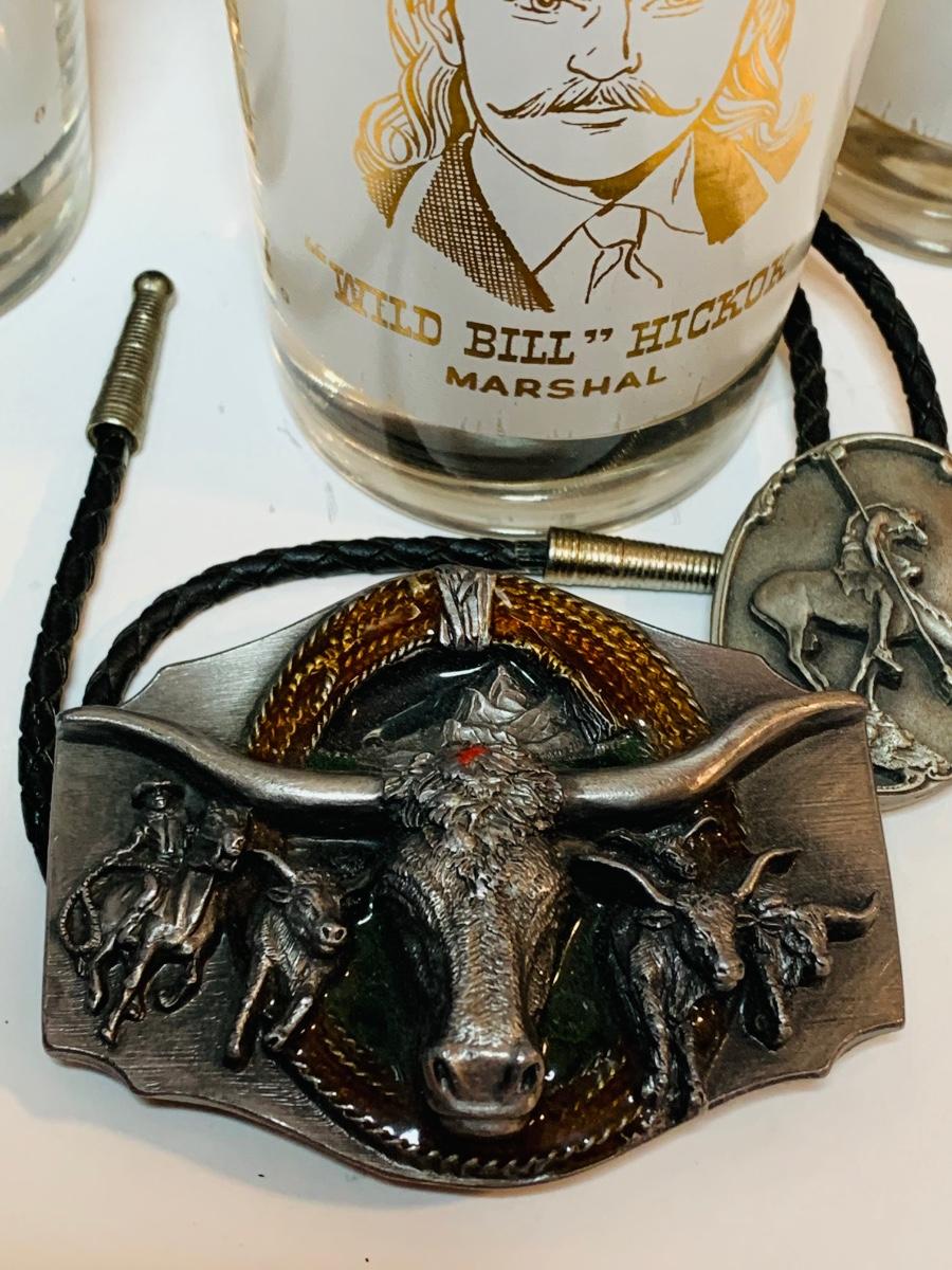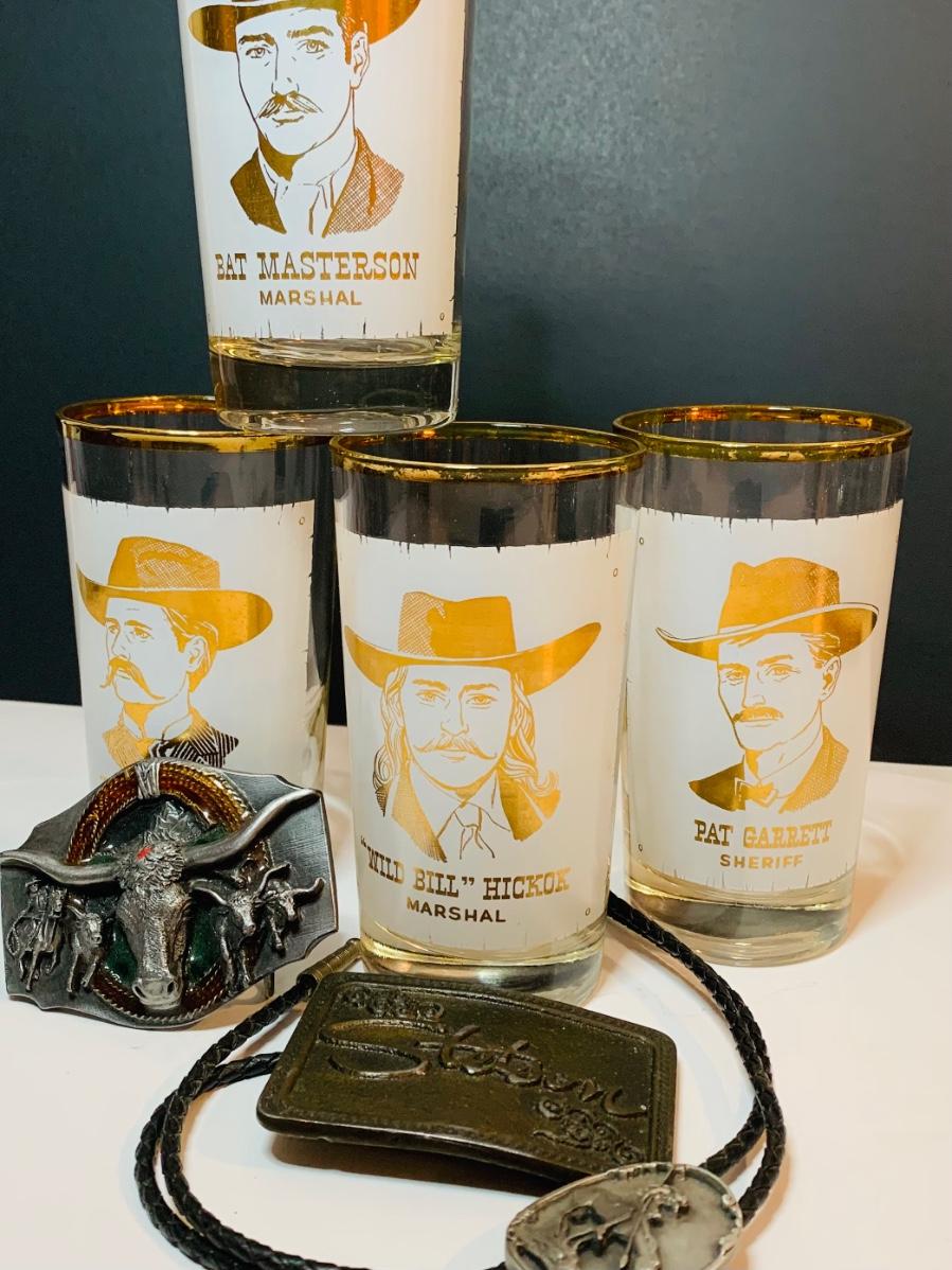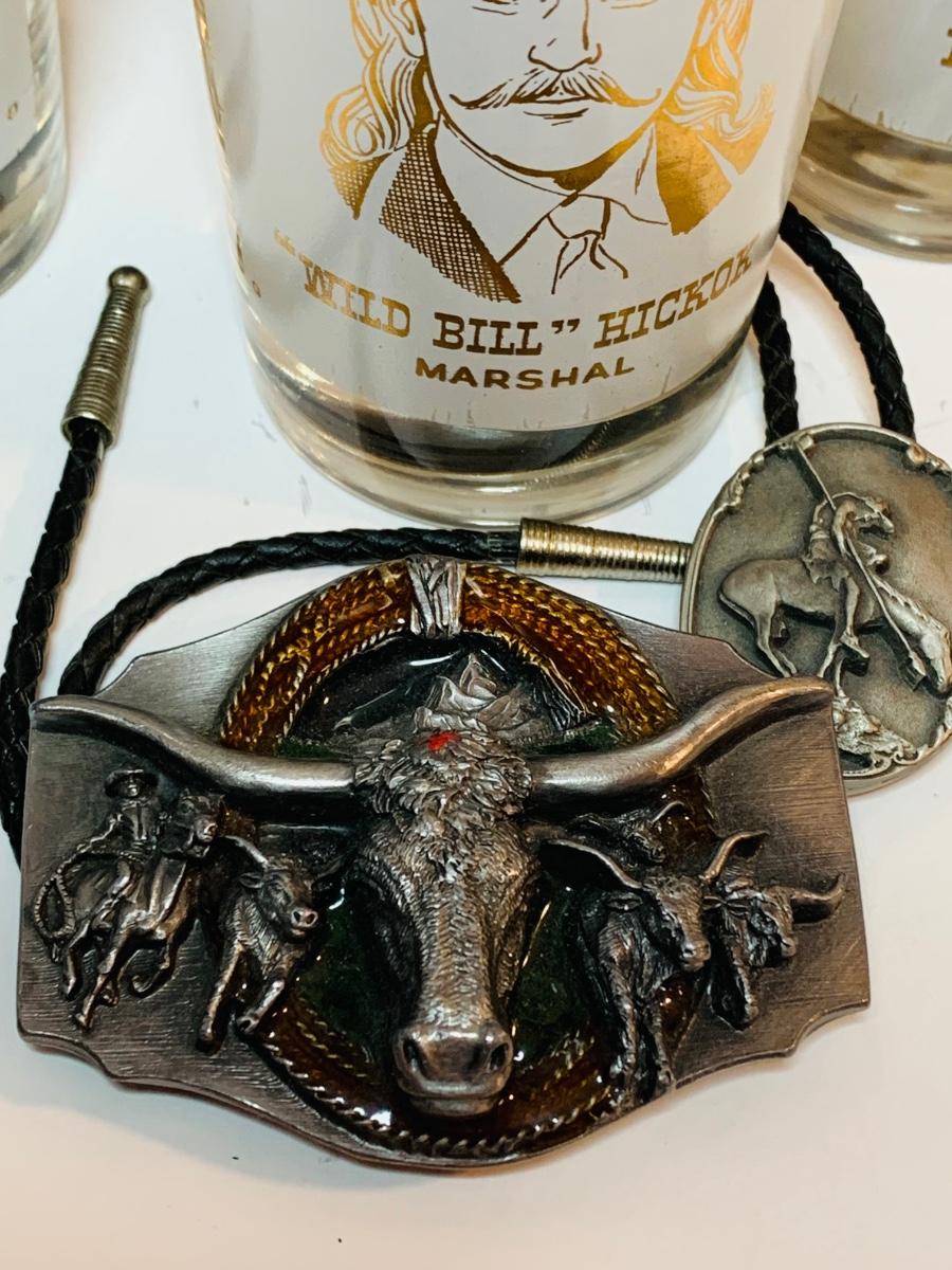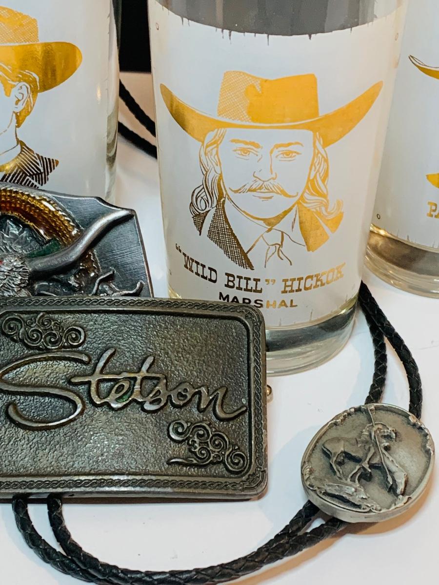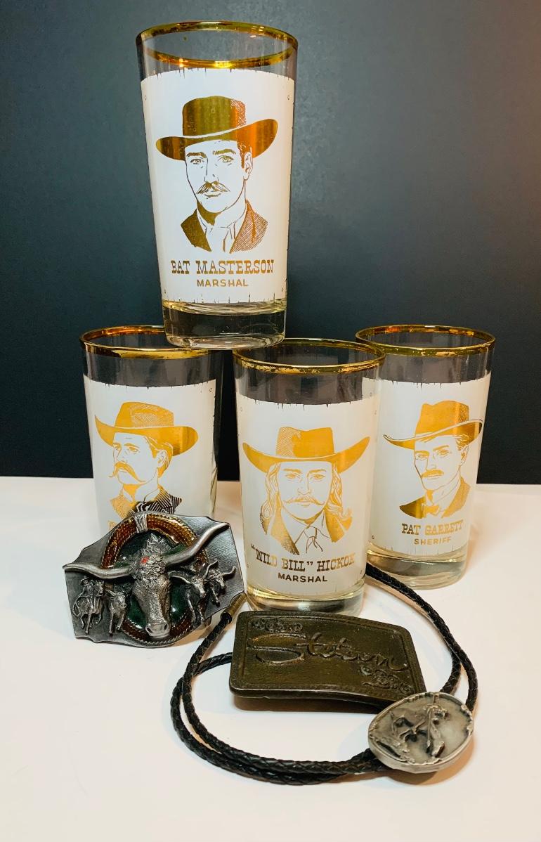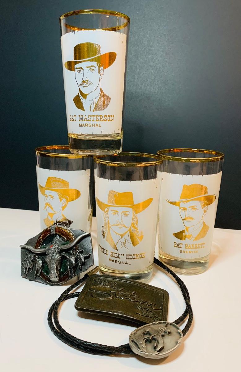Western themed collection including vintage glasses featuring "Wild Bill", Bat Masterson, Wyatt Earp & Pat Garrett, along with Stetson & Siskiyou belt buckles, and a Siskiyou Bolero tie....