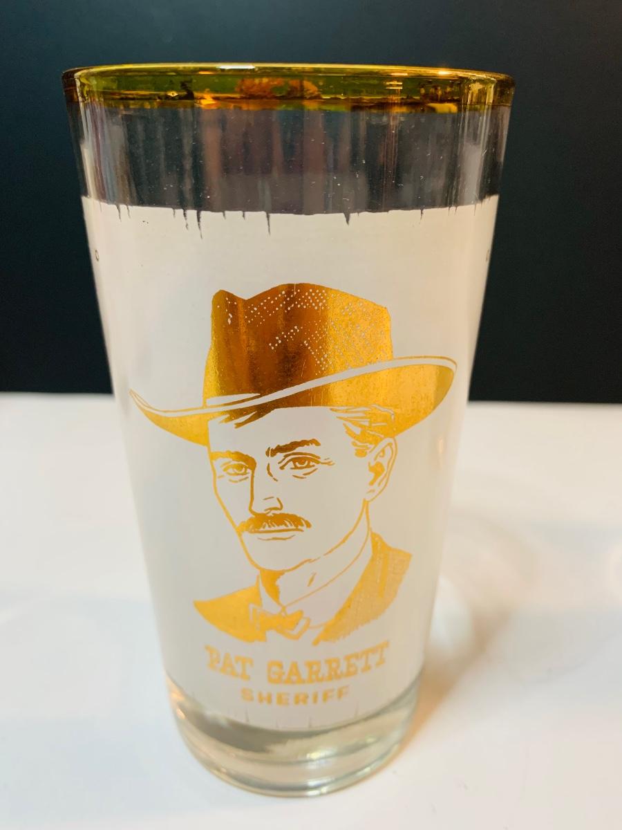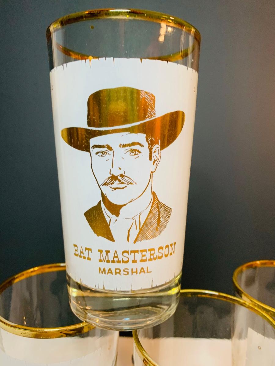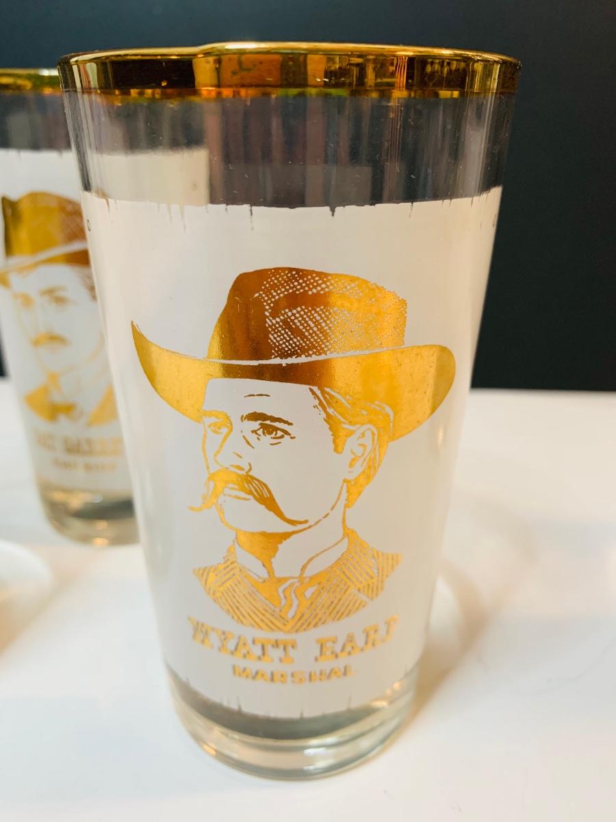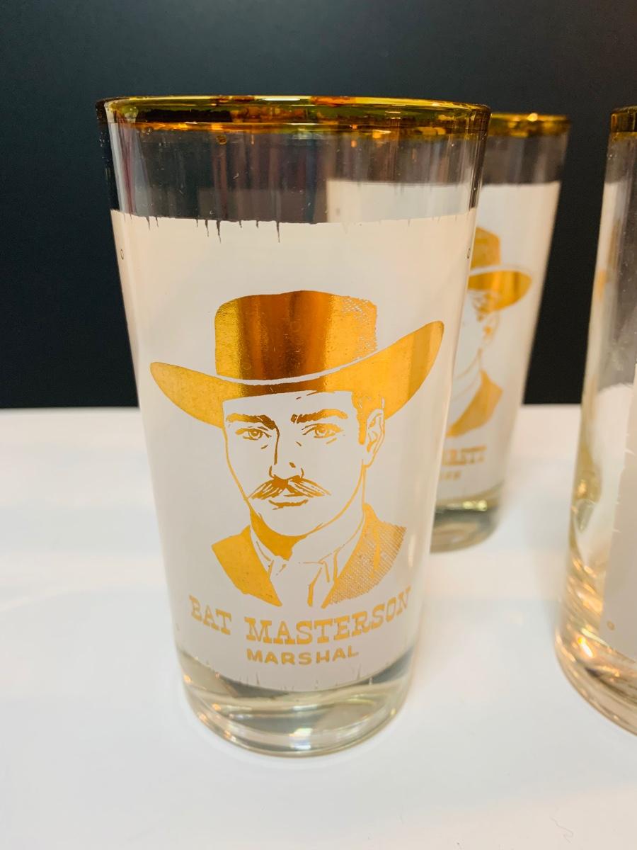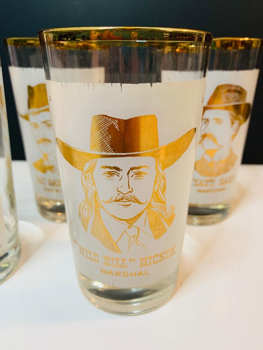 Western themed collection including vintage glasses featuring "Wild Bill", Bat Masterson, Wyatt Earp & Pat Garrett, along with Stetson & Siskiyou belt buckles, and a Siskiyou Bolero tie....