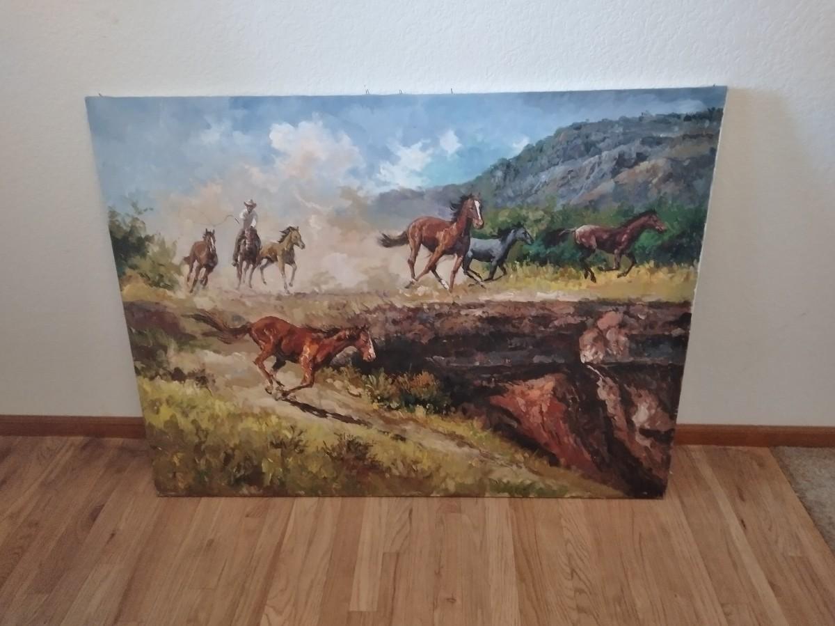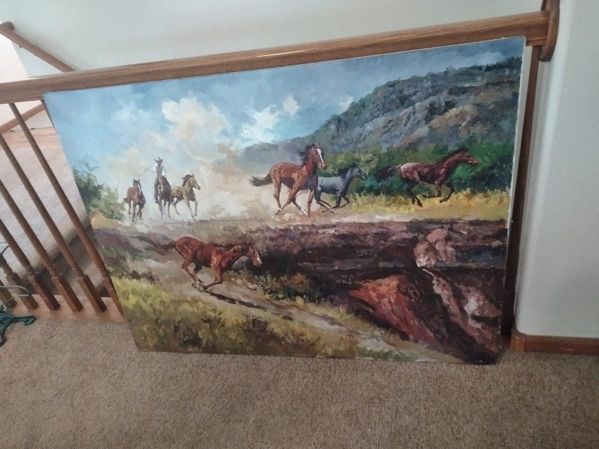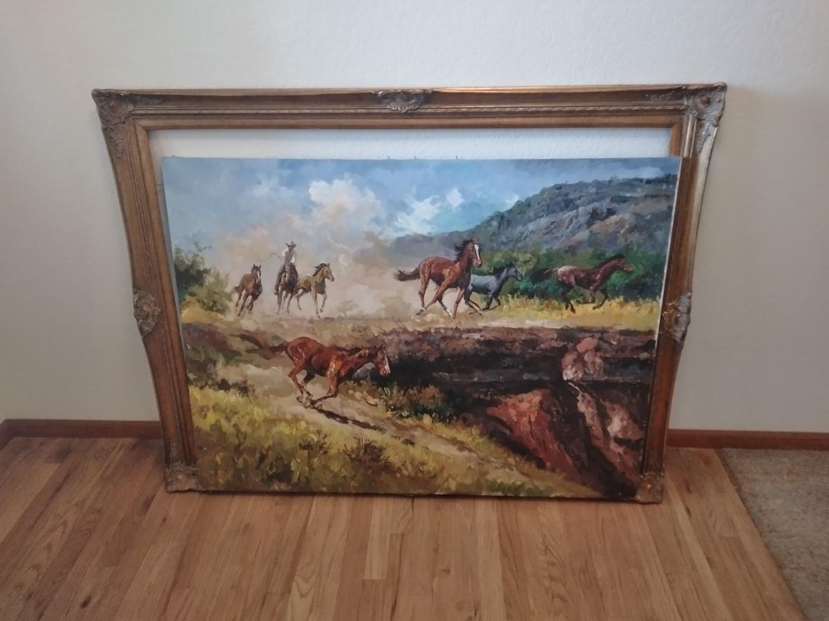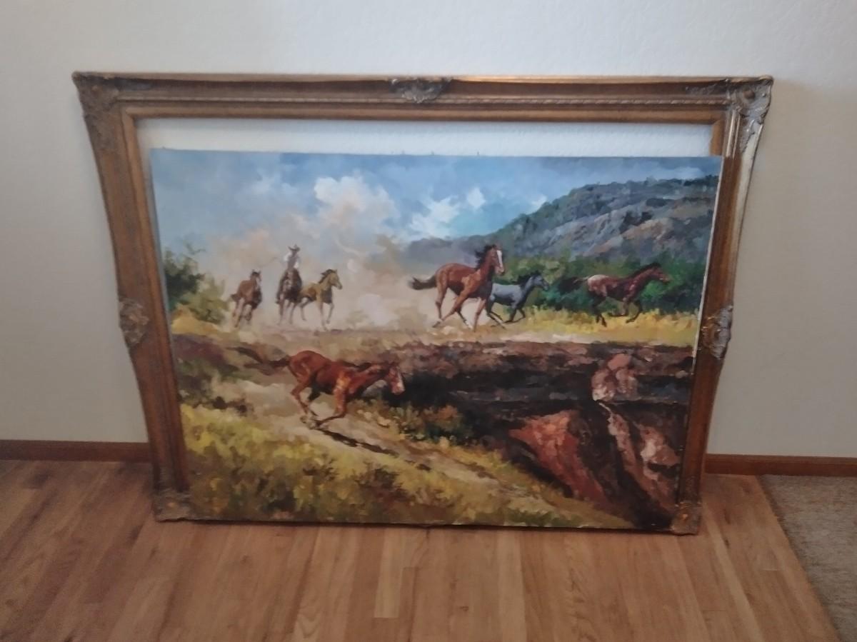 LARGE CANVAS HORSE ROUND UP PICTURE WITH GOLD FRAME 36" X 48"