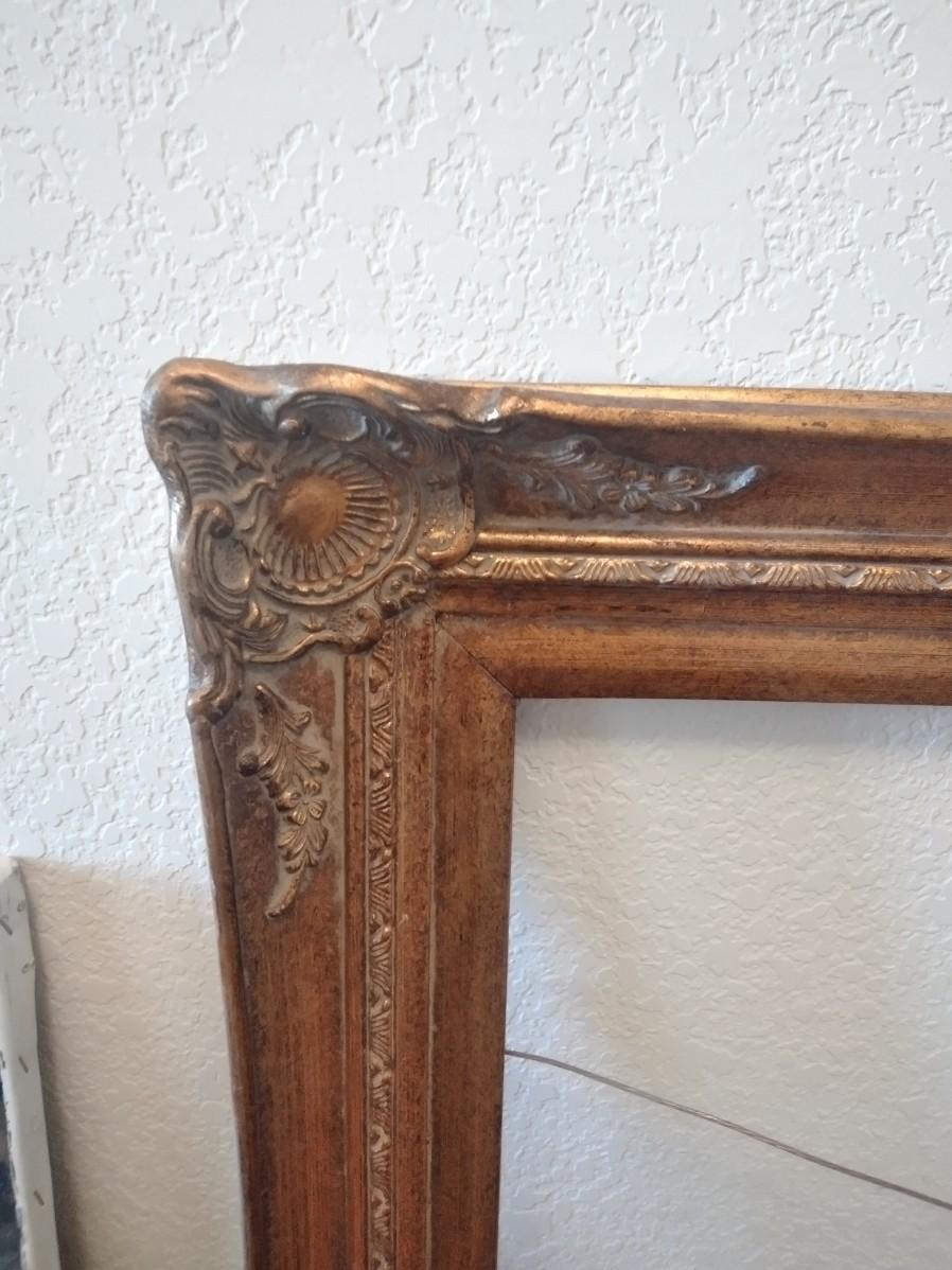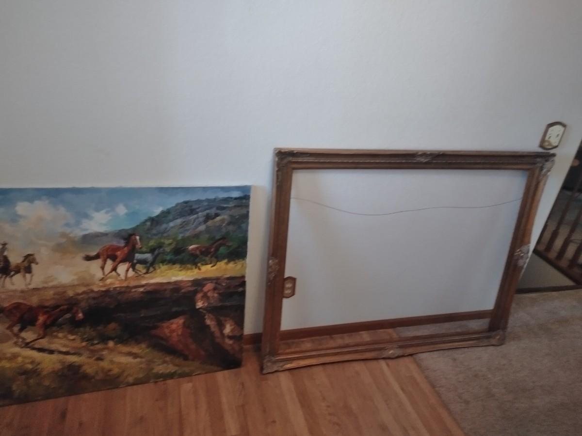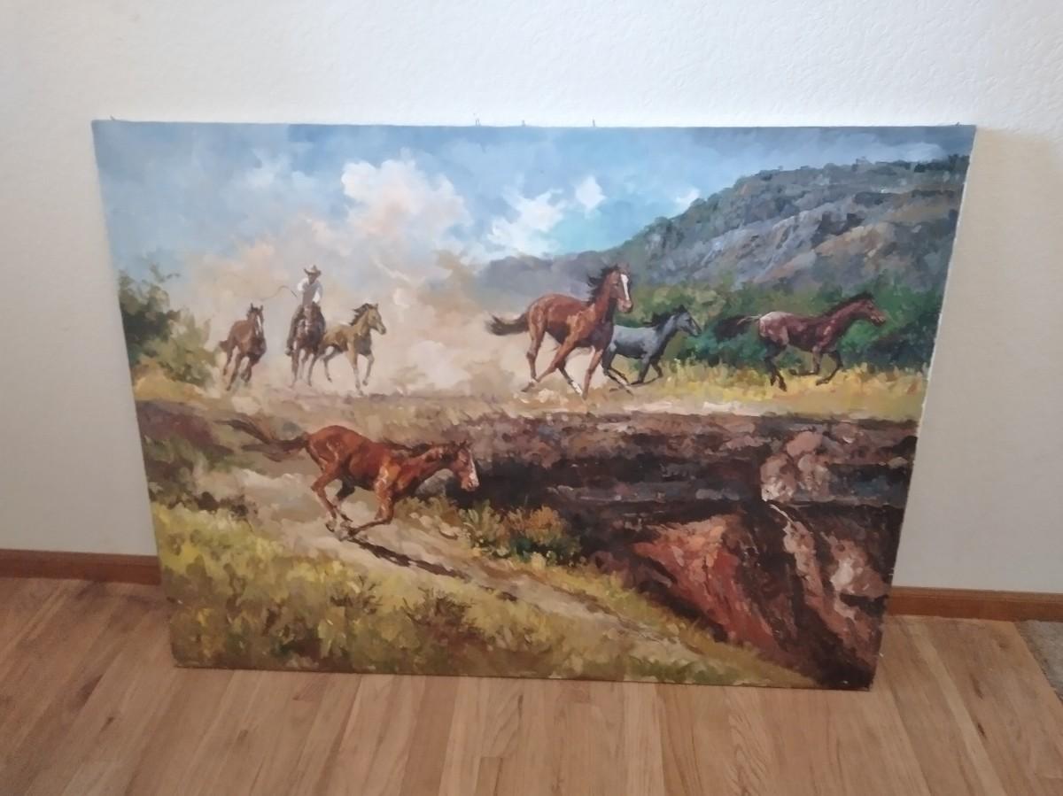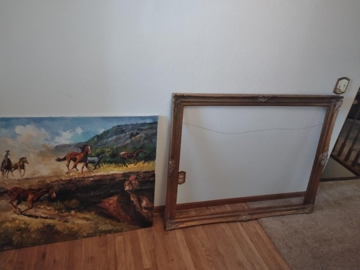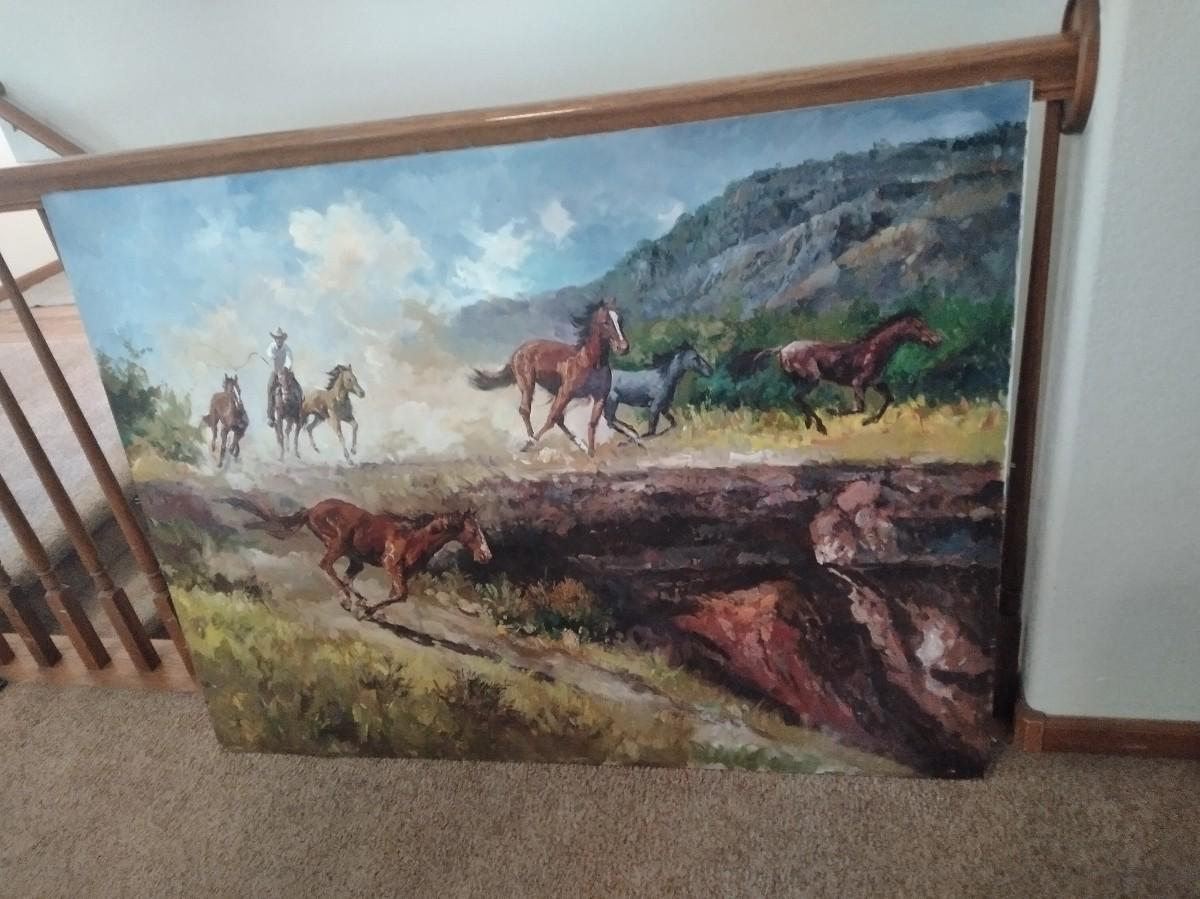 LARGE CANVAS HORSE ROUND UP PICTURE WITH GOLD FRAME 36" X 48"