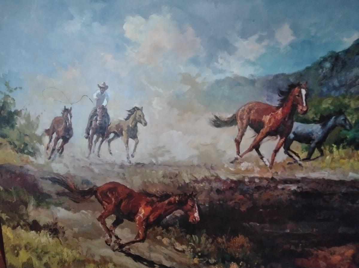 LOT 183 LARGE CANVAS HORSE ROUND UP PICTURE WITH GOLD FRAME