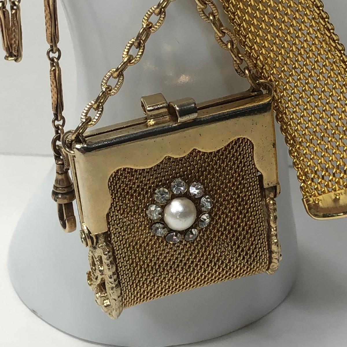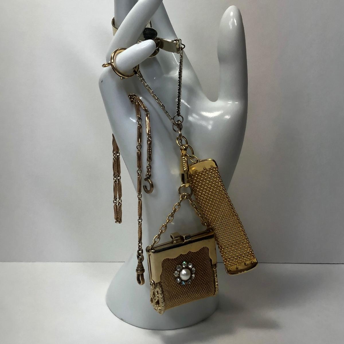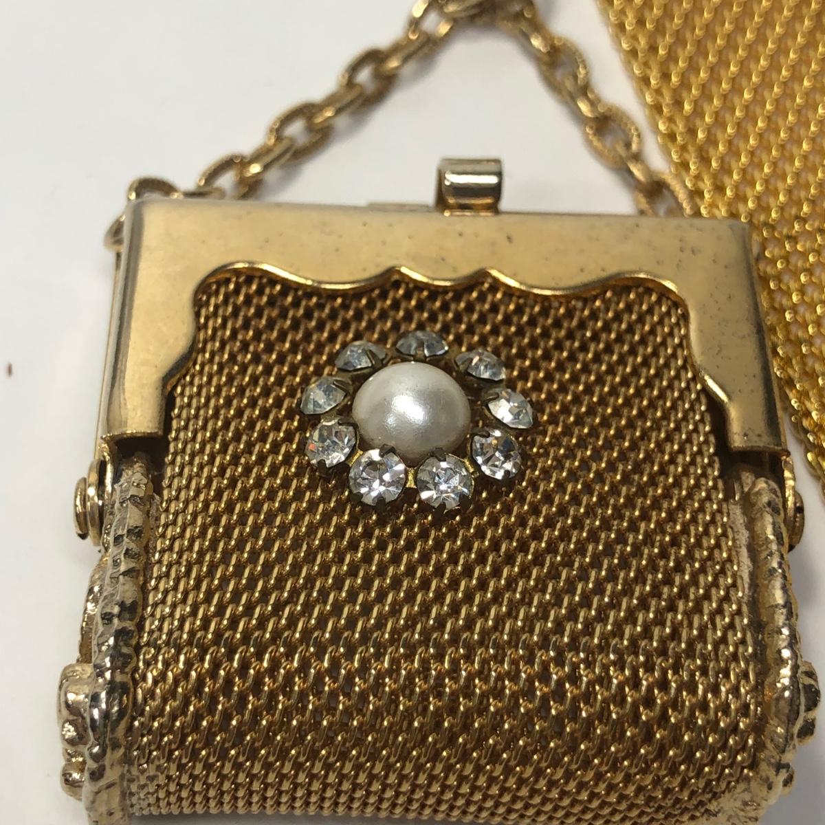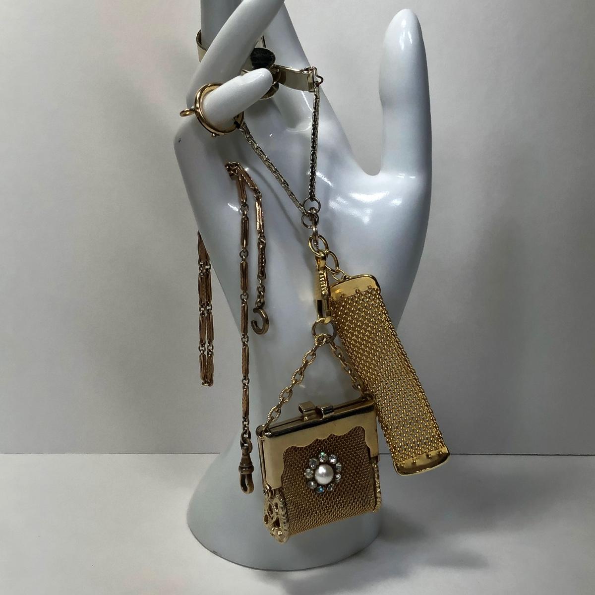 LOT 183: Vintage Mesh Coin Purse w/ Rhinestone & Faux Pearl Design, Mesh Watch Chain, Gloveholder & Gold Fill Watch Chain