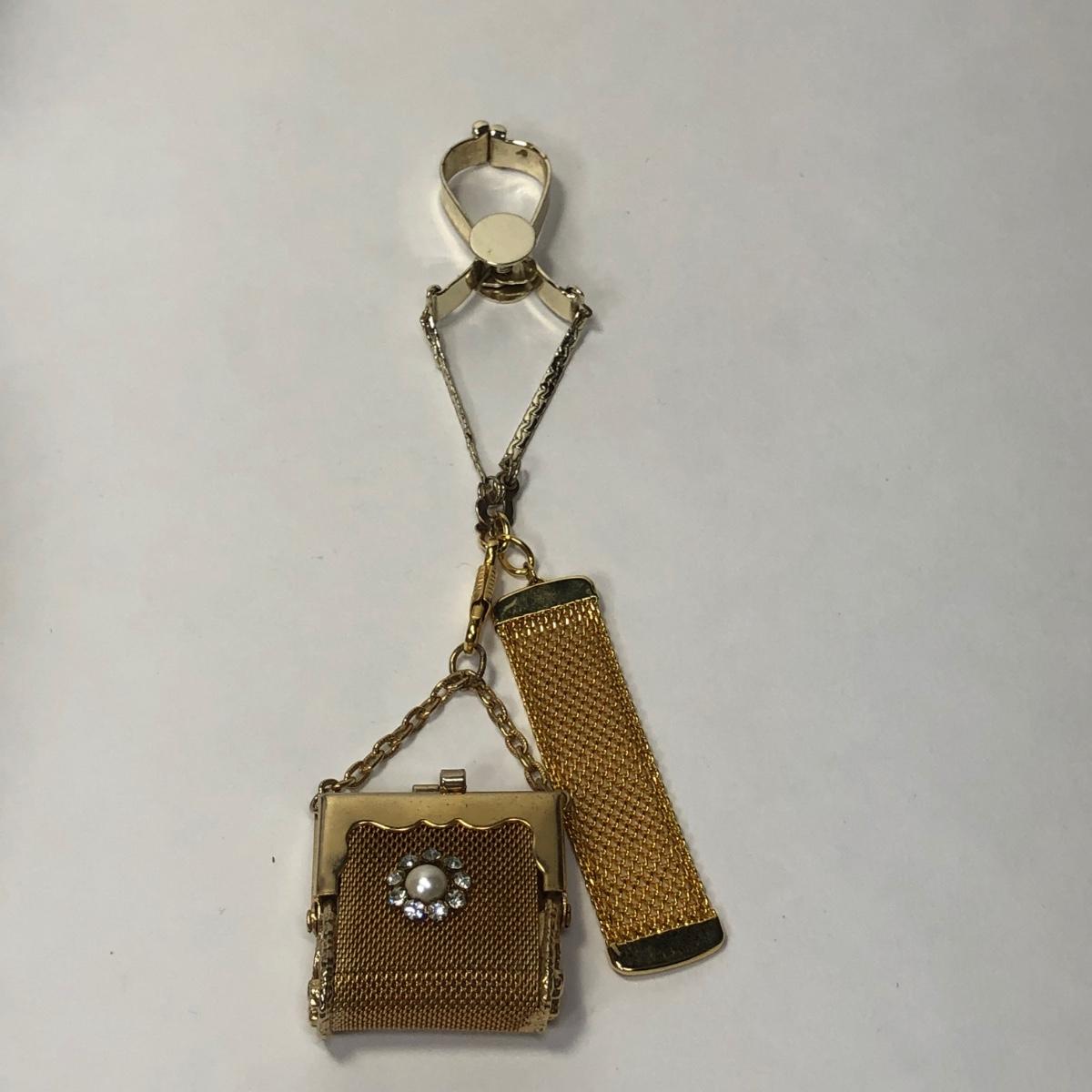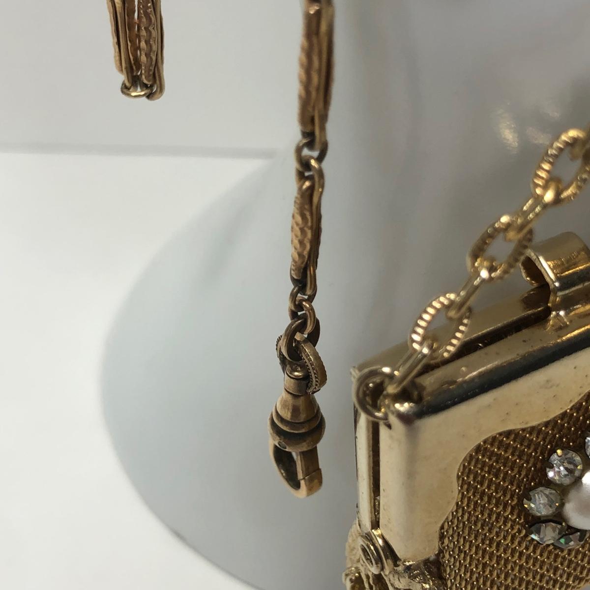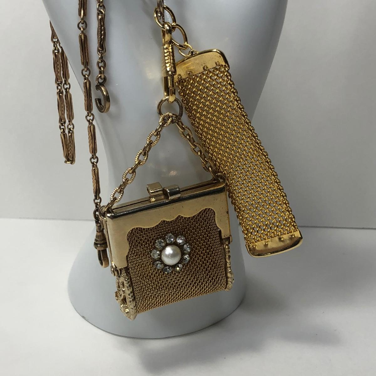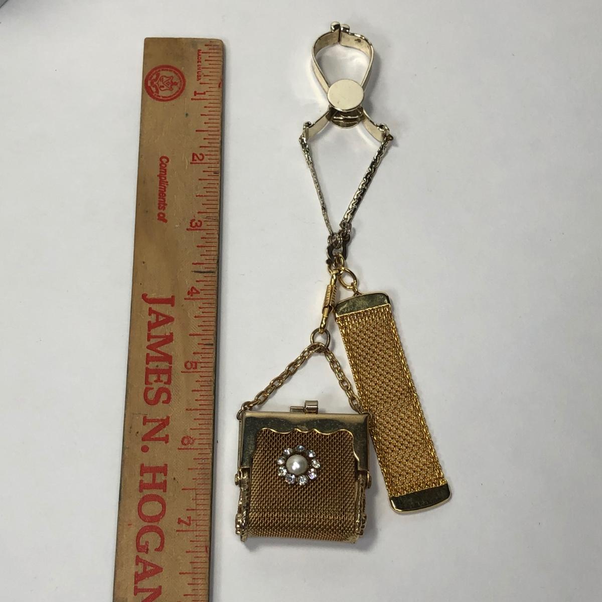 LOT 183: Vintage Mesh Coin Purse w/ Rhinestone & Faux Pearl Design, Mesh Watch Chain, Gloveholder & Gold Fill Watch Chain