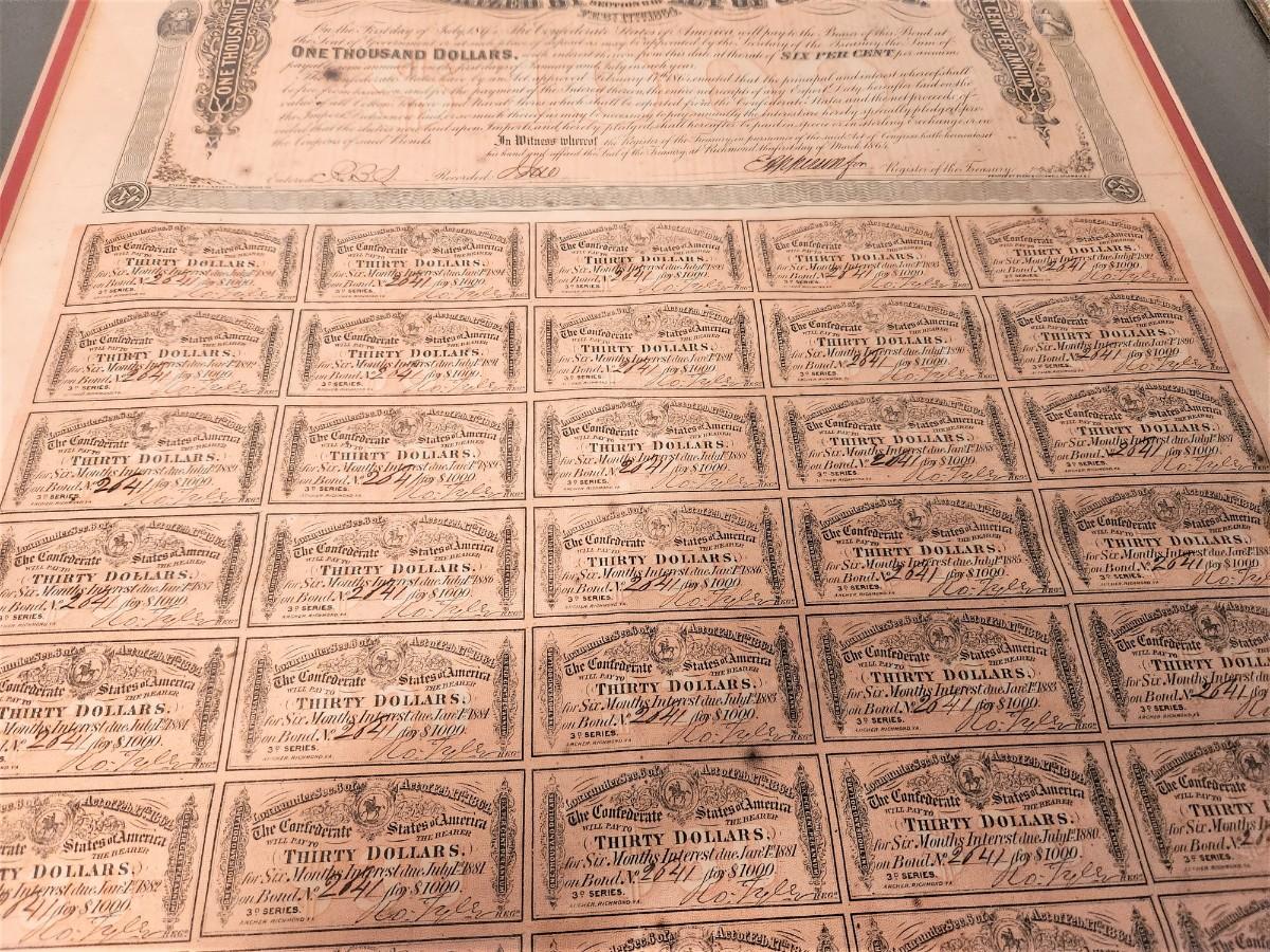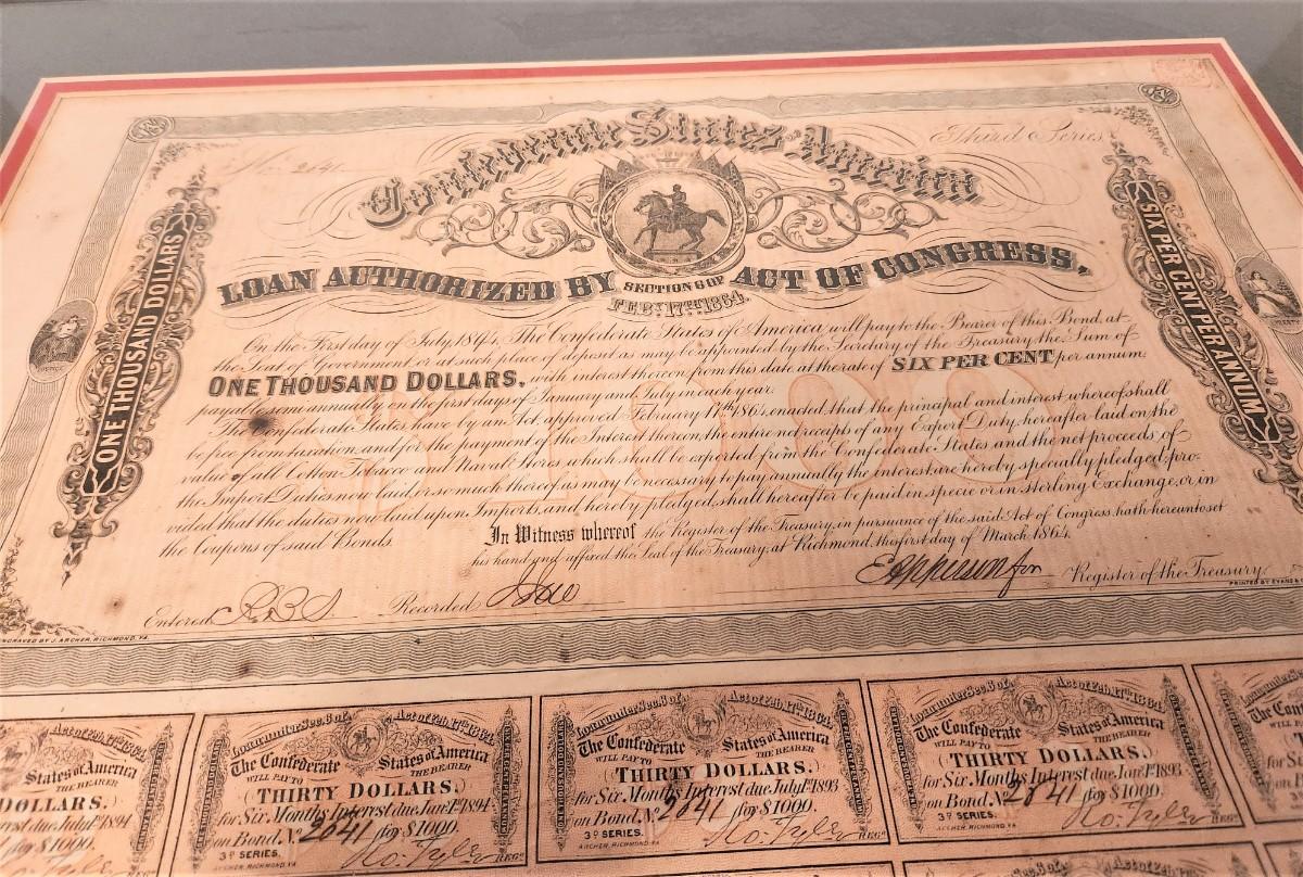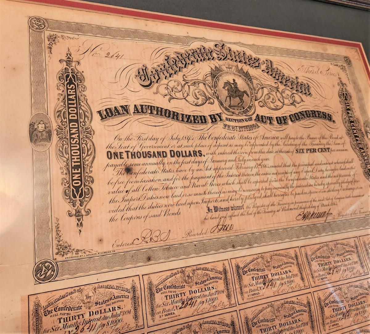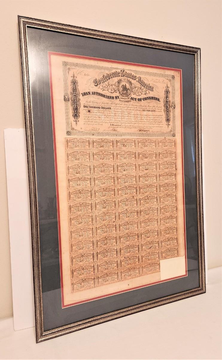 This is a real beauty - issued by the Confederate States of America late in the War, 1864, 3rd series - $1000 bond paying 6" interest. One 1 coupon gone, double matted, 34" tall, 23" across. Great antique condition.