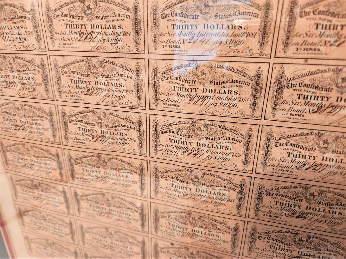 Lot #183 - A Piece of History - $1000 Confederate 3rd series bond - framed - only 1 coupon missing