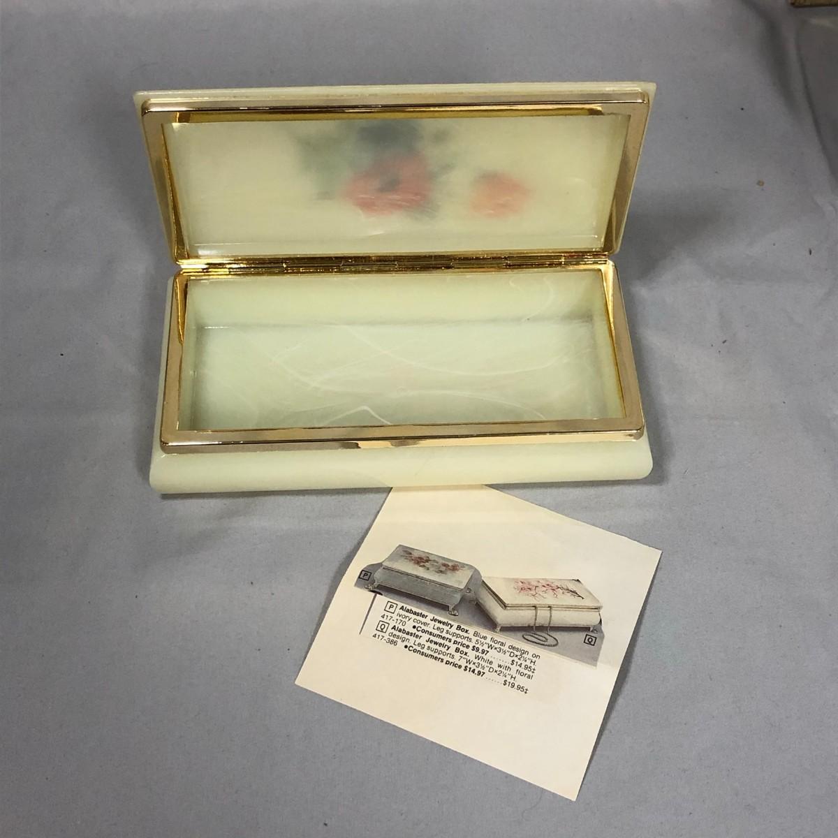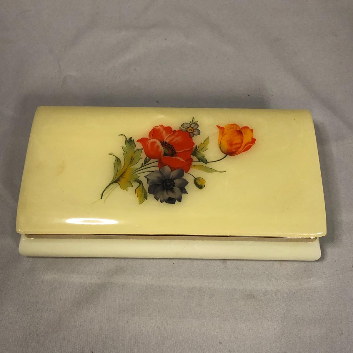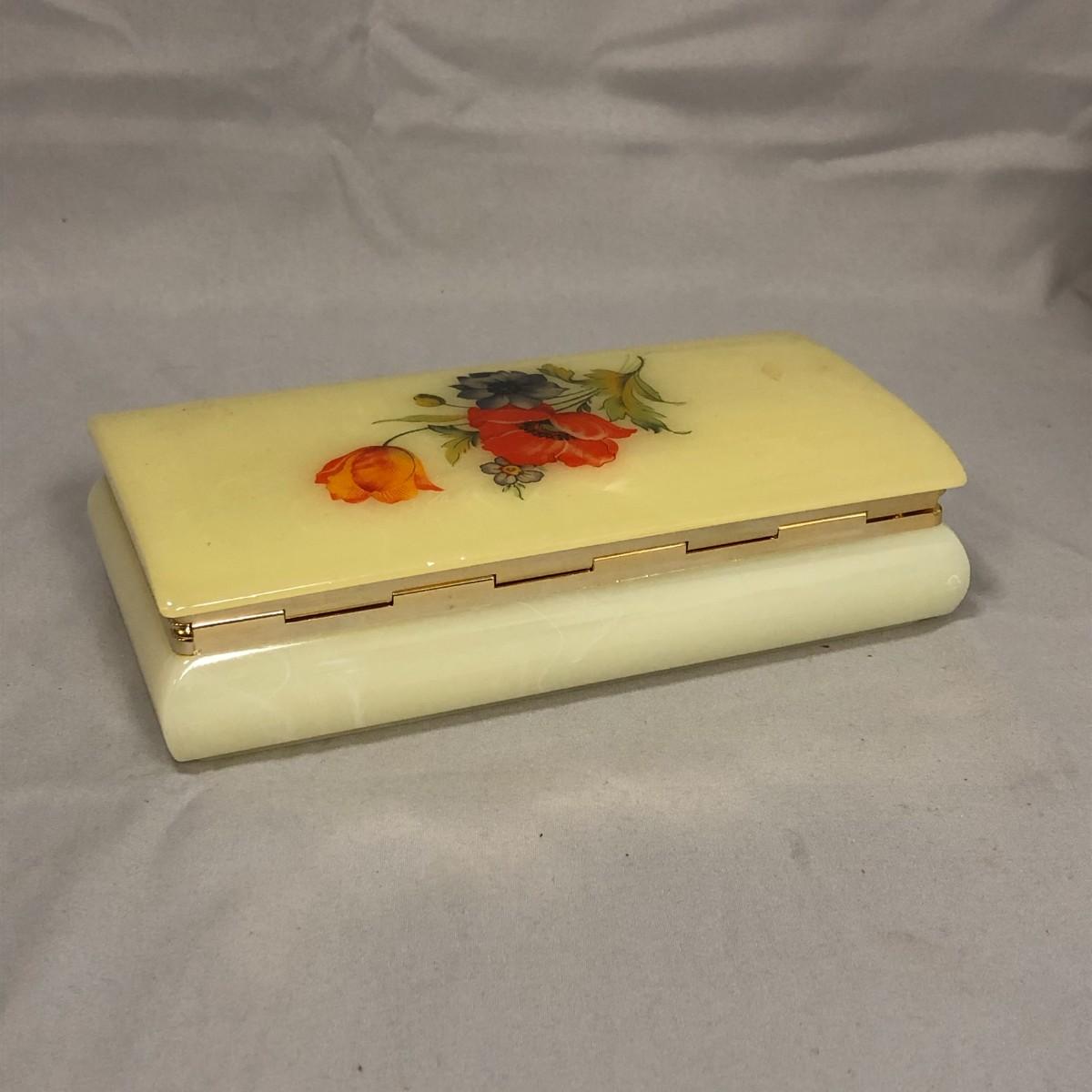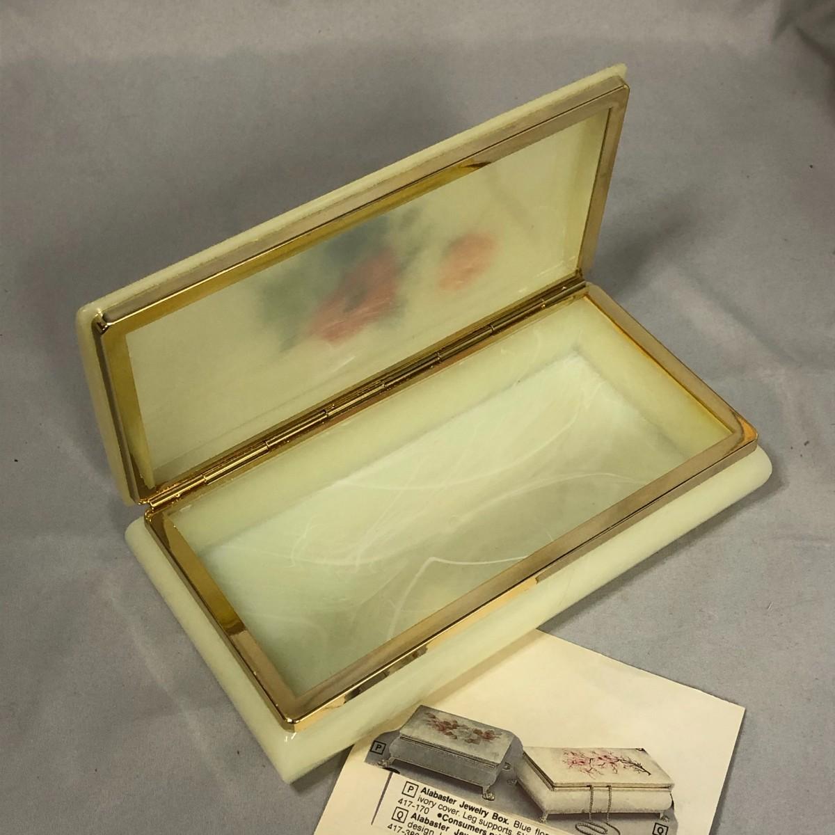 The adverts inside indicate that this is made from alabaster, but it doesn't have the weight and cold feel of stone, it seems to be resin. It is in excellent condition and measures 7.25" x 3.75".