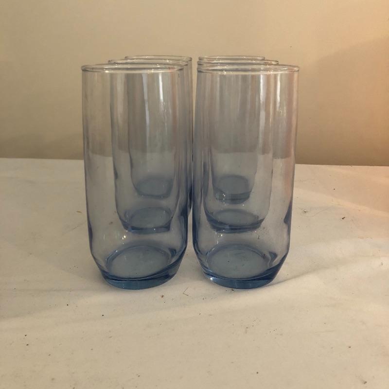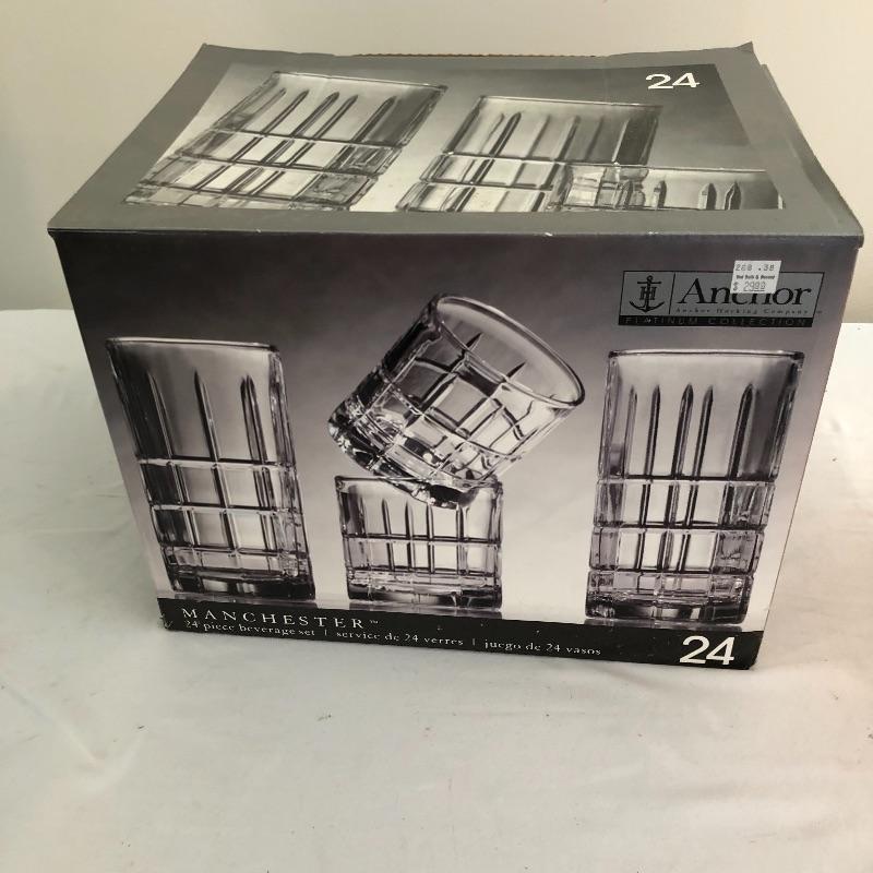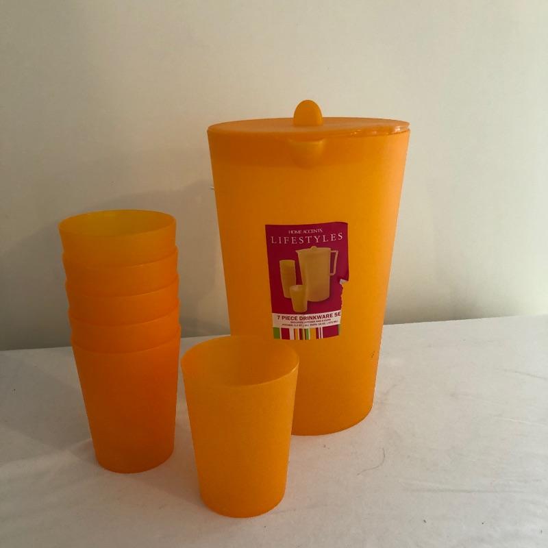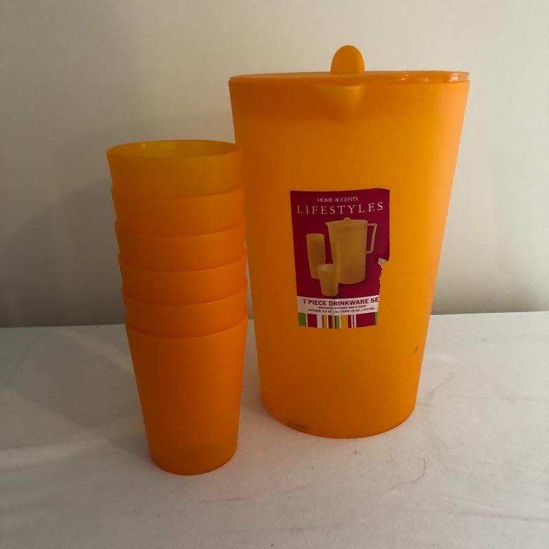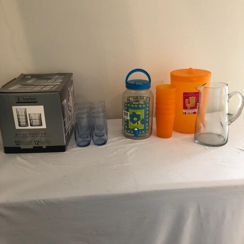 Get ready for a picnic or party on the patio with this array. Lot includes orange plastic pitcher with six cups, glass pitcher, twelve Anchor Hocking glasses, ice tea jug and six glasses with a anchor logo on bottom. Box of glasses says twenty four but there are only twelve.