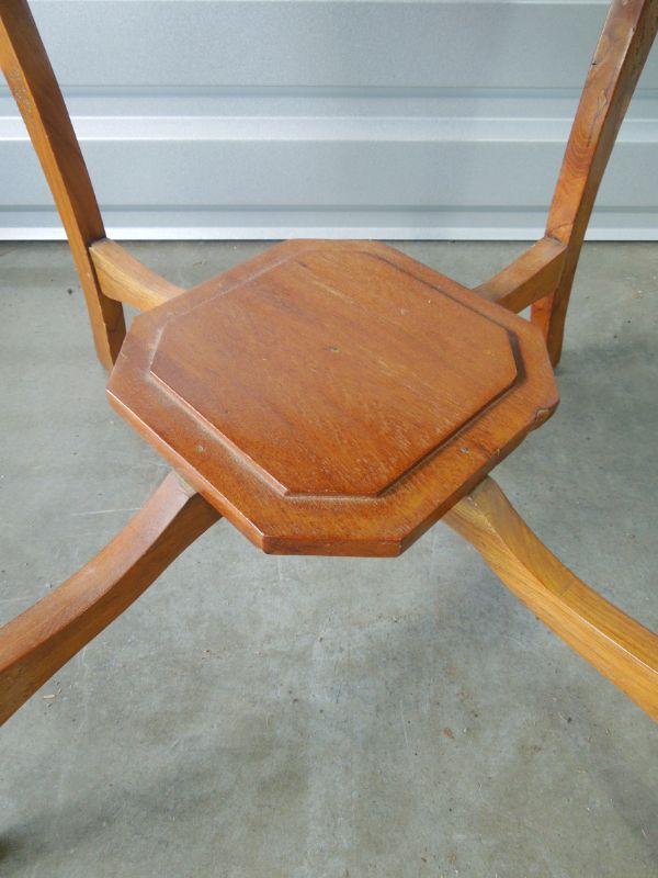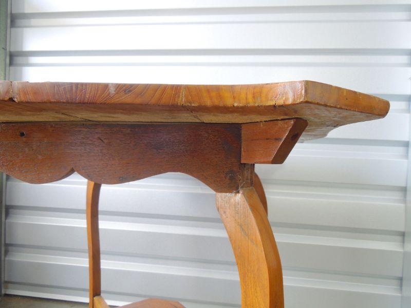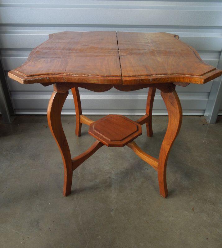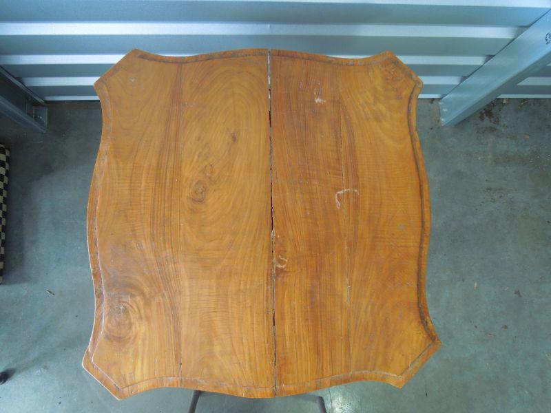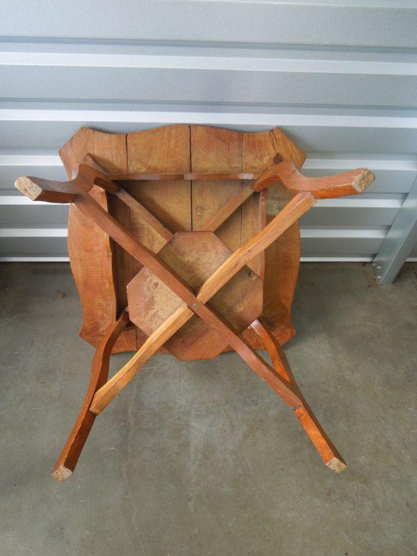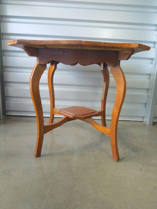 Features a serpentine breakfront table top and apron design. Stretchers support bowed legs with an insert bottom shelf. Coated varnish maple finish. 29" L x 29" W top. 26" tall. Top middle seam separated. Sturdy.