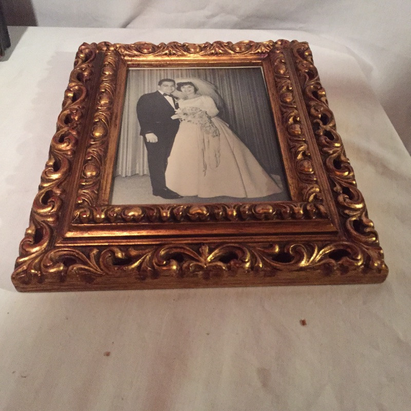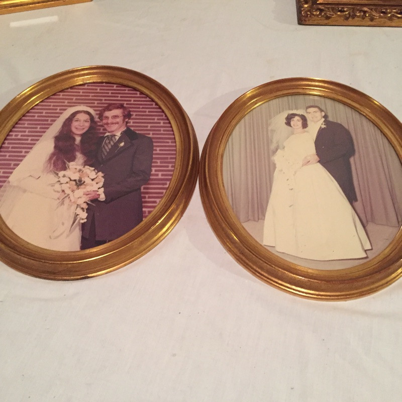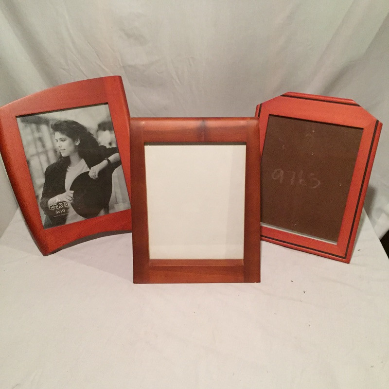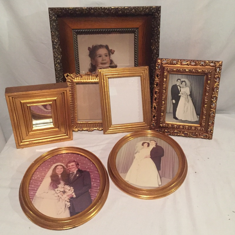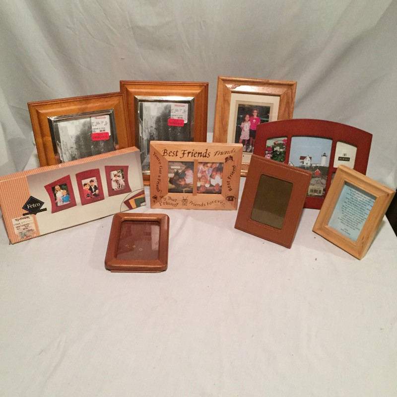 An assortment of picture frames here in a great range of sizes. See images for all the frames as many are gold colored or wooden and there is one smaller leather frame.