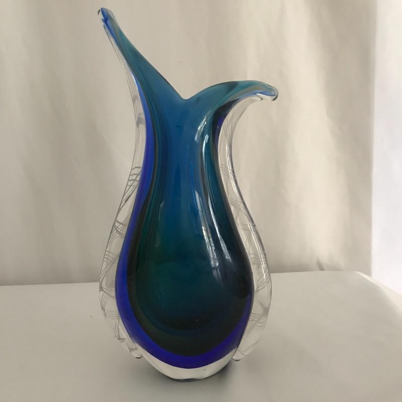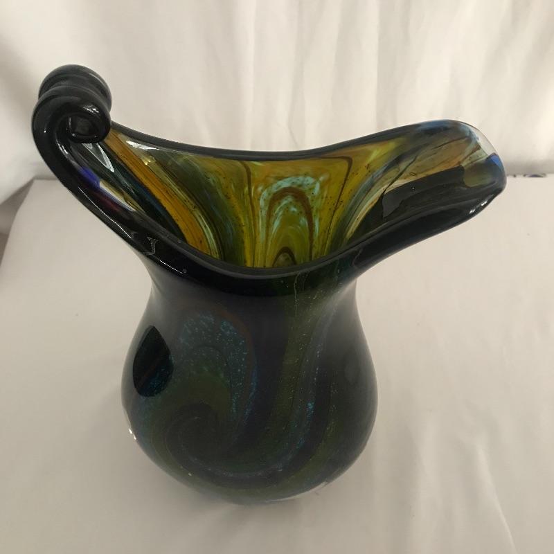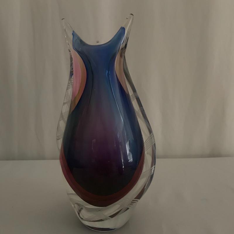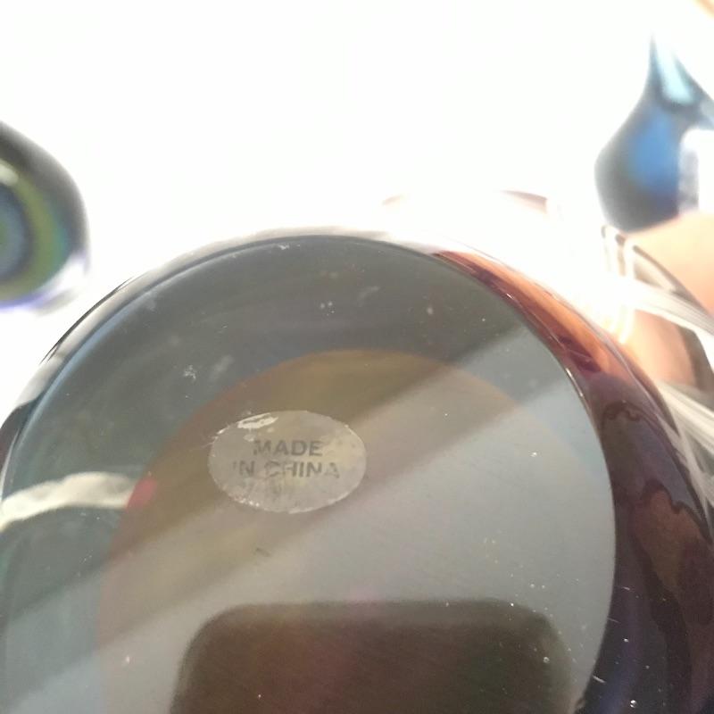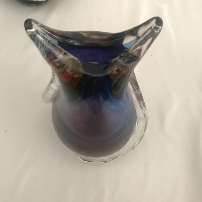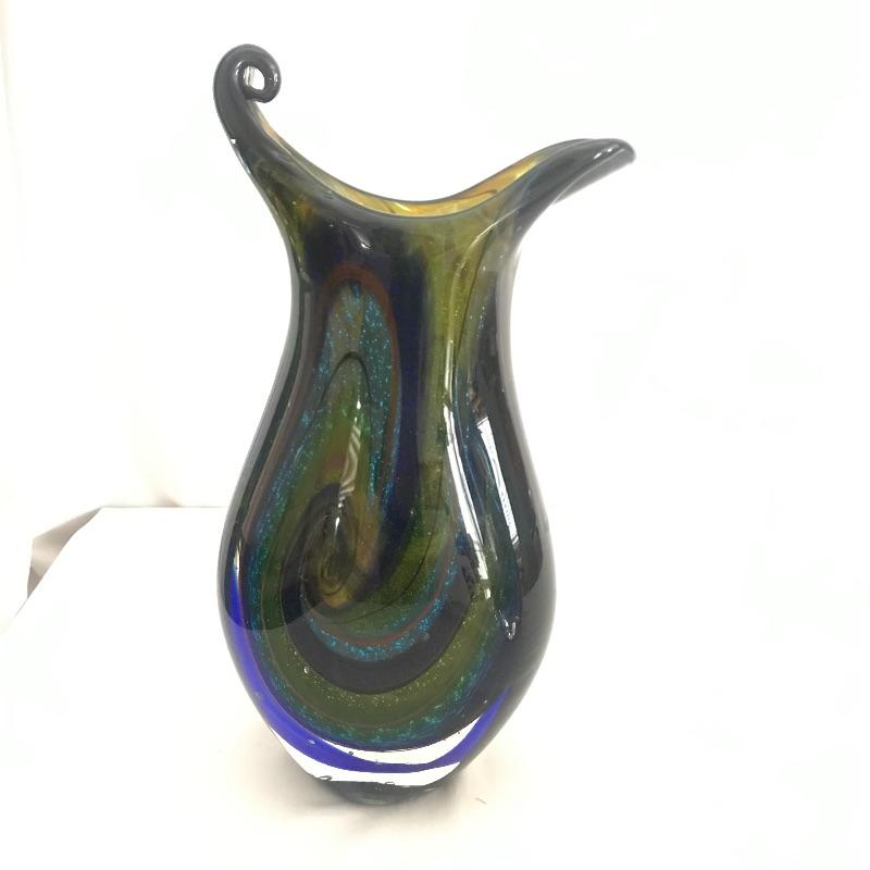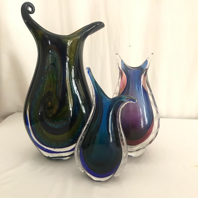 This trio of vases are really beautiful together but are not a set. The stickers on bottoms are different. They are quite heavy and largest one measures 16”. 8”. Colors include, blues, greens, purple sand shimmer. Shipping available but be aware it will be costly due to weight.