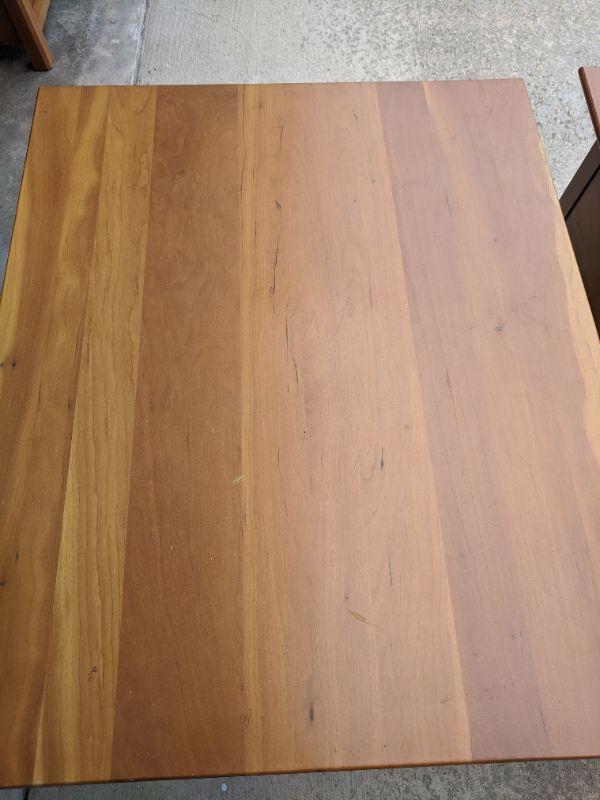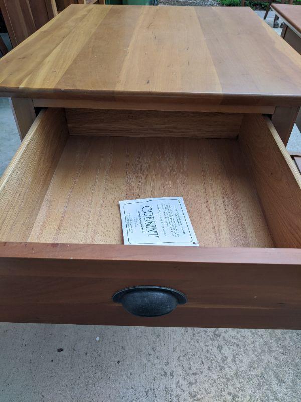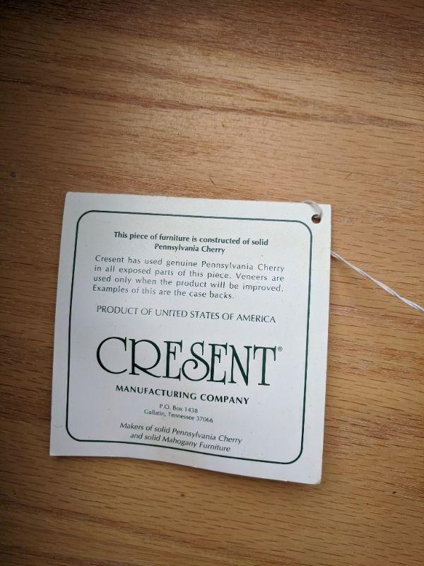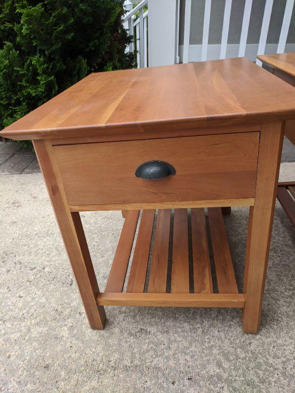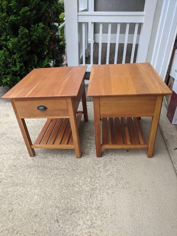 A cute pair of cherry wood twin side tables. These tables are Crescent from Philadelphia and would be perfect next to a bed or couch. Both have drawers and shelf. The measurements: 2'3" length 1'10" width 2' height. Reference lots 179 and 184 for other Crescent pieces for a complete set. No shipping.