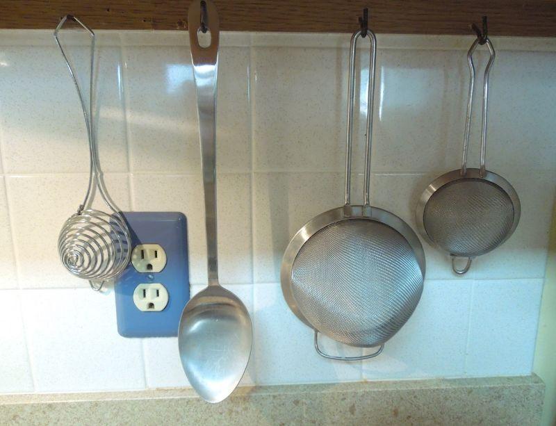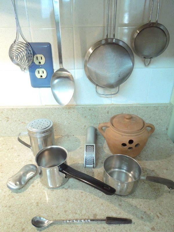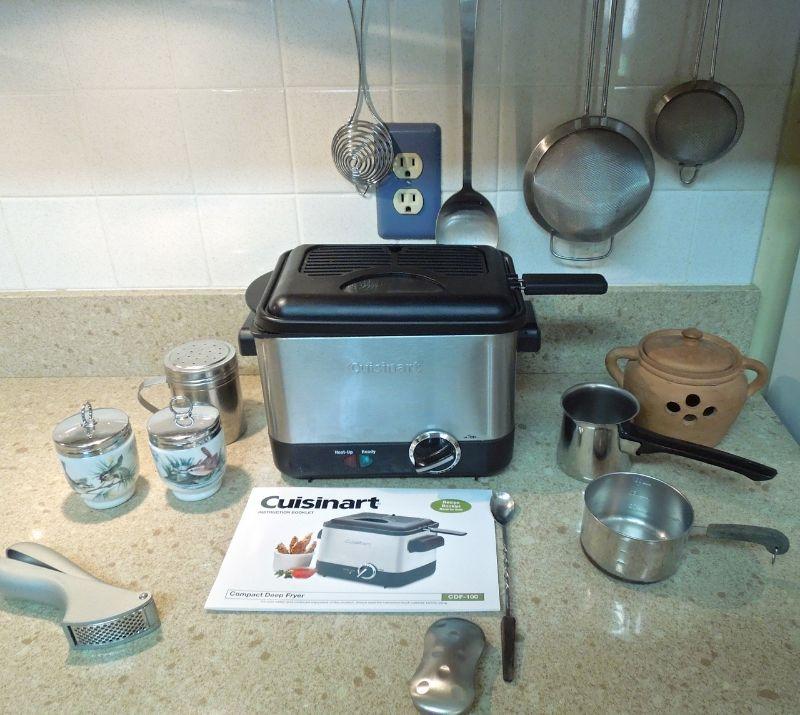Cuisinart model CDF-100 deep fryer with basket; two vintage Royal Worcester porcelain egg coddlers with birds; a metal garlic press and clay garlic keeper; 2 miniature sauce pans; a wire stainer whisk; two stainless strainers and a stainless salt or herb shaker.