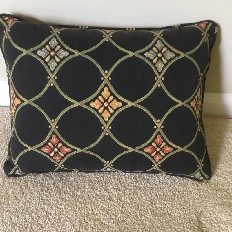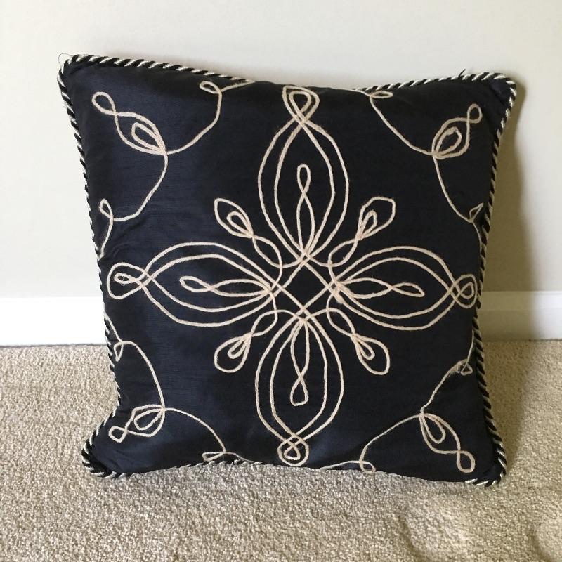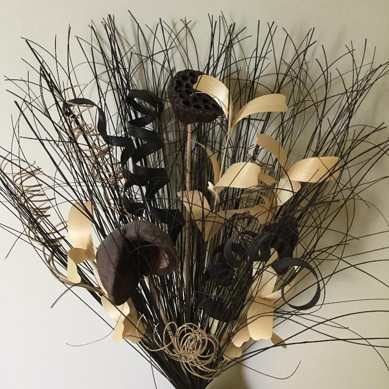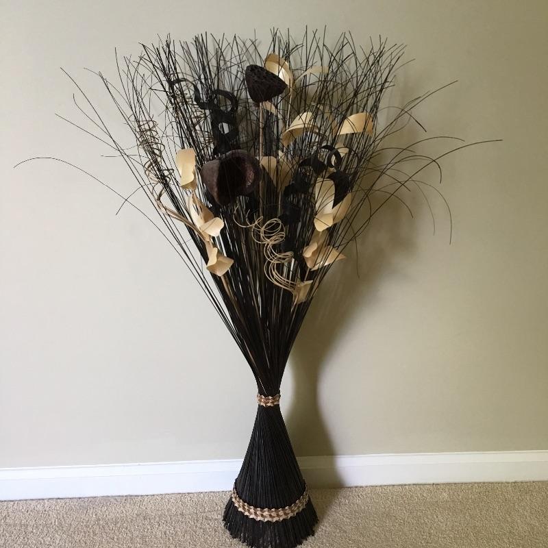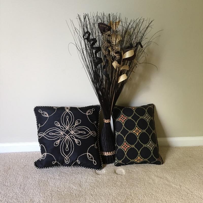 Pair of dark pillows with mesmerizing dried ting bundle. Bundle measures 34” tall with a 7” D base.