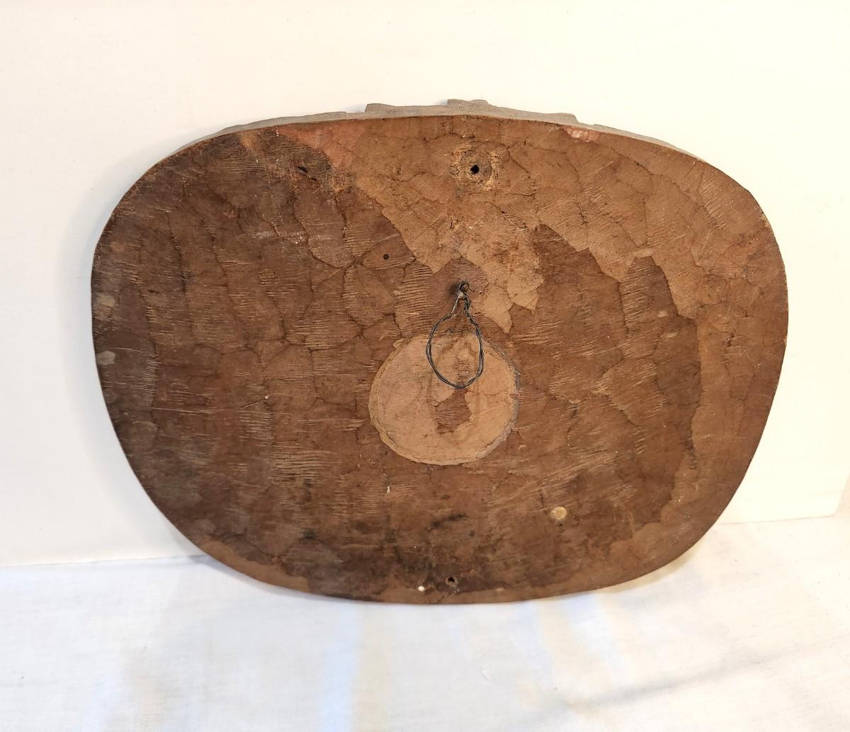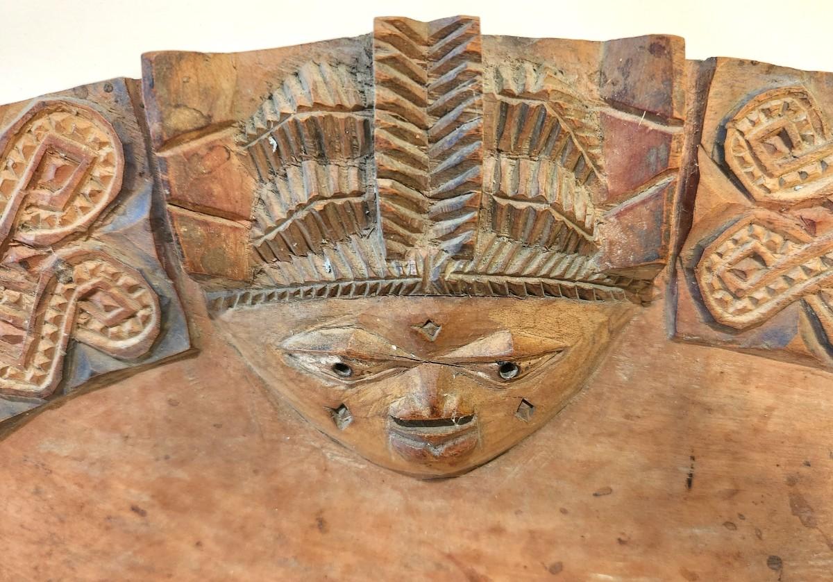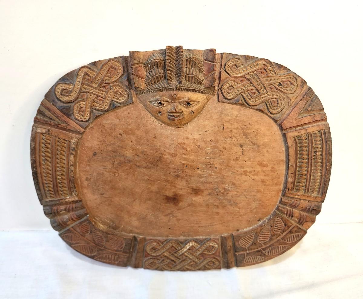This wonderful carved Nigerian tray is used as a Divination or Fortune-telling board, sometimes called an Opon Ifa. Made of Yoruba wood. Face of ESHE carved at the top - he is considered the messenger of Ifa (deity) and other spirits - carving radiates out in a variety of abstract geometric forms. The Babalawo, or the Diviner, uses it to communicate with the Spirits - he spreads Cassava Flour onto the tray and using palm husks, made predications or recommendations. Antique condition with usual wear due to use. The Art Institute of Chicago and the Dallas Museum of Art have very similar pieces in their collections. 15" across, 12" tall.