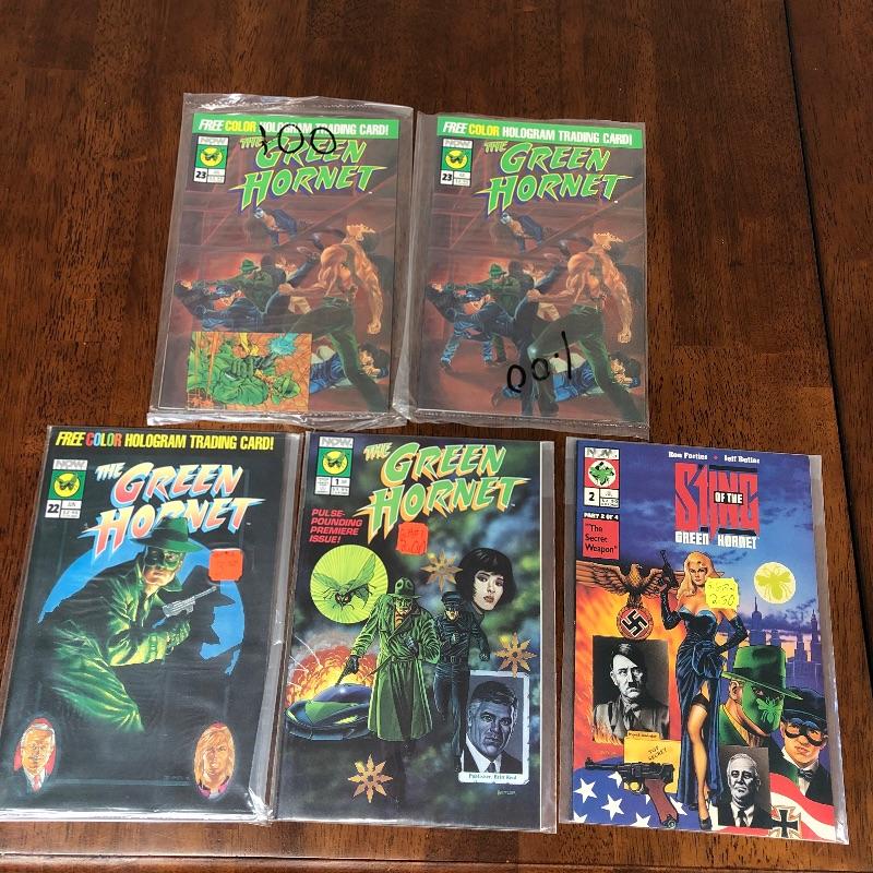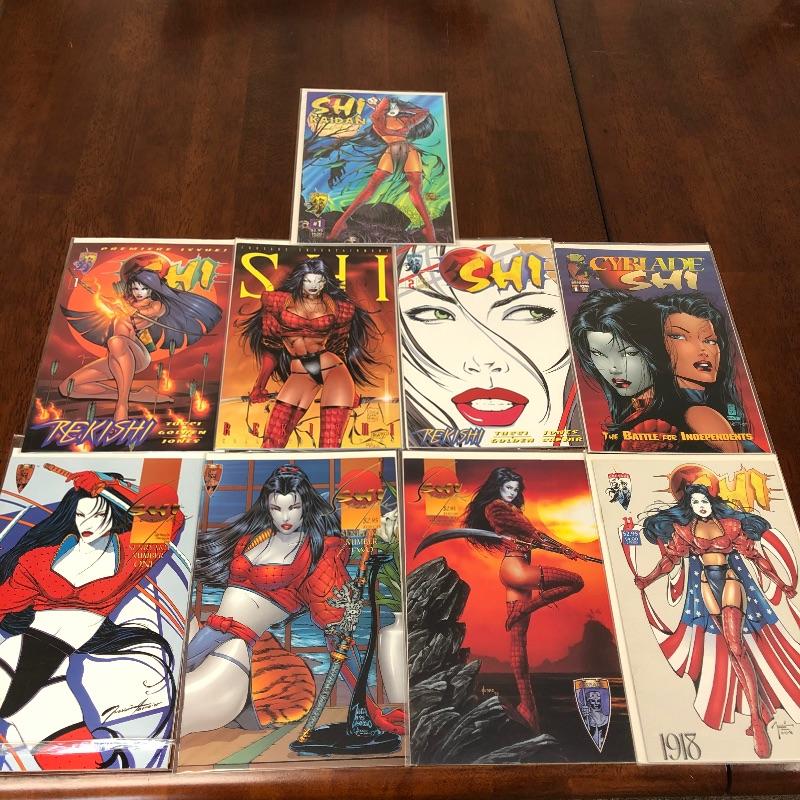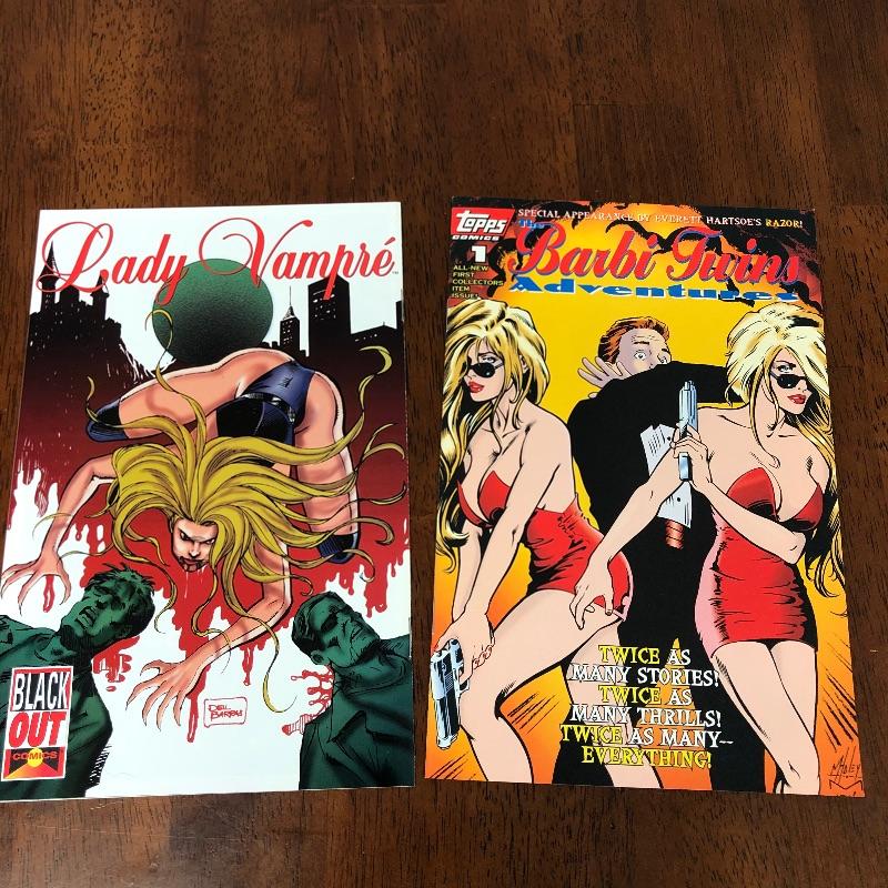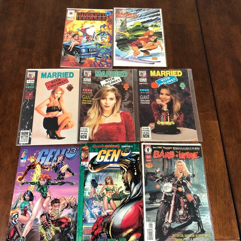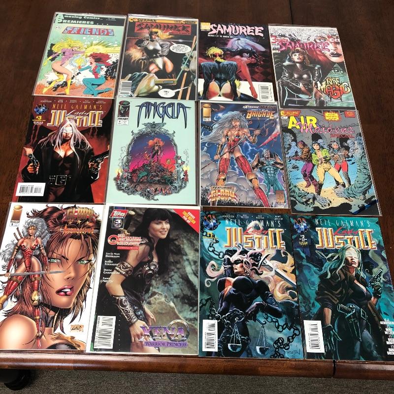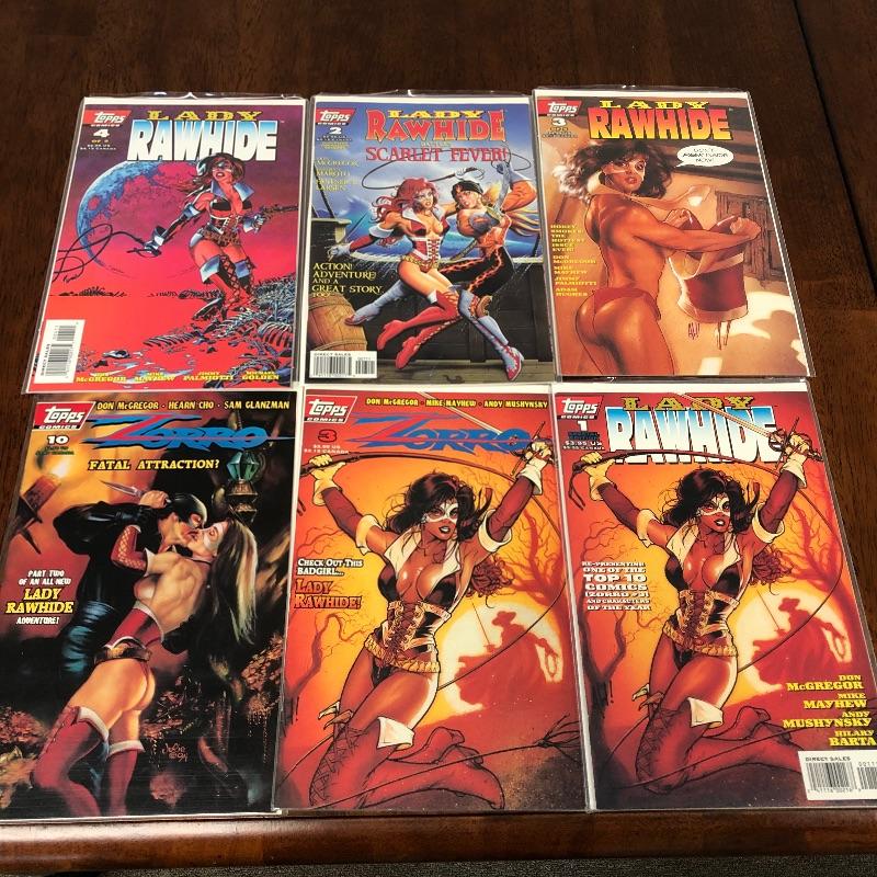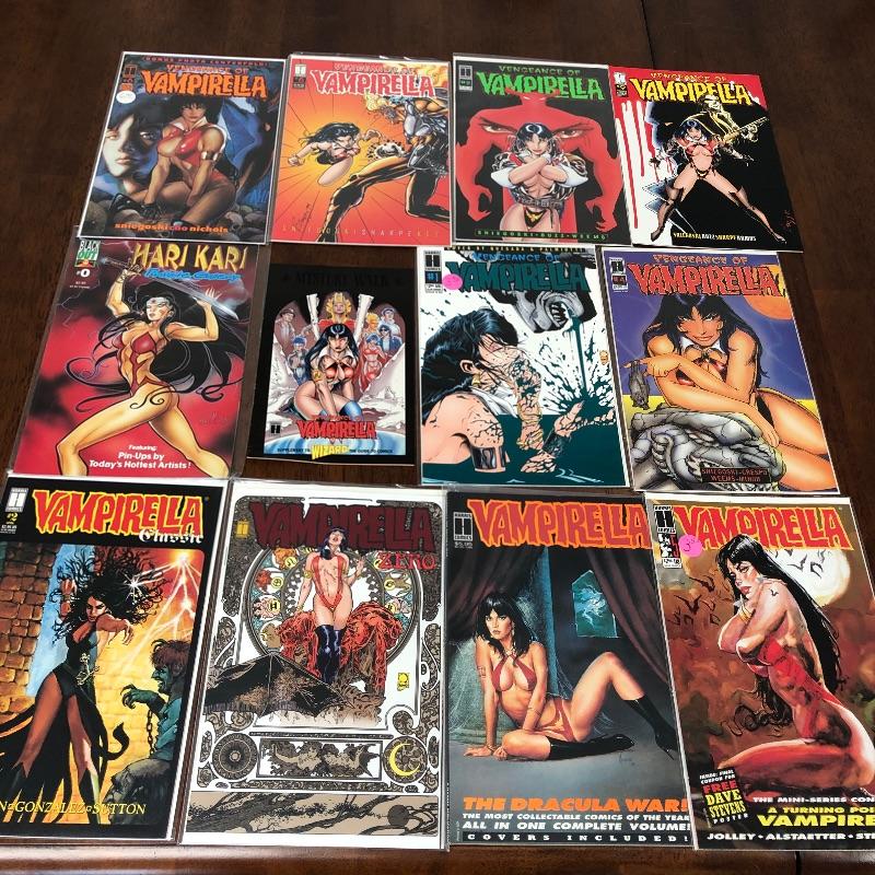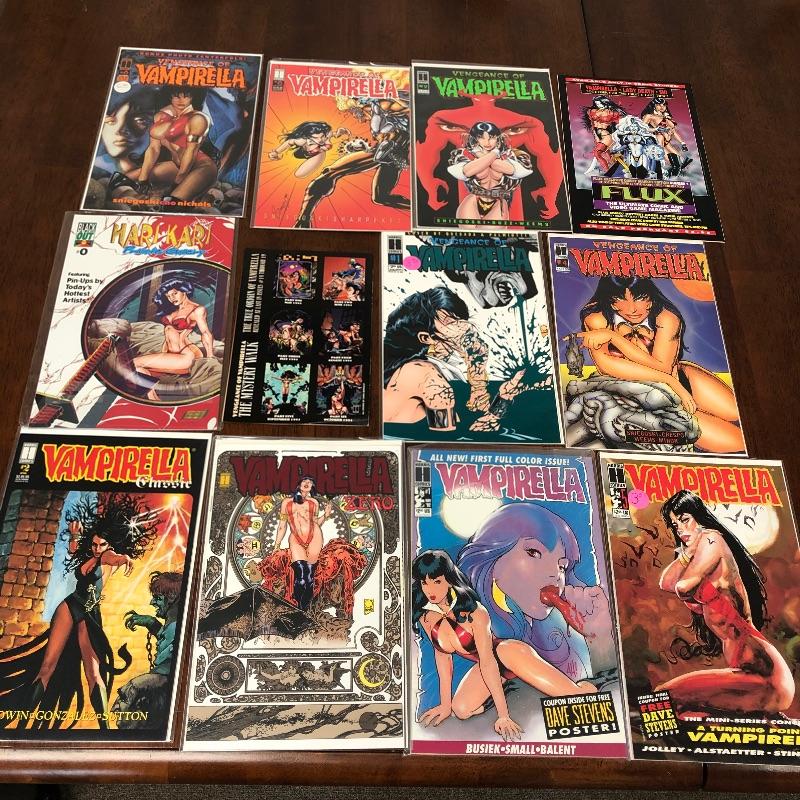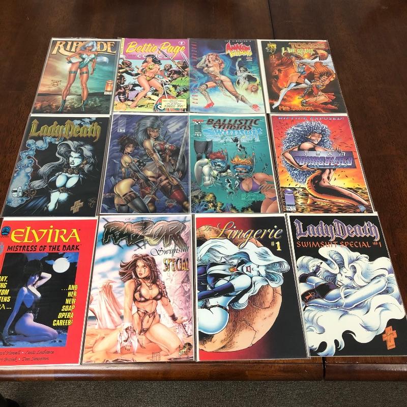THis collection of comics is focused on the Fantasy Genre with movie supported selections like Vamiprella, Elvira, Zorro, Barb wire and Avengelyne. Comic focused selections like Ultraverse, Valiant, Green Hornet, WILD CATS, AirBoy, Mike Danger and Tomoe are found in this lot as well as the more artistic ones like She, Ghost, Bettie Page, Lady Death, Glory and more. This selection would go great with the collector card versions in lots 65 & 66.