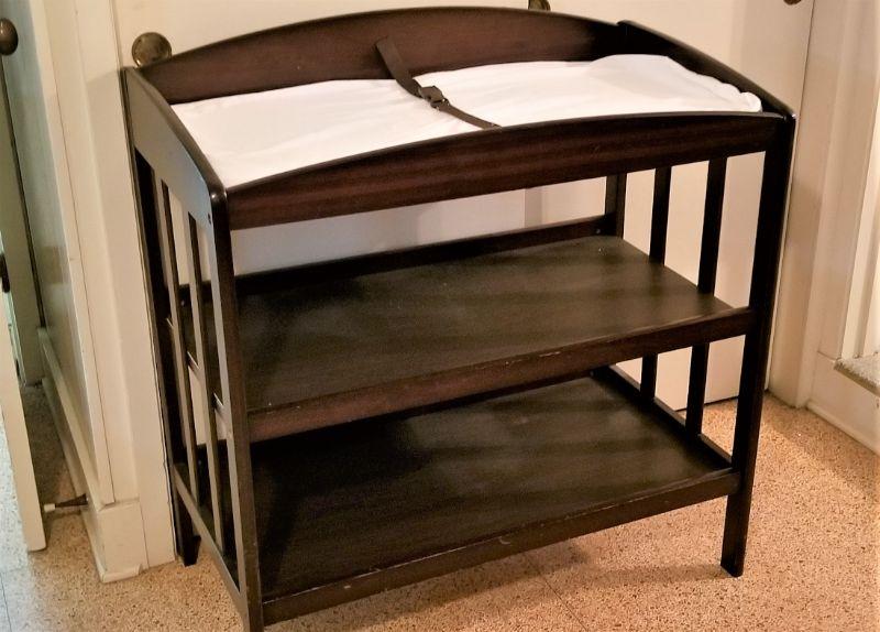 This gently used diaper changing table has a dark cherry finish - two shelves for storage. 20" deep, 36" tall, 36" wide.