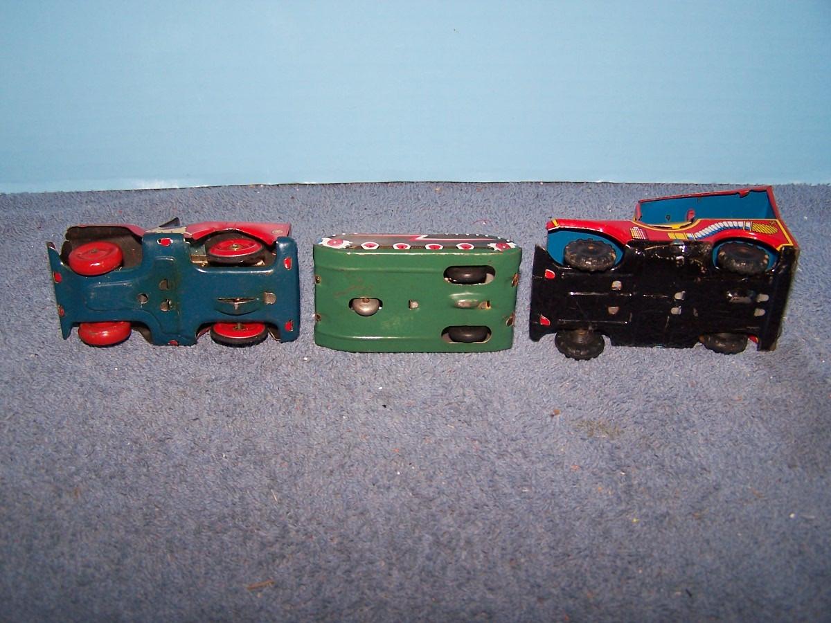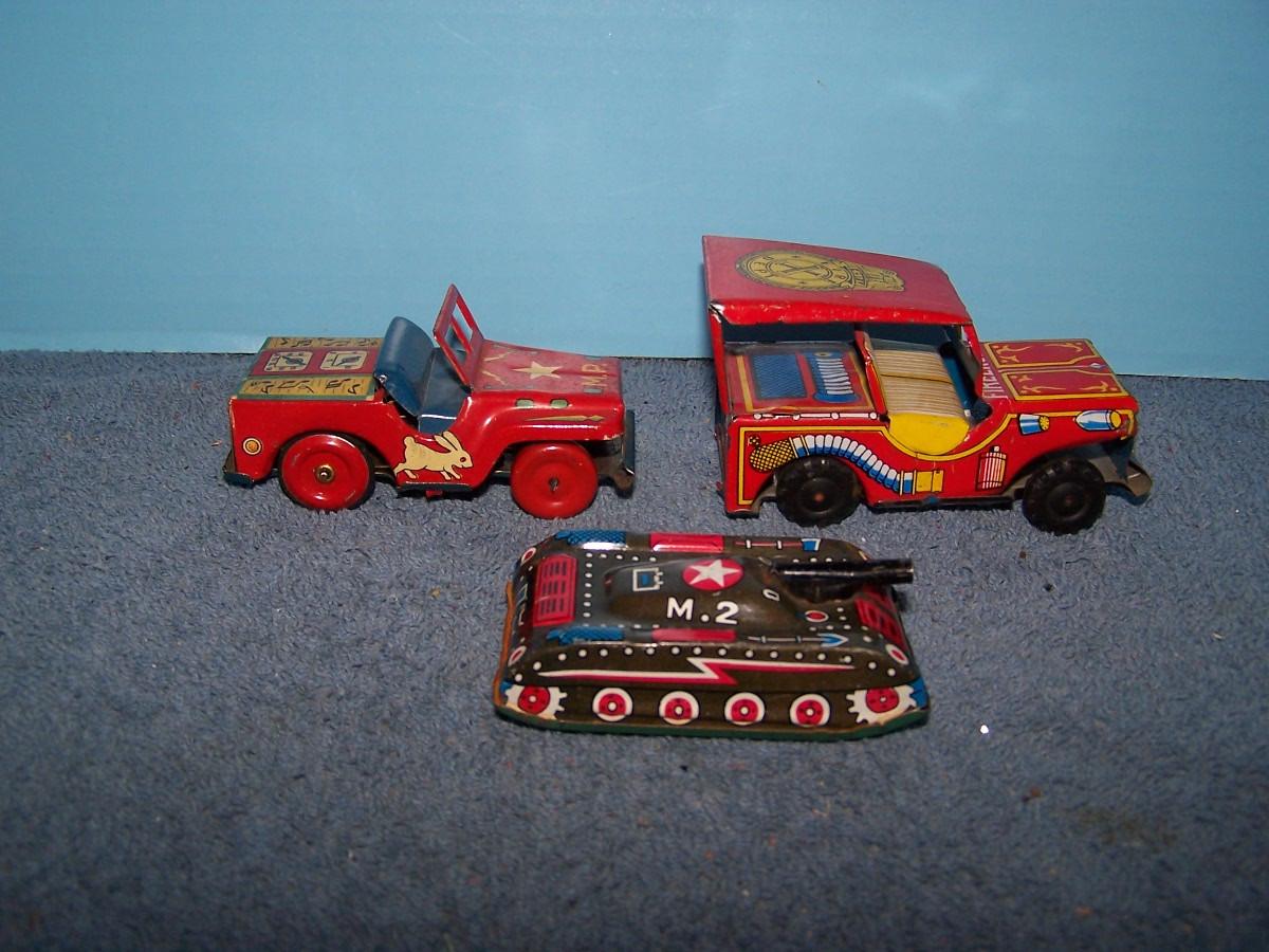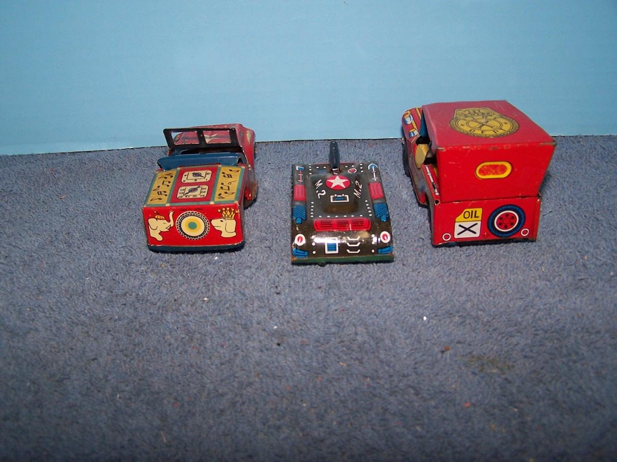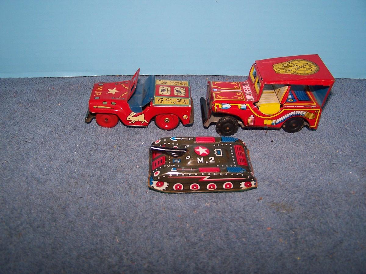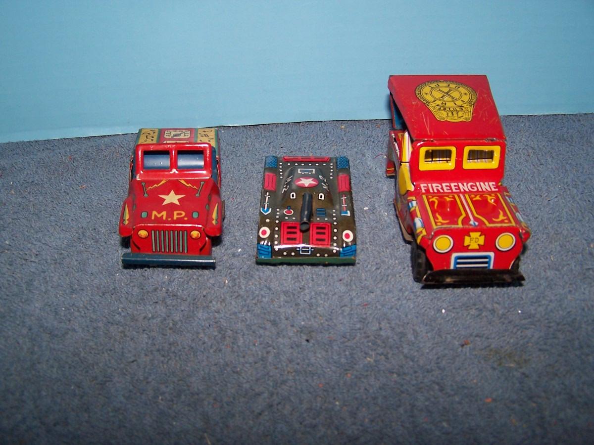 THESE ARE GREAT VINTAGE TIN LITHO VEHICLES! FIRE ENGINE IS 4''.. FRICTION.. ALL TOYS HAVE BEEN PLAYED WITH..