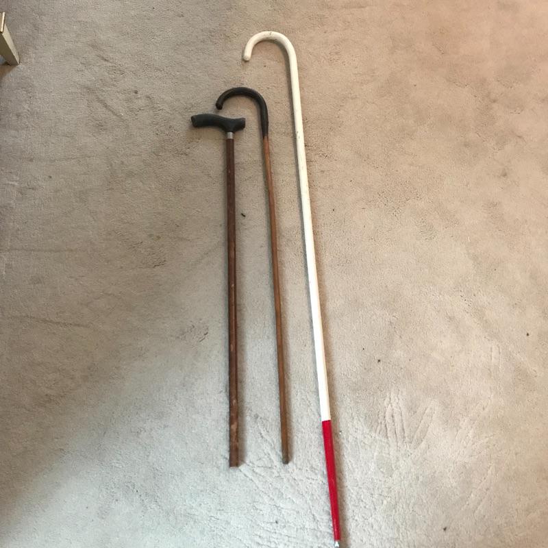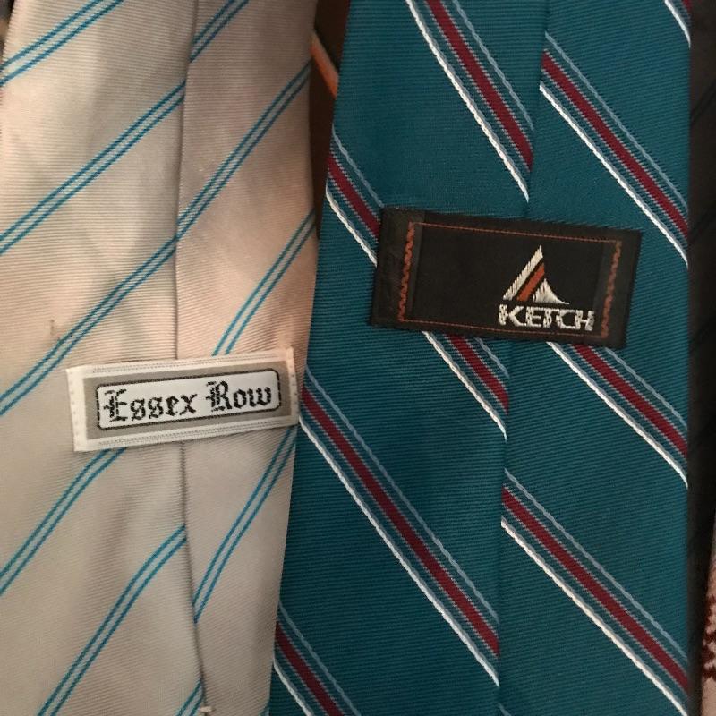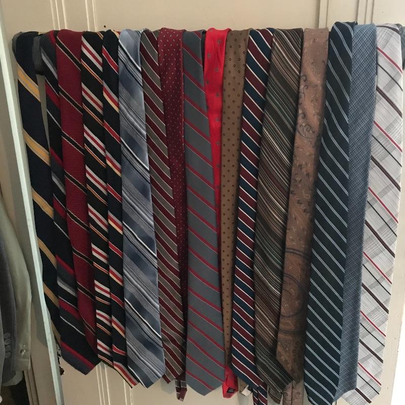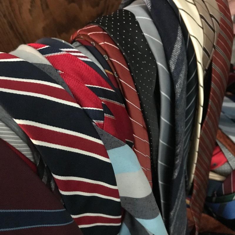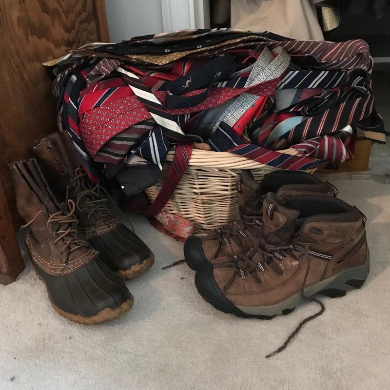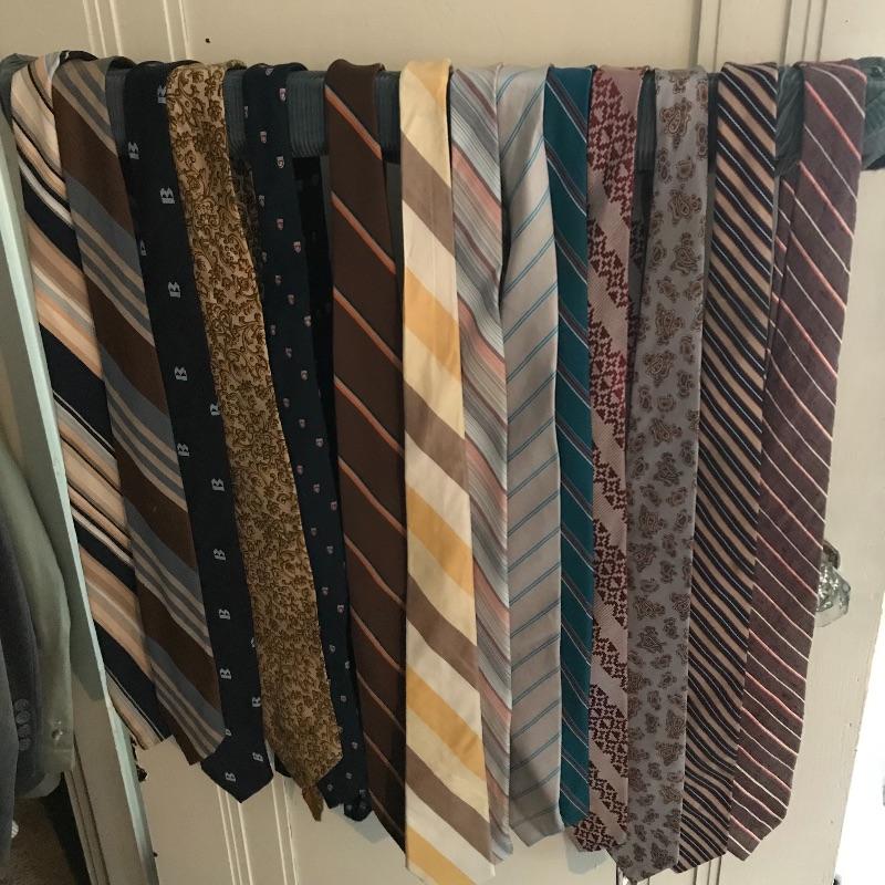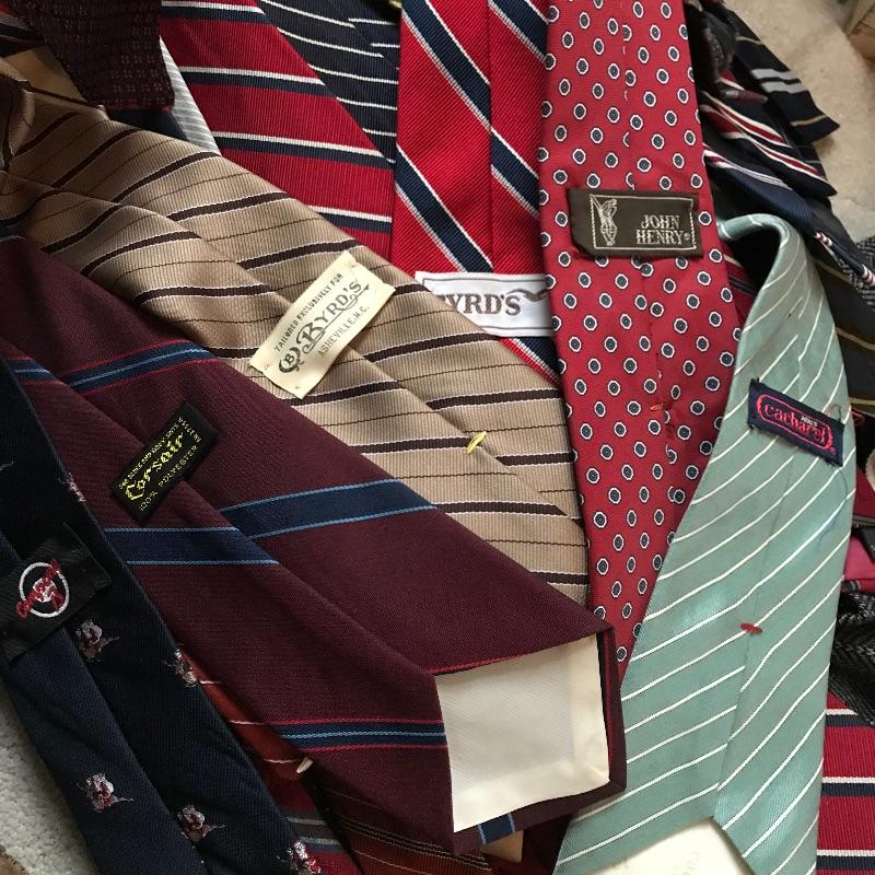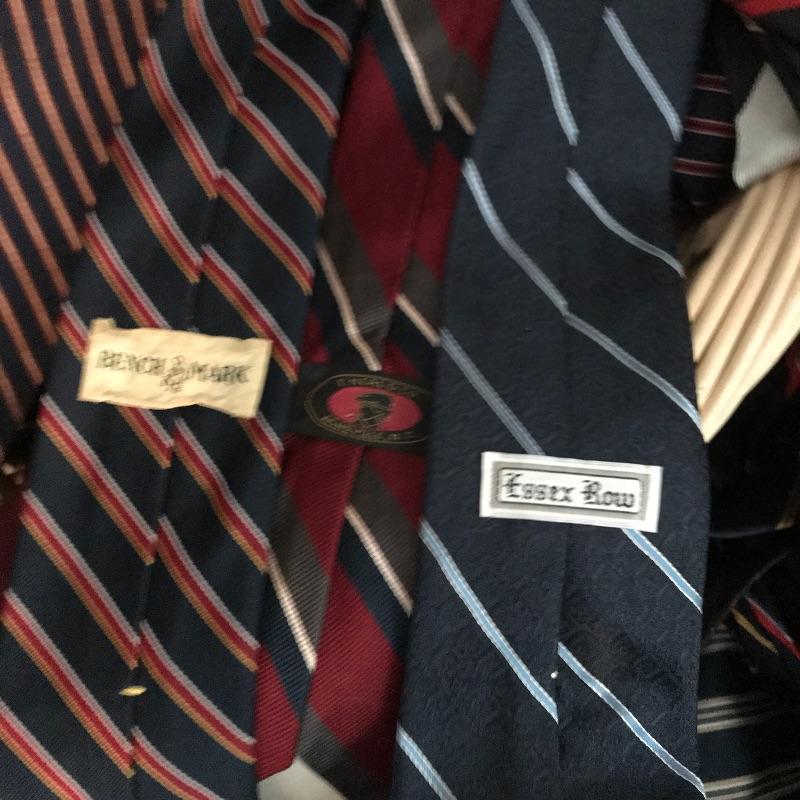 Large collection of over one hundred ties! Fat, skinny, silk and other fabrics, festive, bold and tame all in one giant collection! Too many to photograph! Labels and styles are only hinted at in photos, come to the preview to see this collection in all its glory! Ties are accompanied by size 11.5 Keens boots in great shape and LL Bean’s Maine Hunting Shoe boots stamped 9M, but appear to be larger than size nine, see photos. Complete your look with your choice of three walking canes! The white and red walking cane stands approximately 49” high. No shipping.