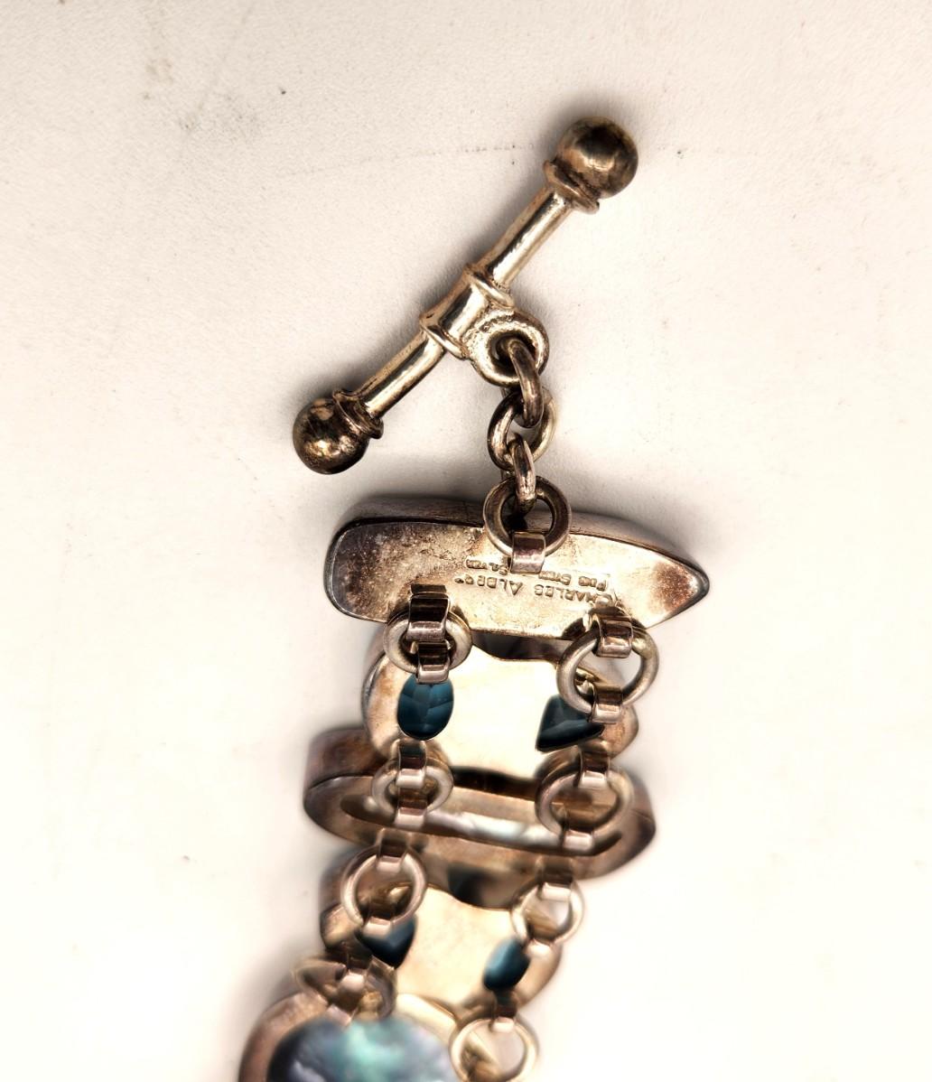 Signed Charles Albert (Sterling) - set with natural Mother of Pearl and faceted blue topaz stones. Toggle Clasp. 8" long. Has a modern look. This is really a beautiful piece.
