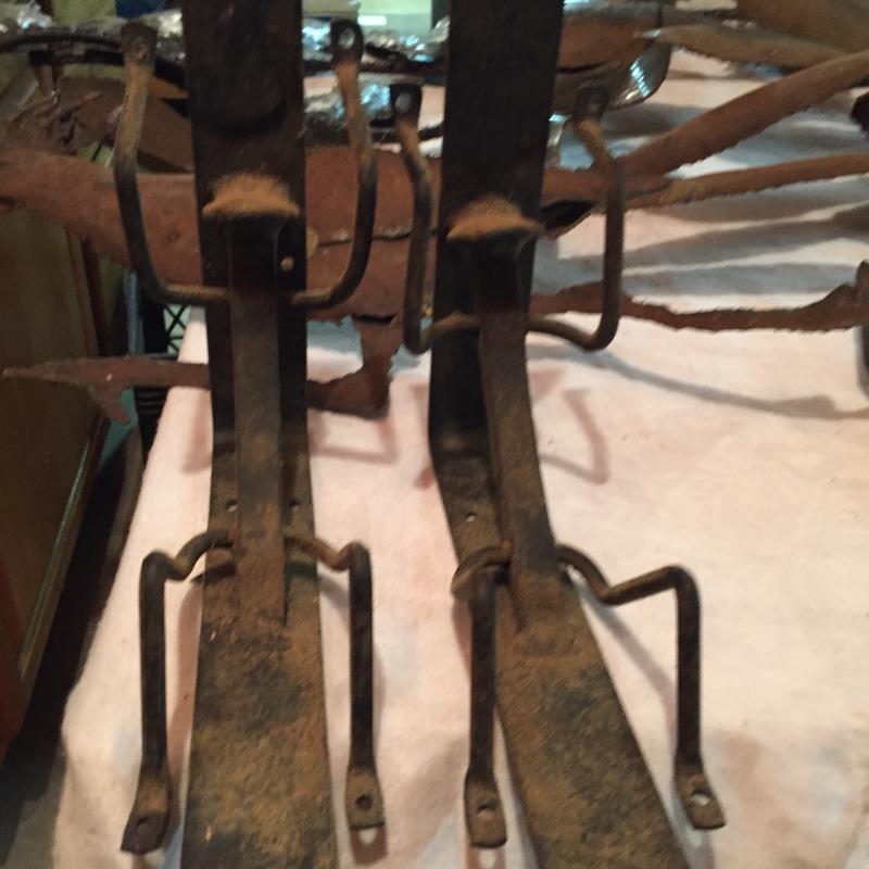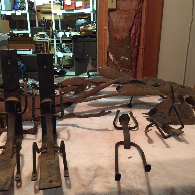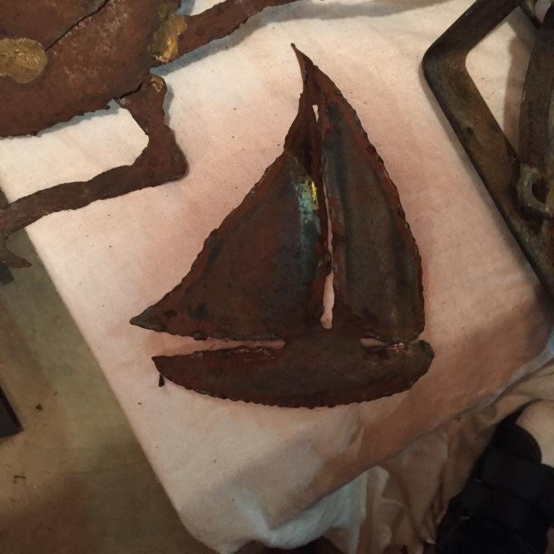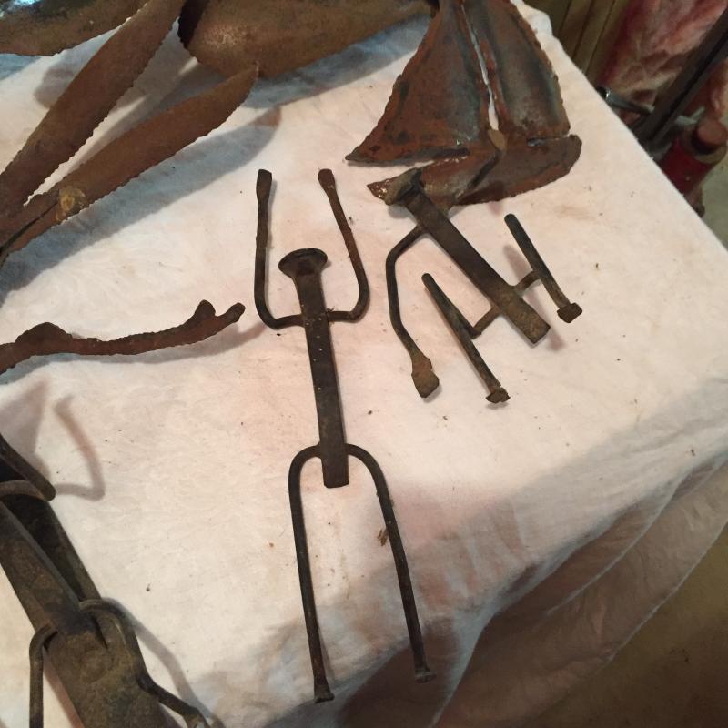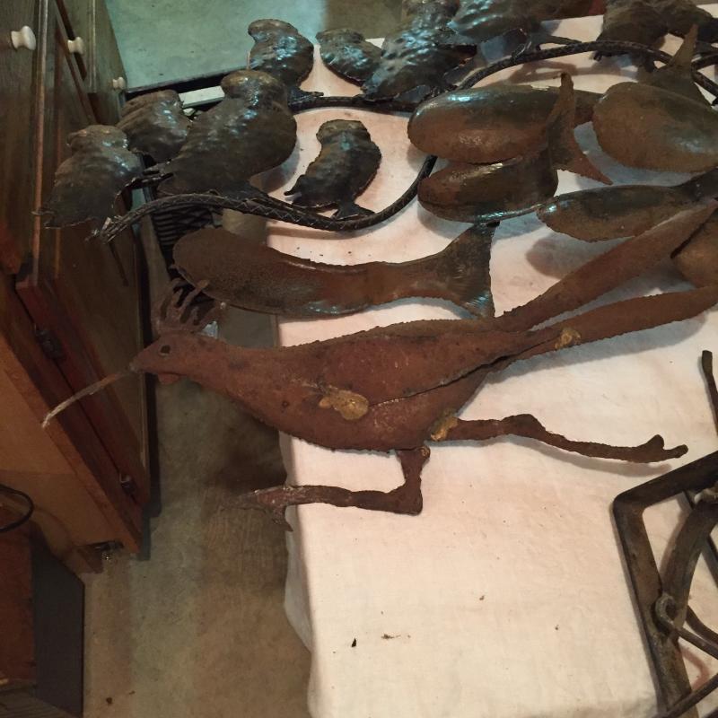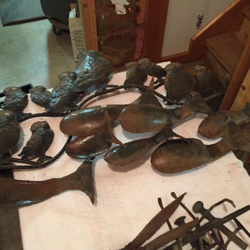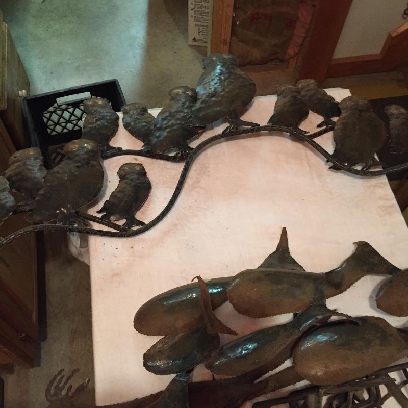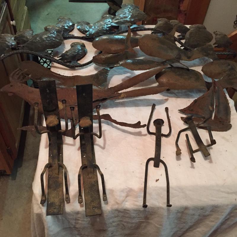 Assortment of Metal Art, Some are sheet metal cut and bent into form and others are metal pieces and what looks like railway stakes. Some rusting but overall fun pieces. Swimming fish measure 38” x14” x7”. Owl piece measure 37” x18”. Shelf brackets at 9.5” x8.5”.