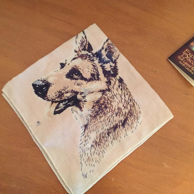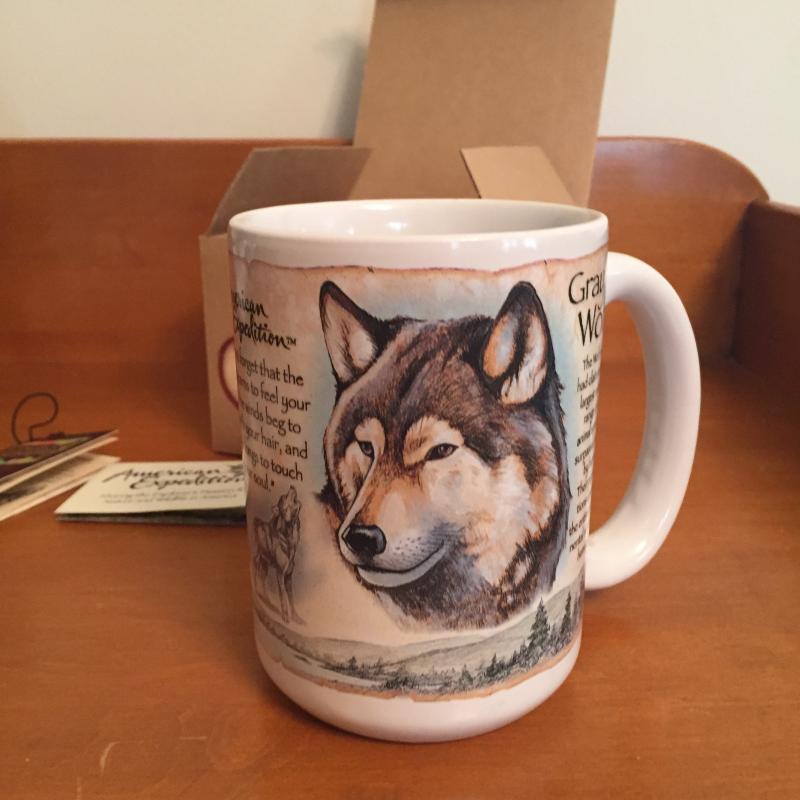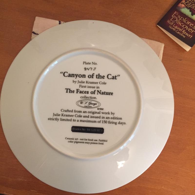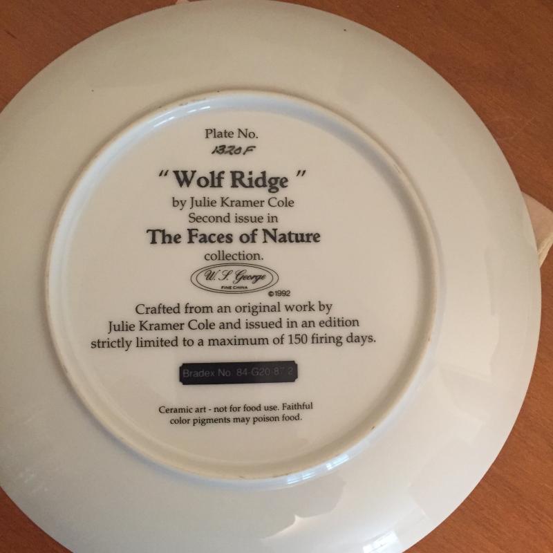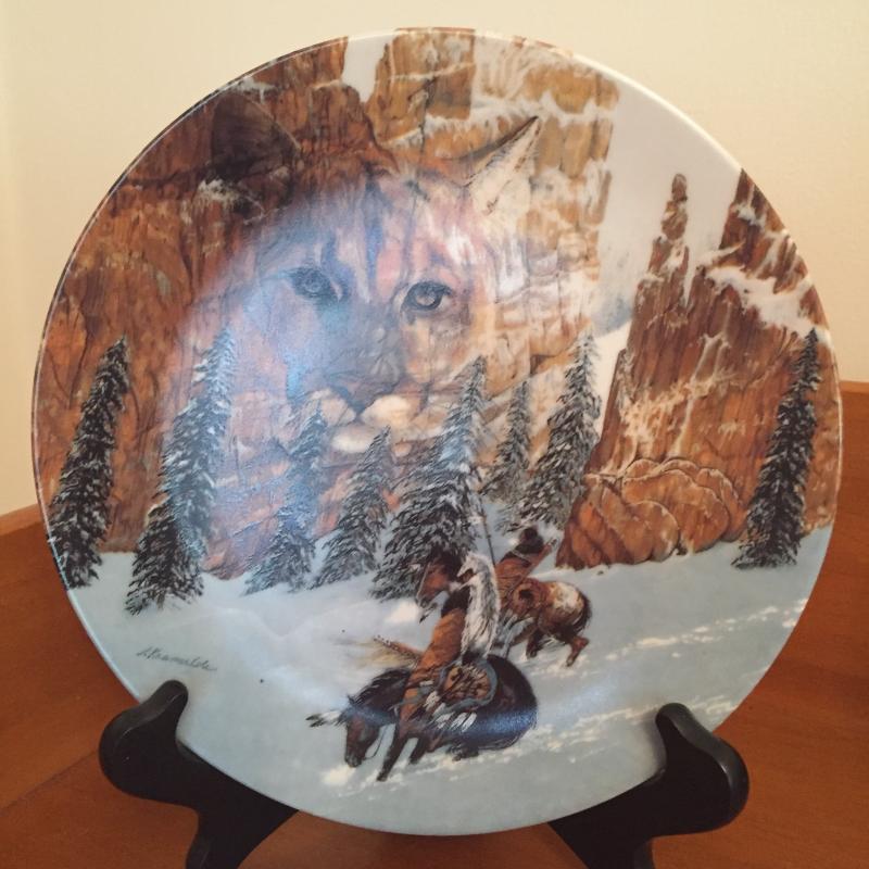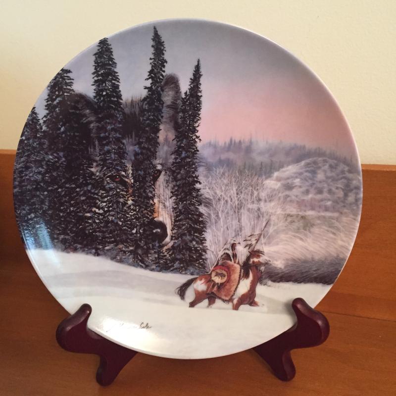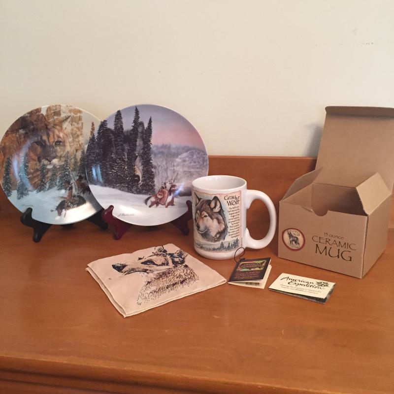 Pair of Native American numbered Julie Kramer Cole plates. Wolf mug in original box. Animal handkerchief. Shipping available.