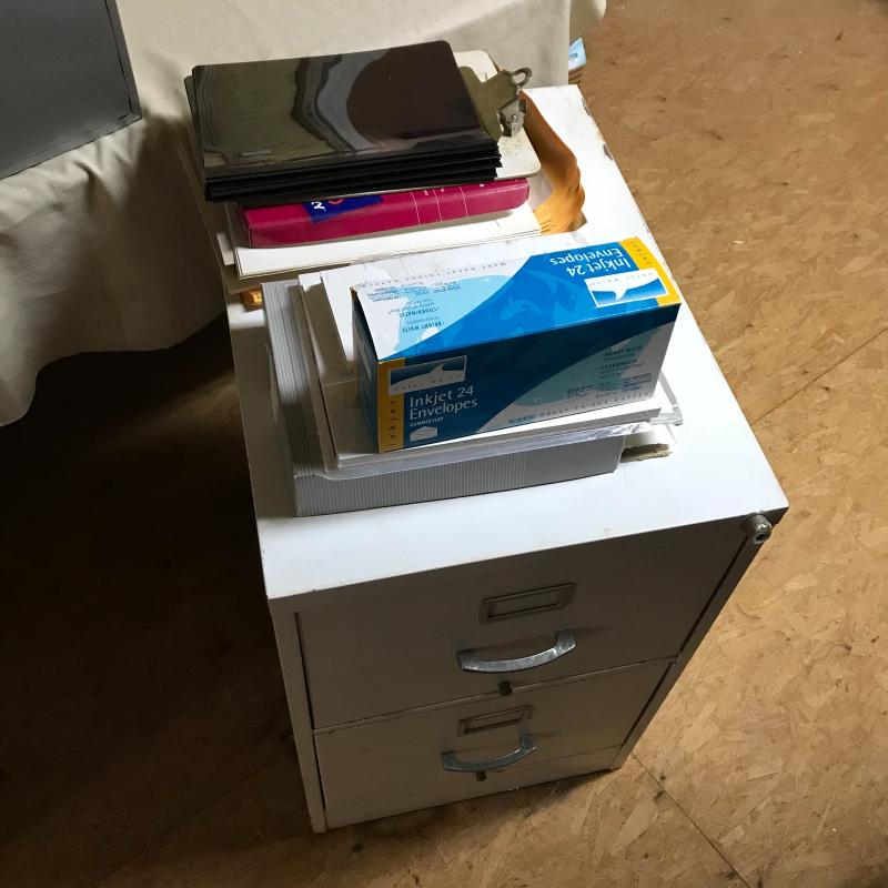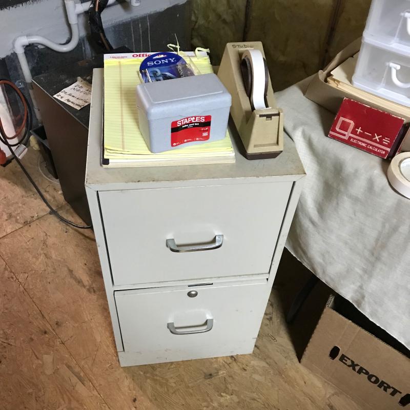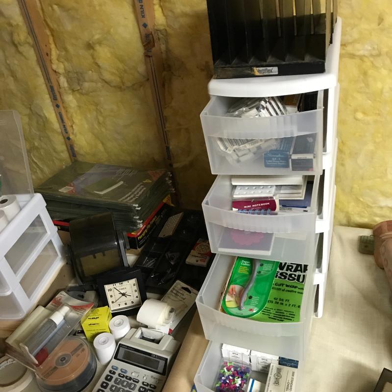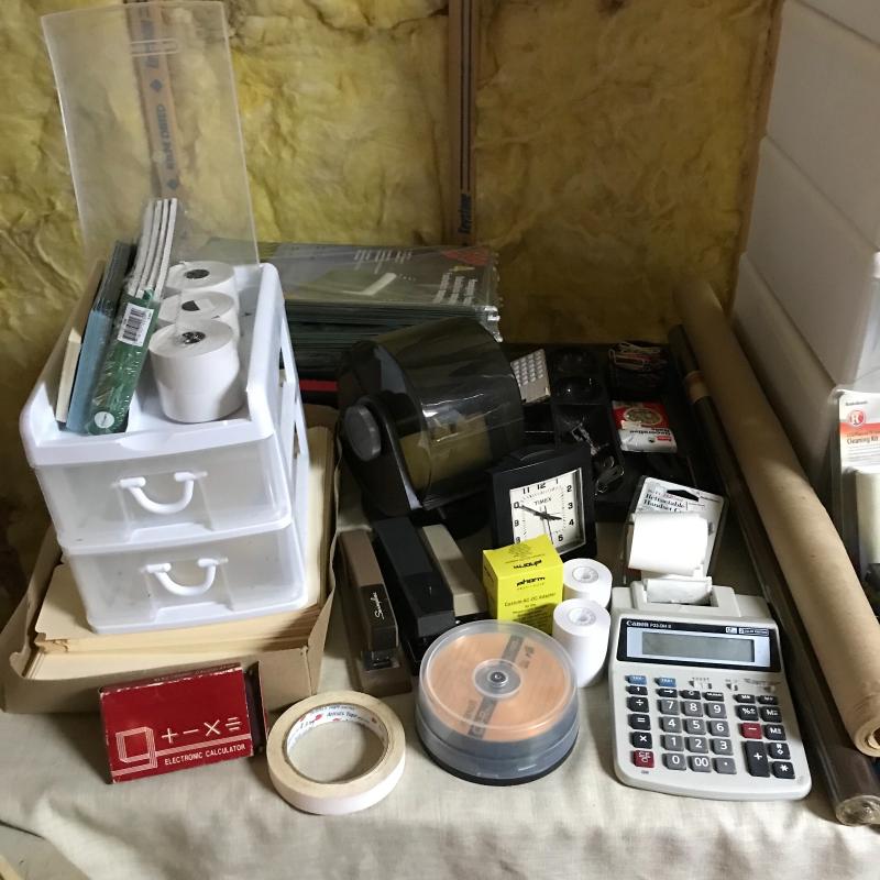 Large lot of office supplies includes staplers, staples, clips, tape, adding machine and roll paper, wrapping paper, printer paper, note pads, file folders, note cards, push pins, pencils, storage drawers, two file cabinets, and more. This lot is available for local pick up in Asheville, NC only.
