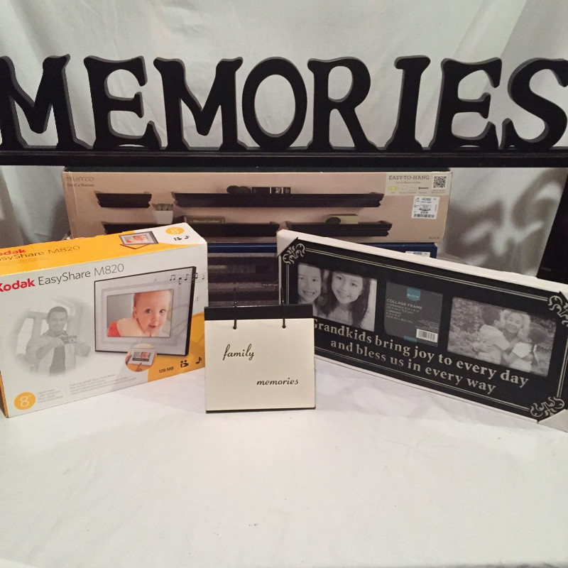A great lot here to display and store your much loved photos. Included is a Kodak EasyShare M820, a nice metal flip photo album, small shelf sets, a multi-photo frame and a “˜Memories’ sign.