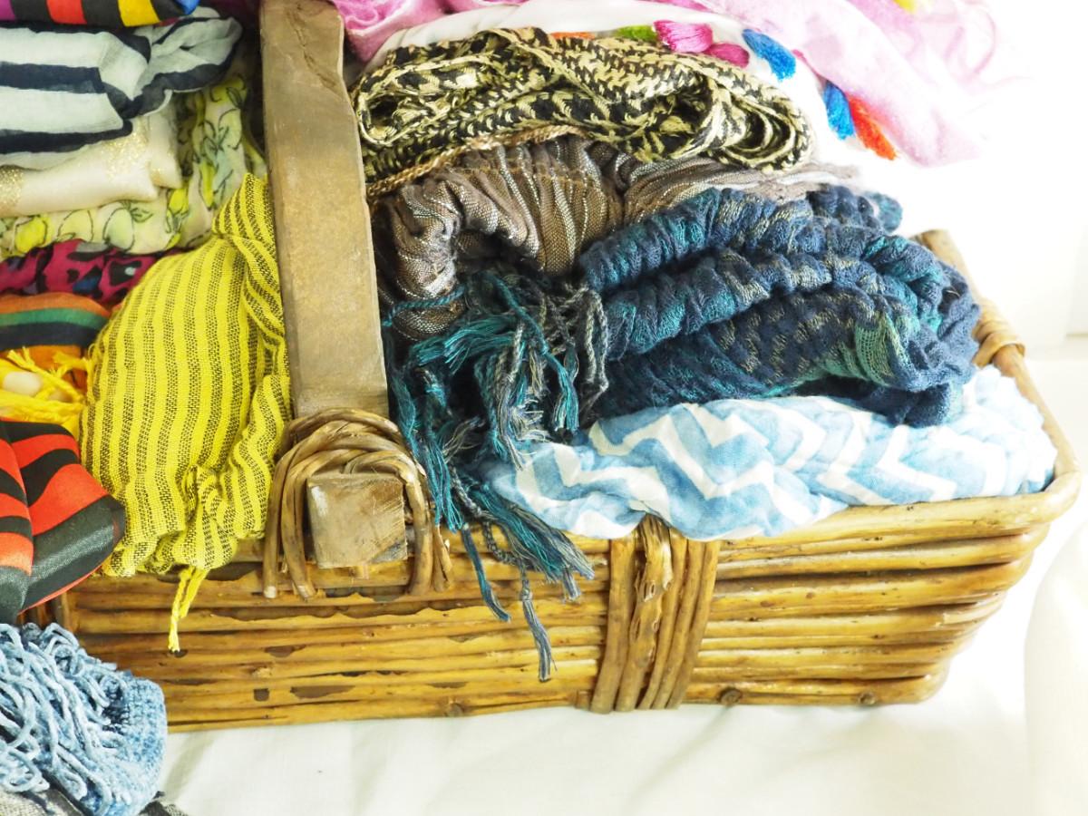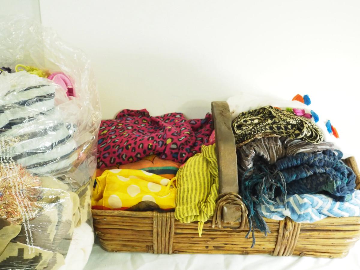 Lot 183- Scarves, many "infinite scarves," and straight scarfs and muffler. Many colors, prints fabrics and a really nice basket.