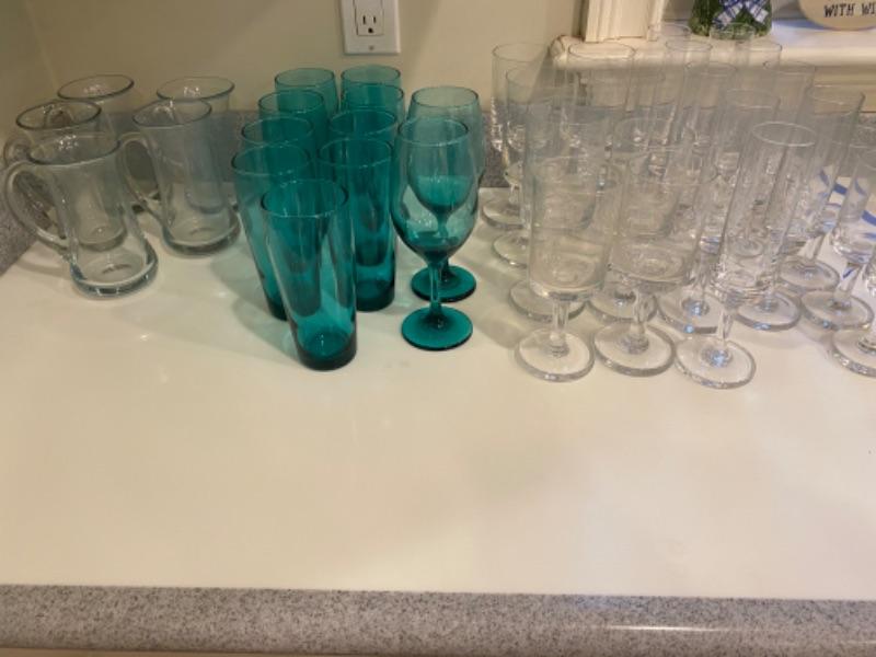 Large lot of blue glasses with clear wine glasses and clear mugs