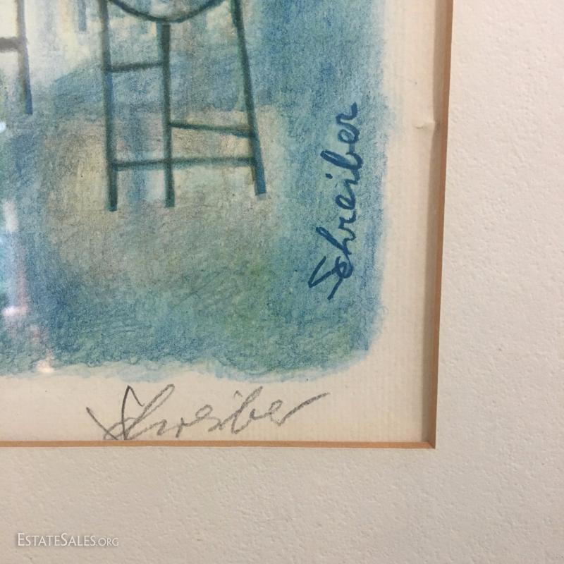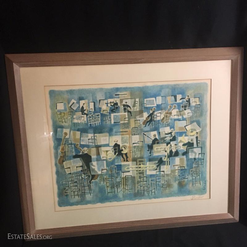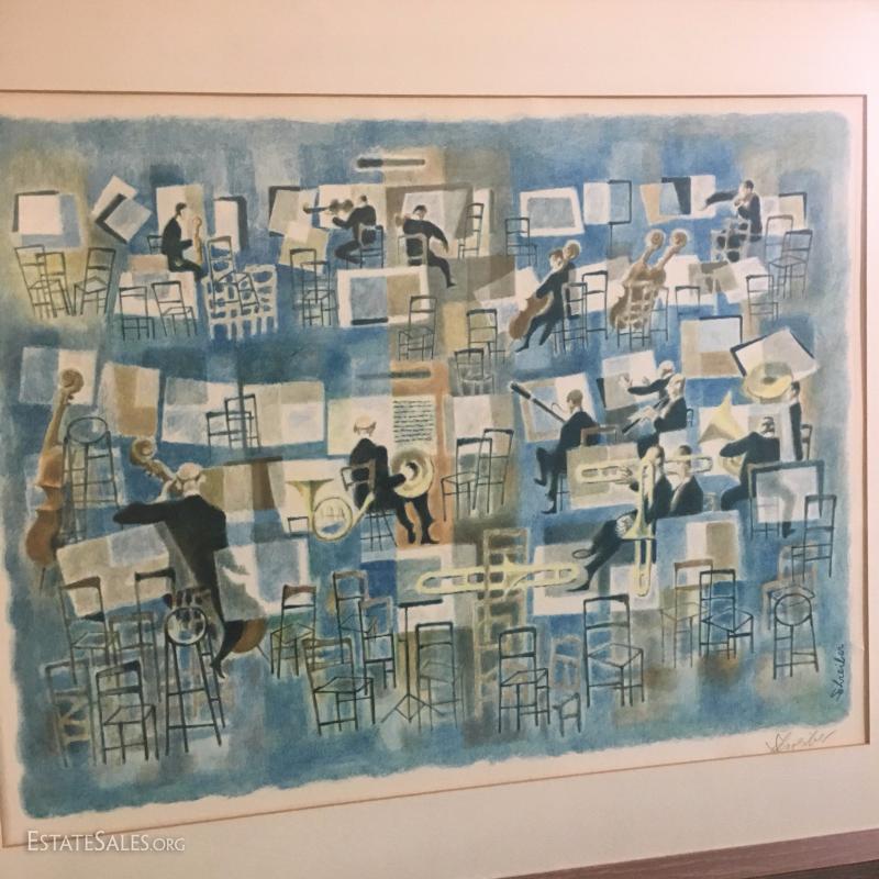 Gorgeous blue tones in the signed Schreiber painting of an orchestra. Nicely matted and framed and ready to hang. 33"l x 27"w