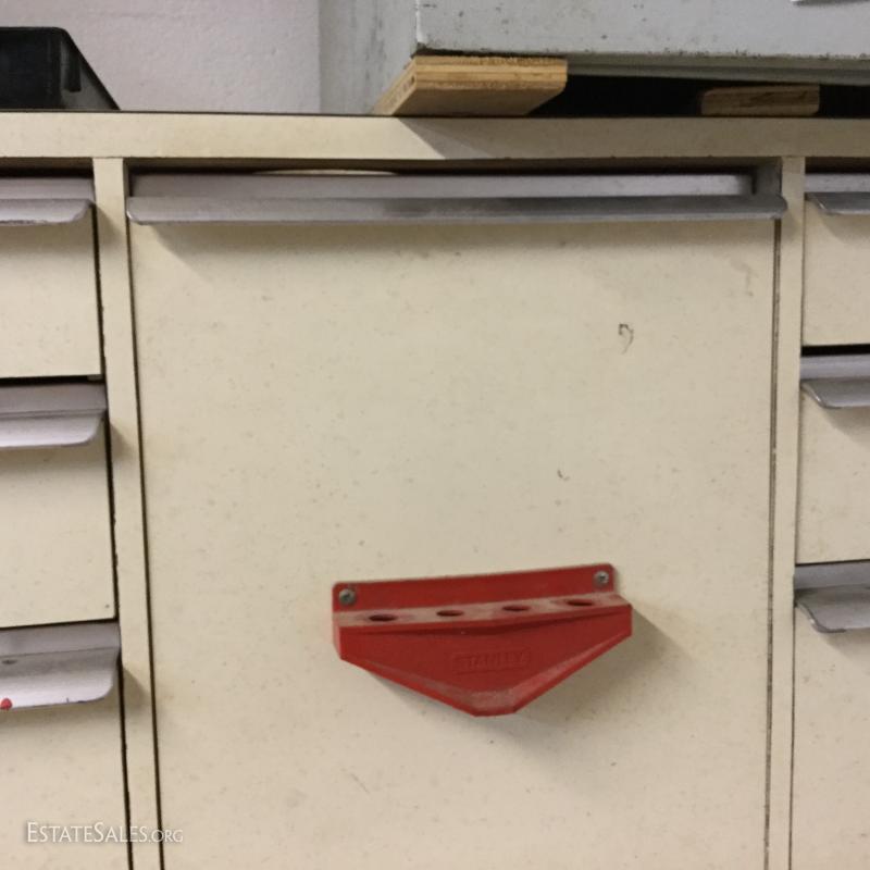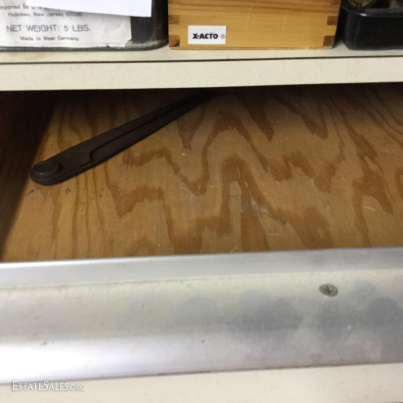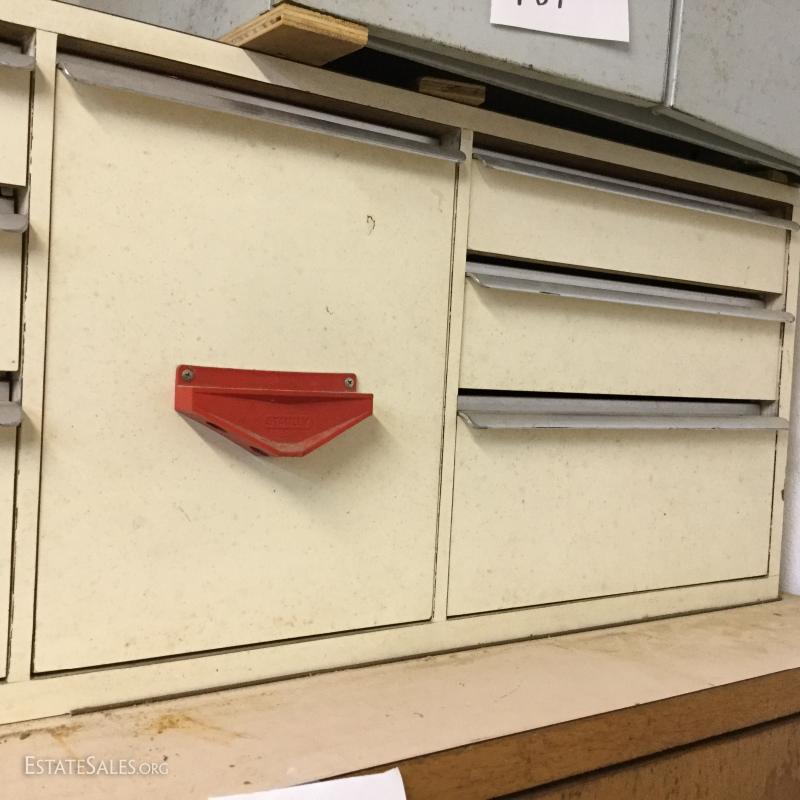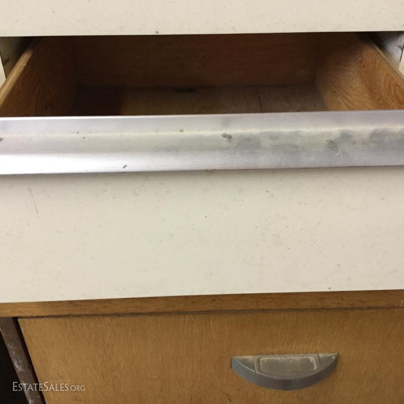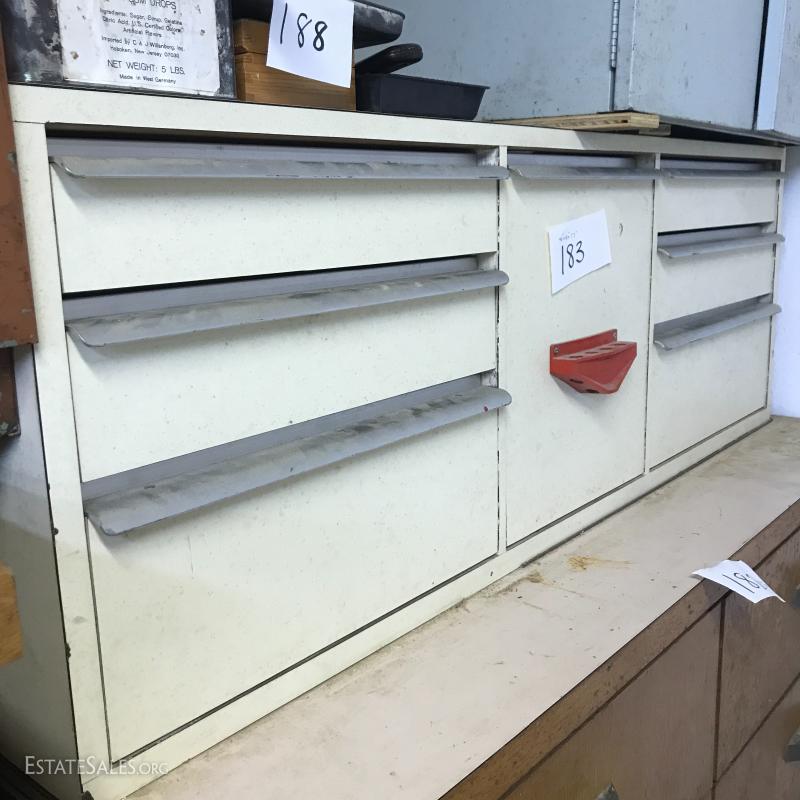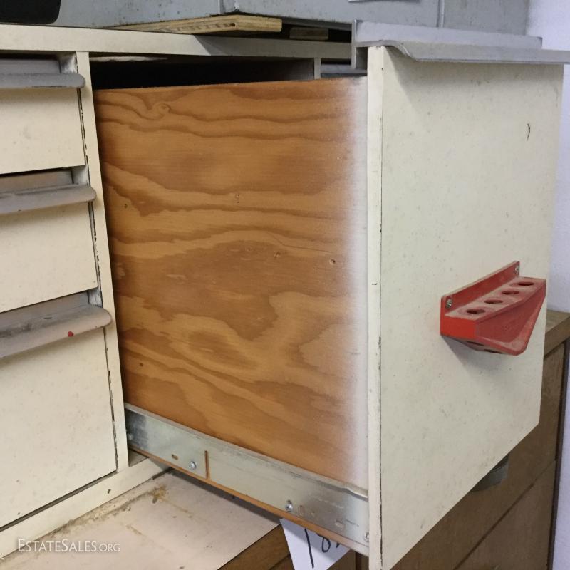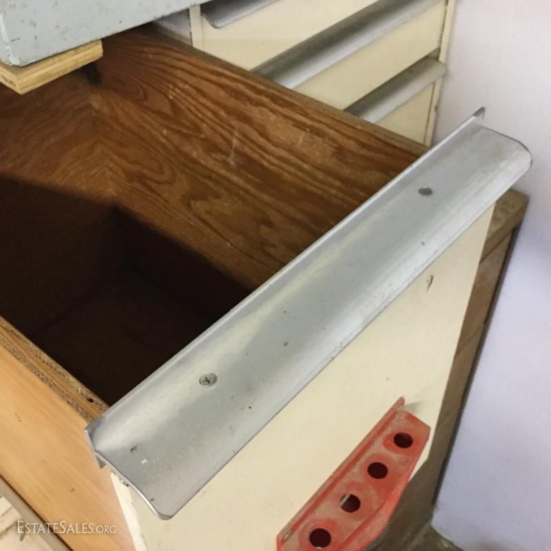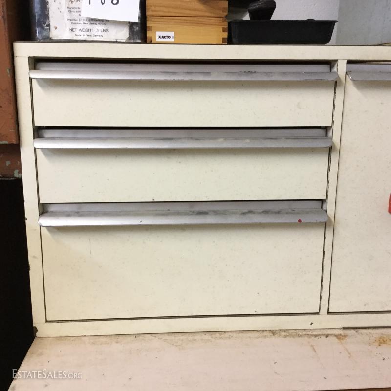 Great looking and useful storage cabinet. One deep drawer in middle. One drawer of contents included. See photos. 40"l x 18"w x 17"h.