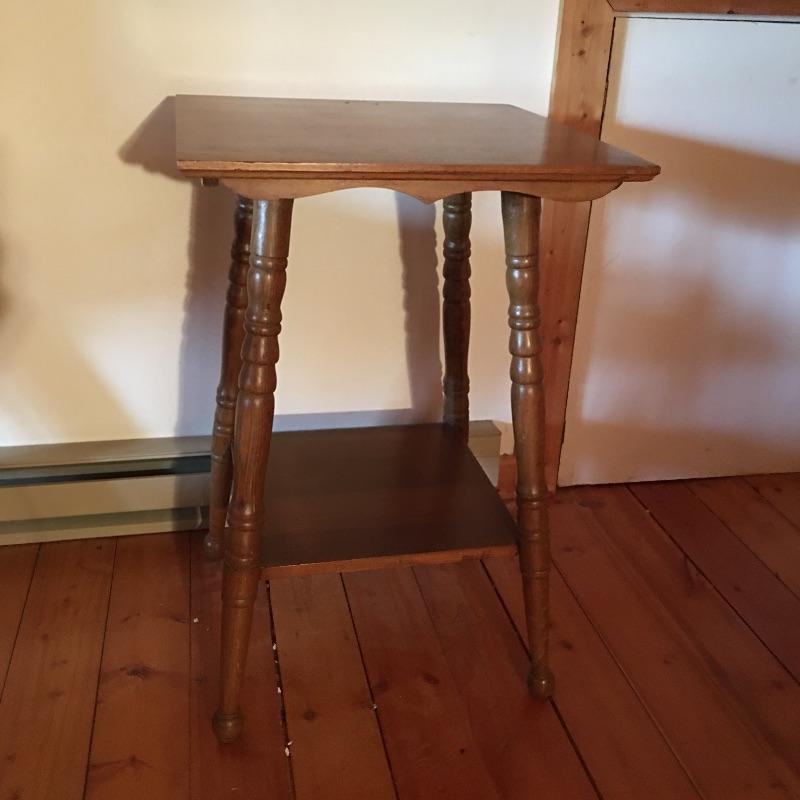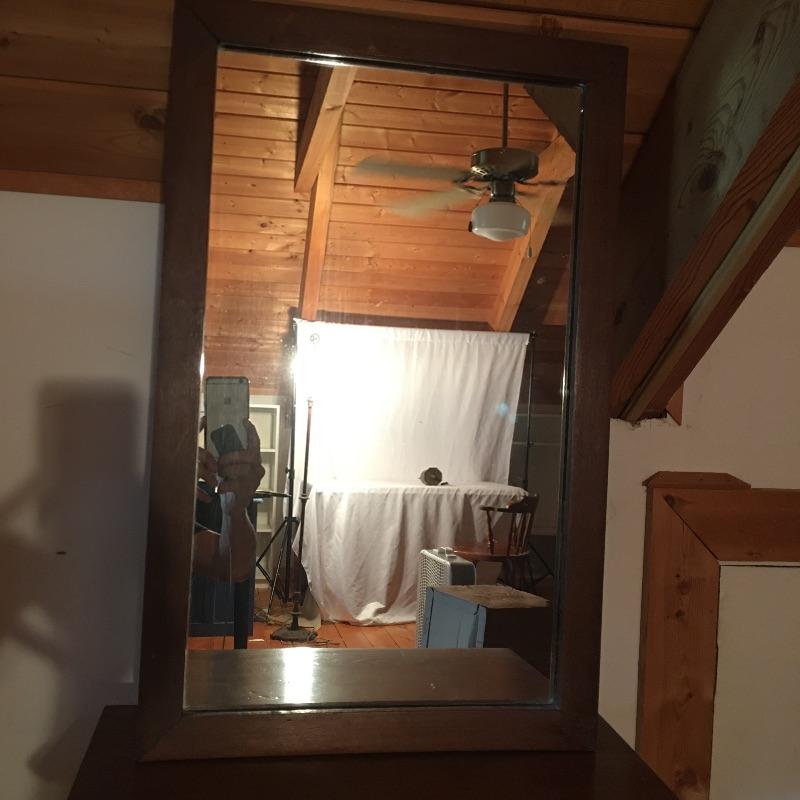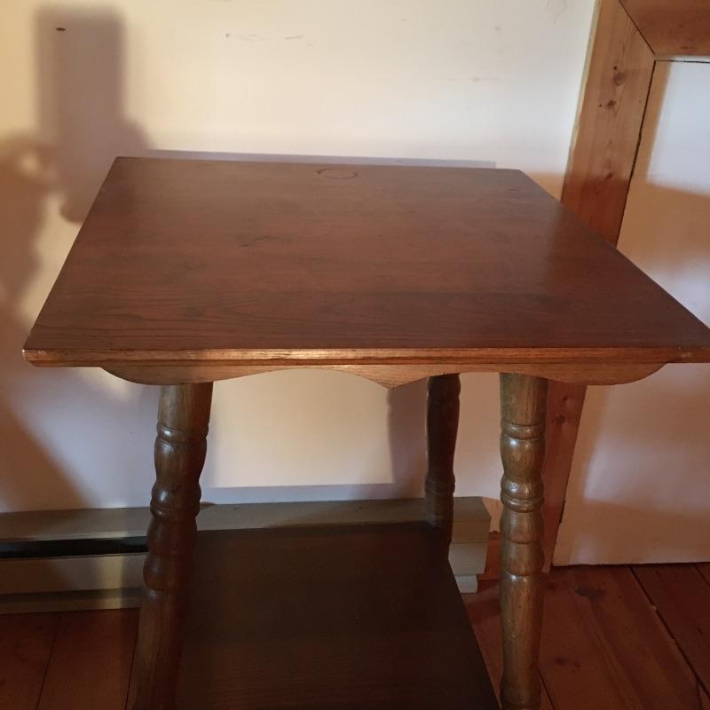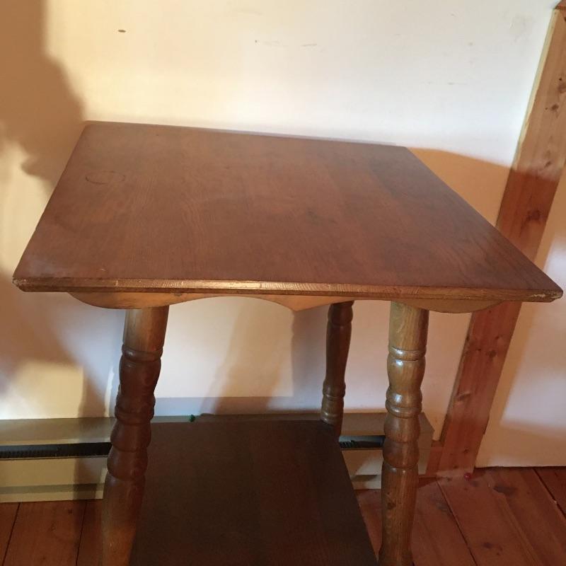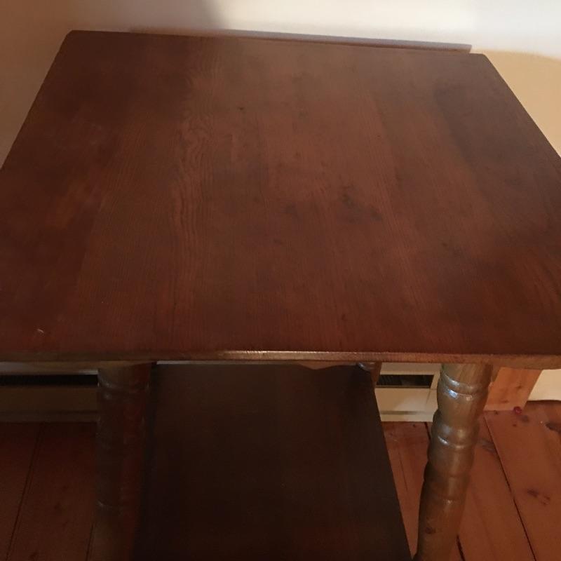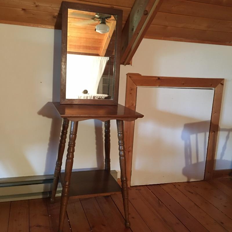 This wooden table with a shelf and wooden framed mirror are great accents to any room. Use both in your entry room or in any small space. The table has a few nicks and scratches and circle on top, see pictures. The wooden framed mirror that is much heavier than it appears.. Table measures 20” x 20” x 30.5”.