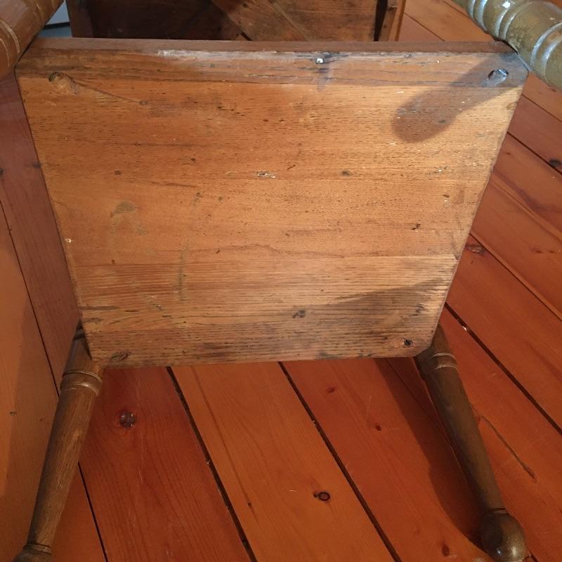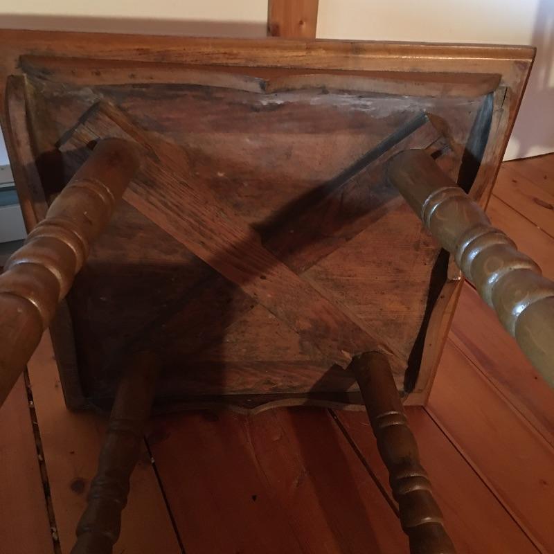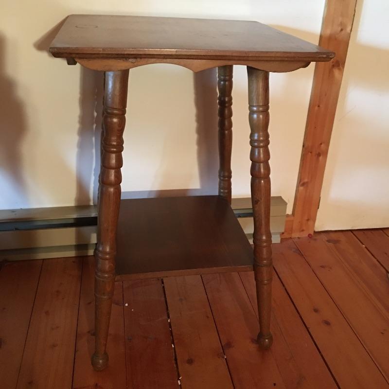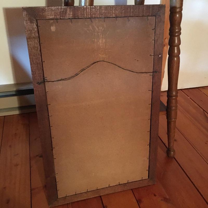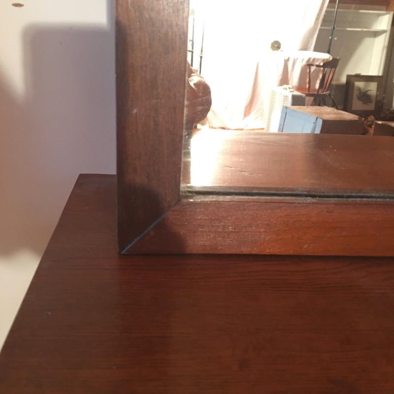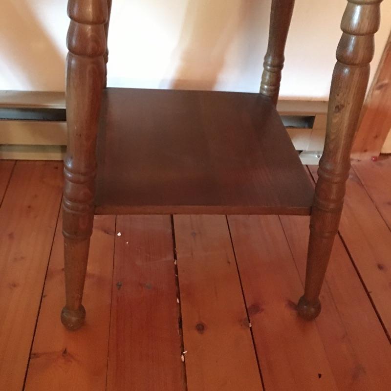 This wooden table with a shelf and wooden framed mirror are great accents to any room. Use both in your entry room or in any small space. The table has a few nicks and scratches and circle on top, see pictures. The wooden framed mirror that is much heavier than it appears.. Table measures 20” x 20” x 30.5”.