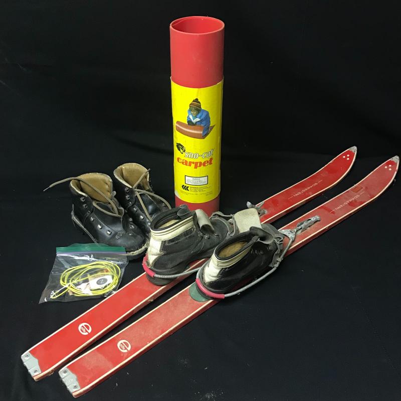 Small child skis with boots and Italian S. Moritz hiking boots that could be used with skis too. Snow cat carpet still wrapped up and never used. Skis are 39” long and both shoes are very small but no sizes found (guess is child’s 3). Local pick up only.