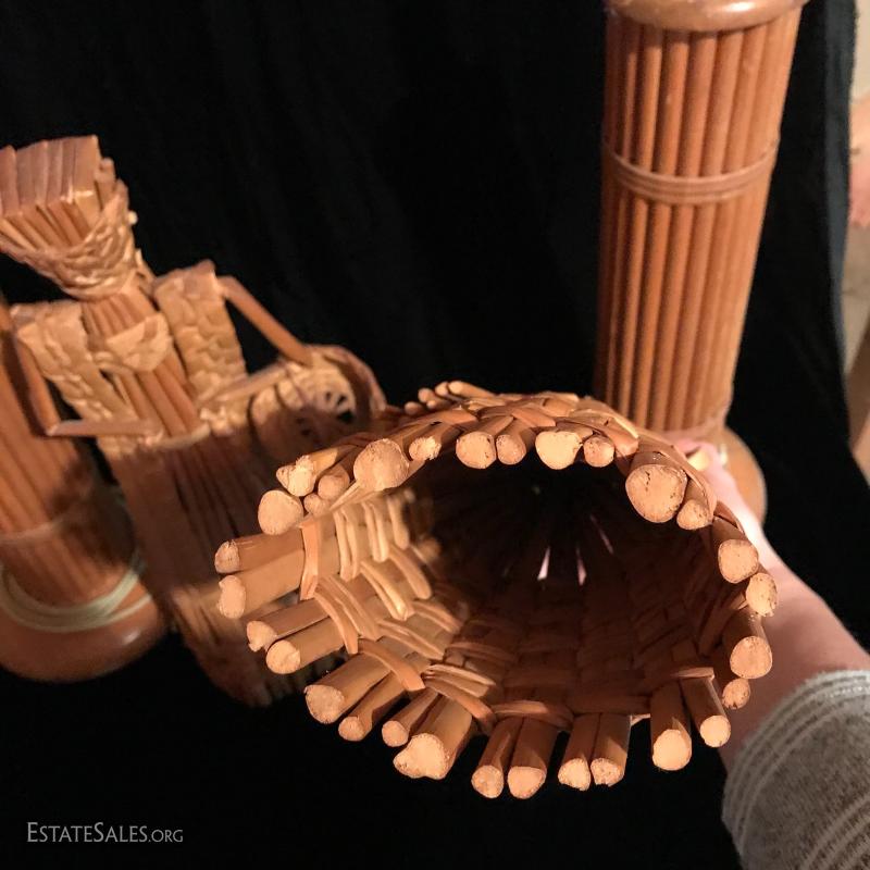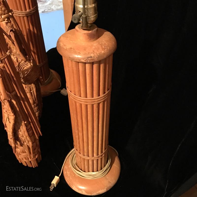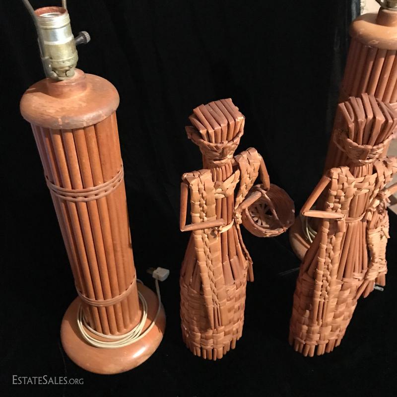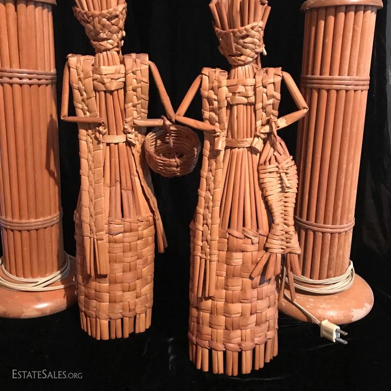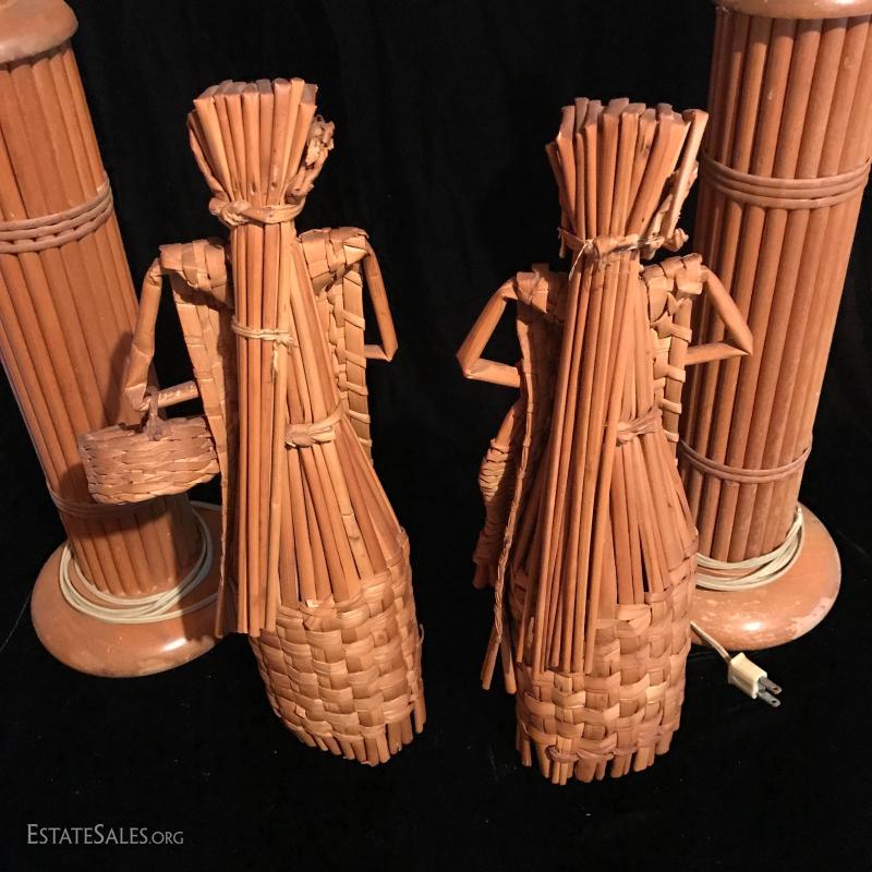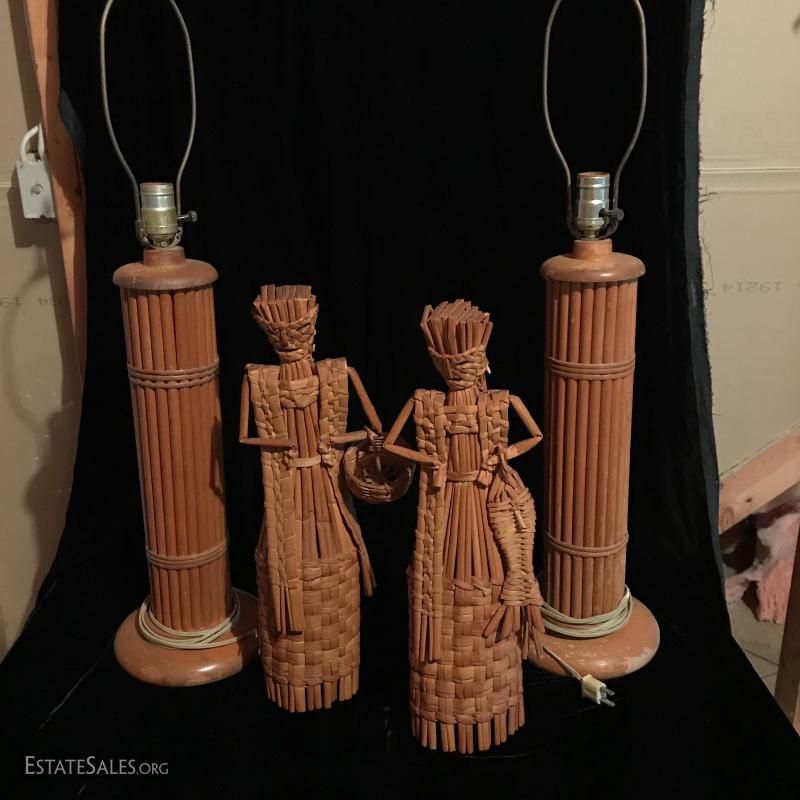 Pair of tall wood lamps standing 31" tall. Some water stains. Two woven figures measuring 18.5" tall. One holding a basket the other holding a fish. This lot is available for shipping or local pick up in Flat Rock, NC.
