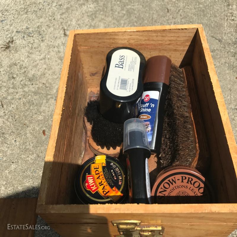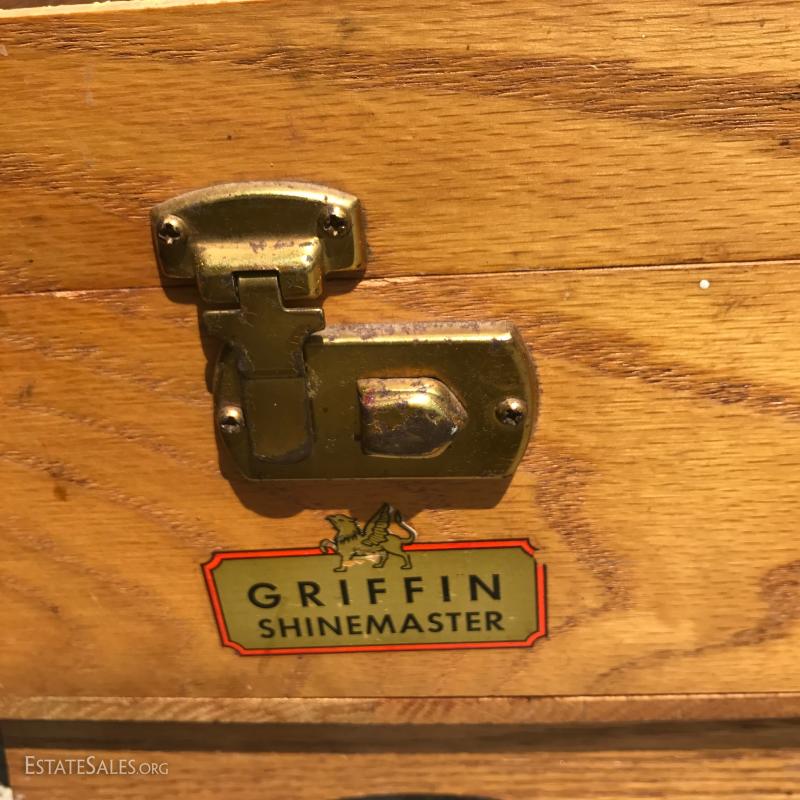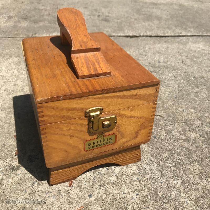 Also included is a wood wine rack and a Griffin Shinemaster with accessories (please note the top to the shoeshine kit needs to be reglued).