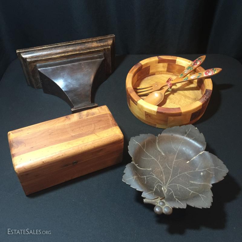 Wood Sconce, bowl, fork/spoon, Lane mini "Salesmen" sample cedar chest, carved oak leaf music box that plays "My Queen Waltz".