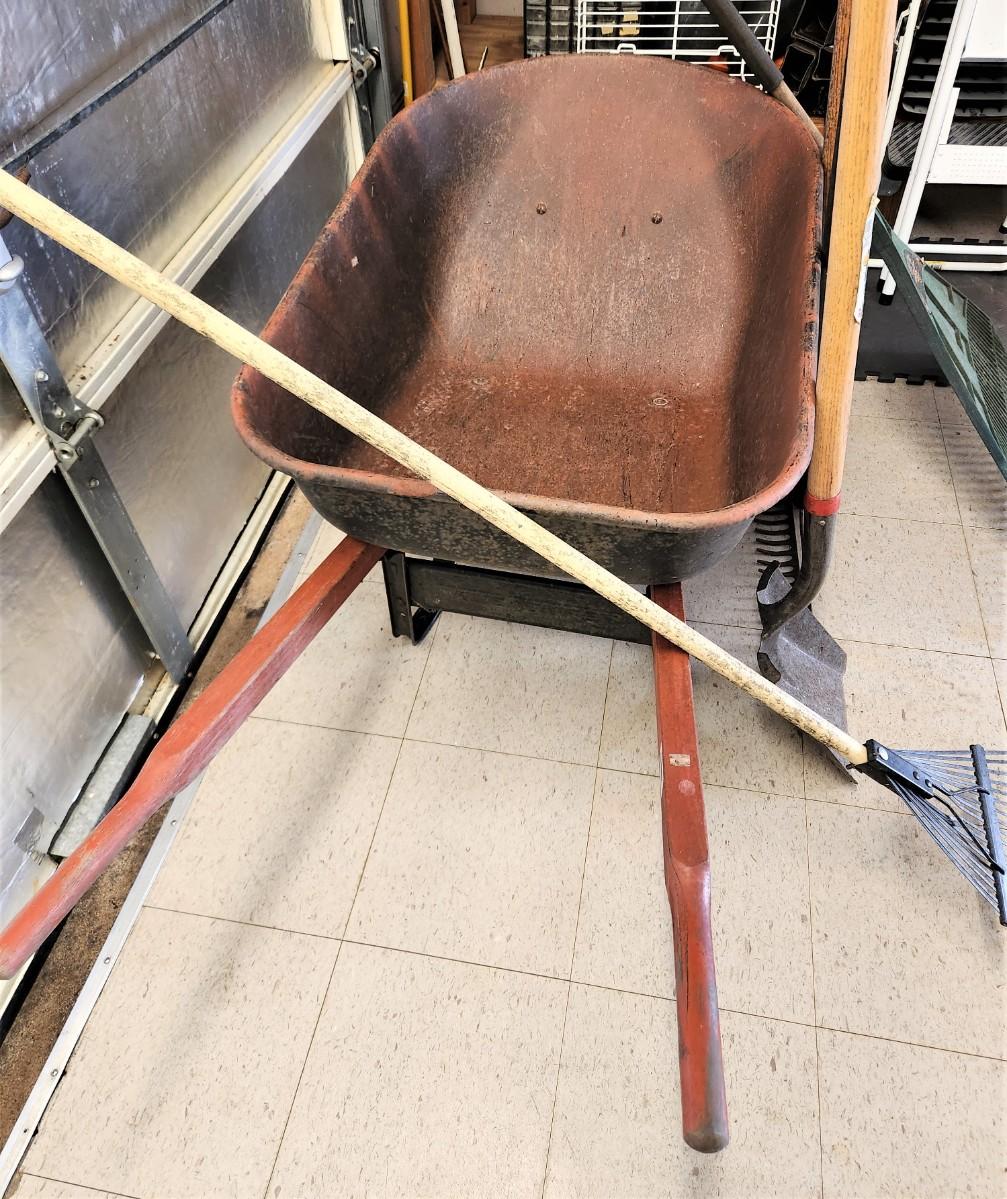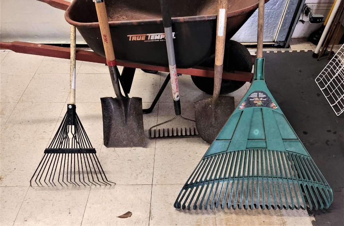 Lot #183 Yard Lot - Wheelbarrow, 3 yard rakes, 2 shovels
