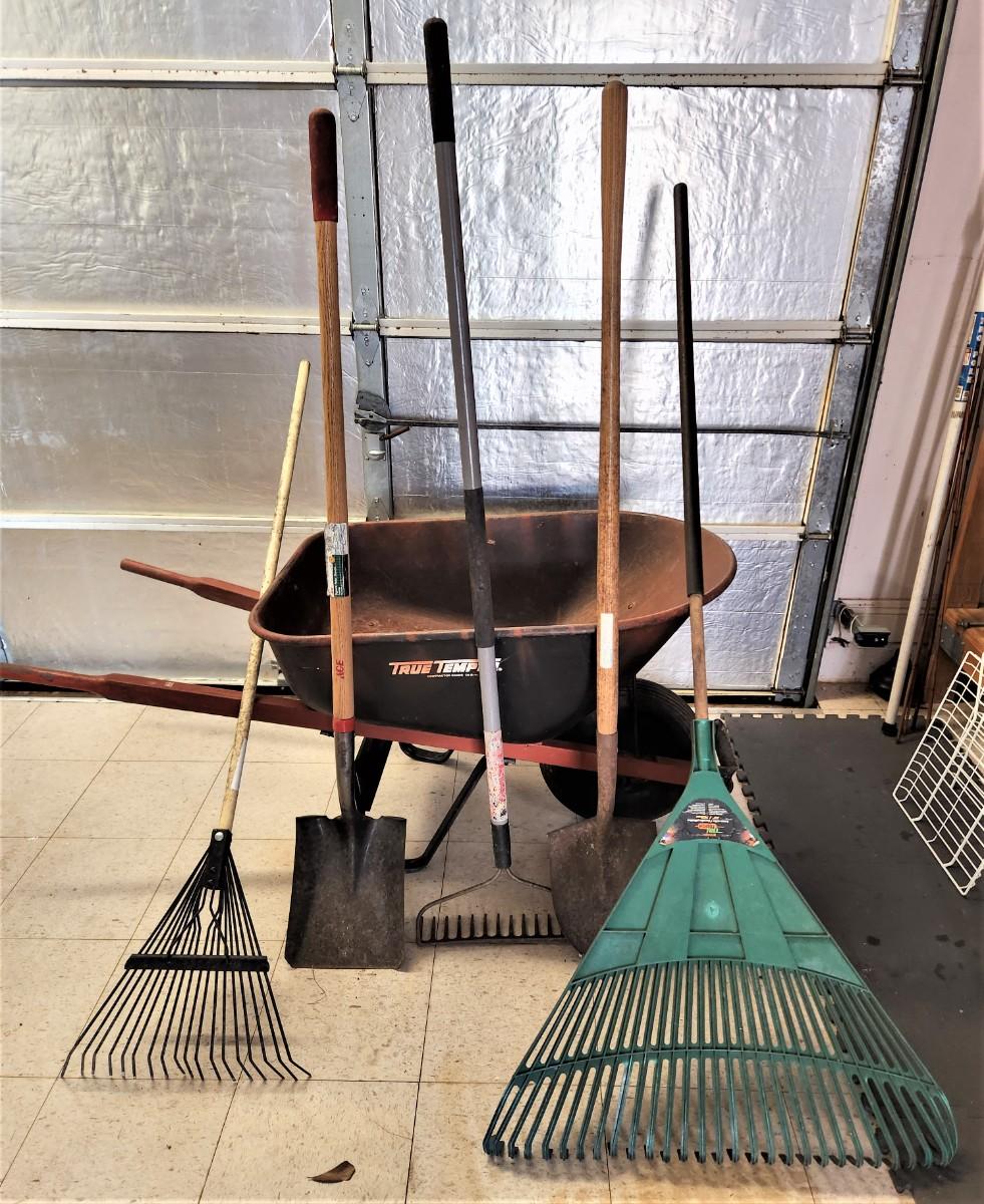 Lot #183  Yard Lot - Wheelbarrow, 3 yard rakes, 2 shovels