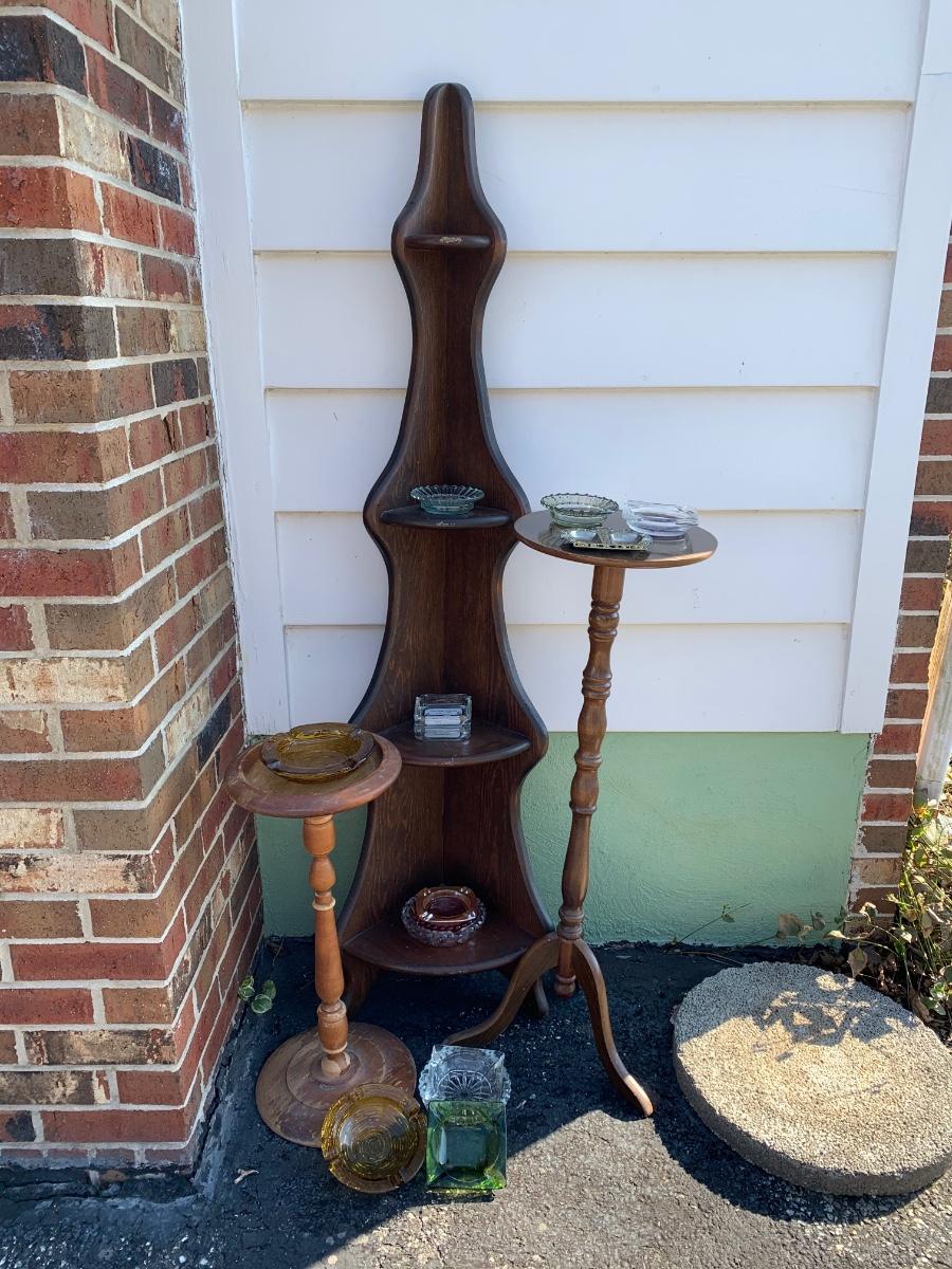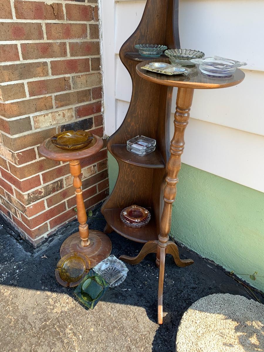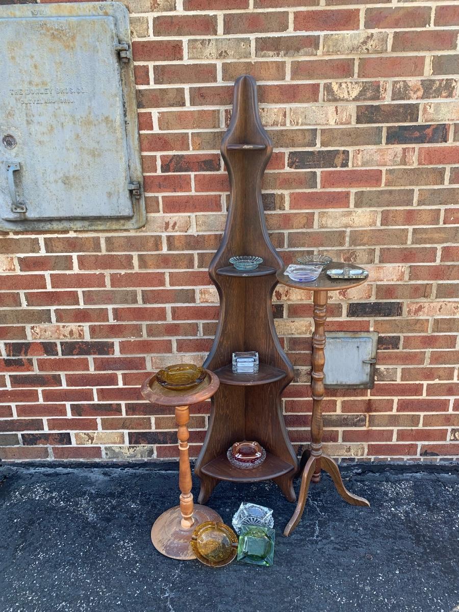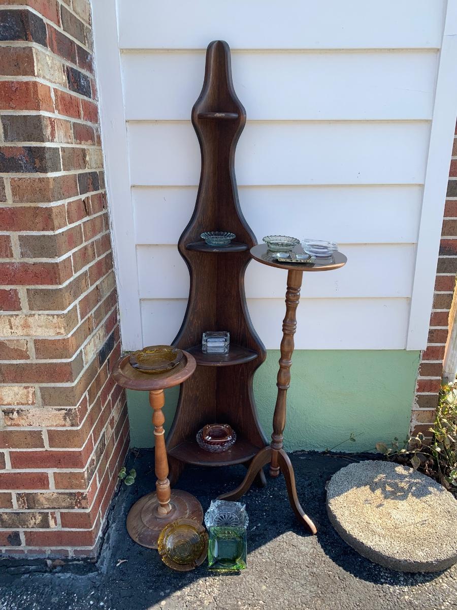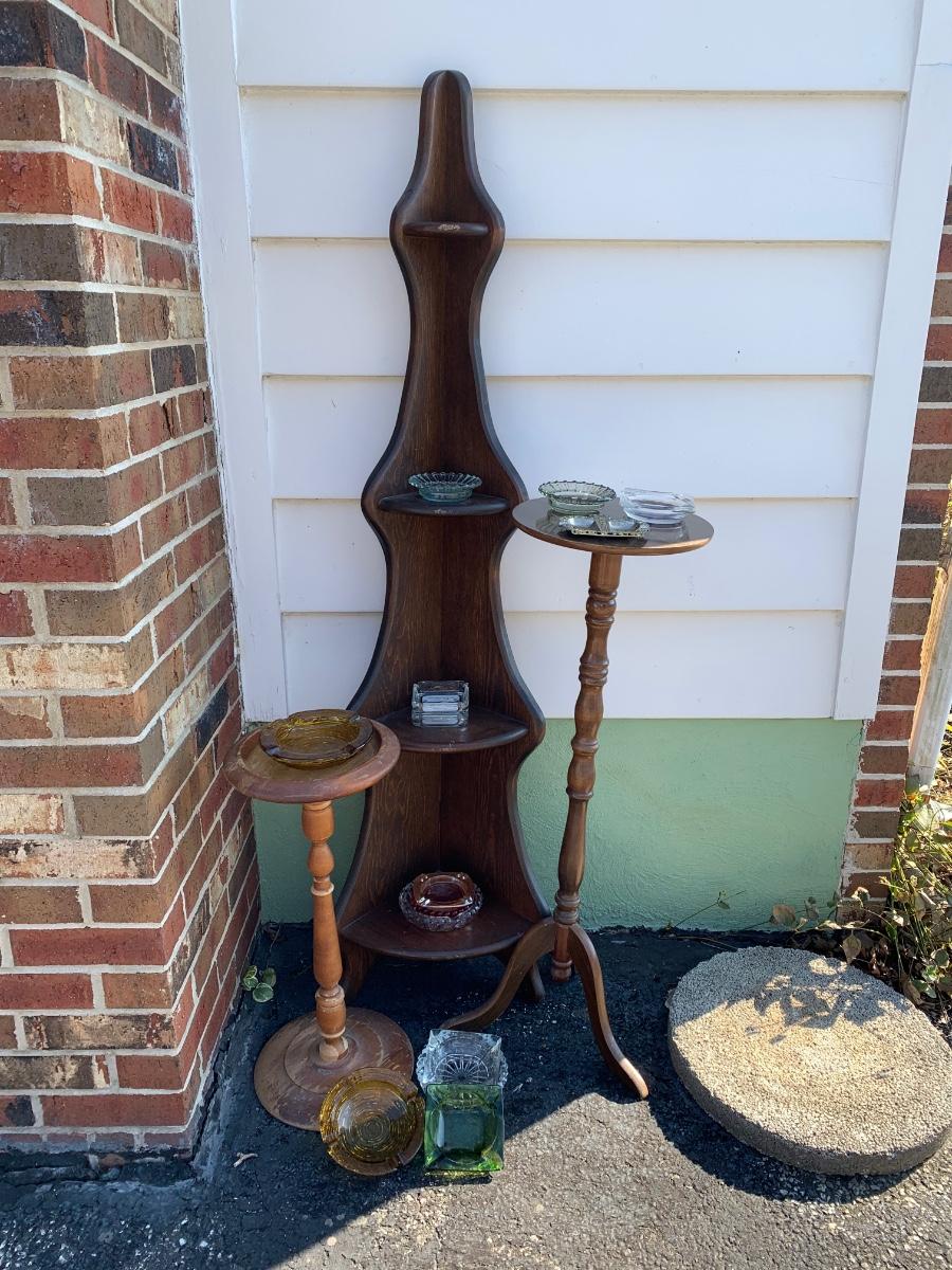 Includes three pieces of furniture and several glass ash trays. Corner shelf measures 59 inches tall, plant stands measure 36 and 24 inches each.