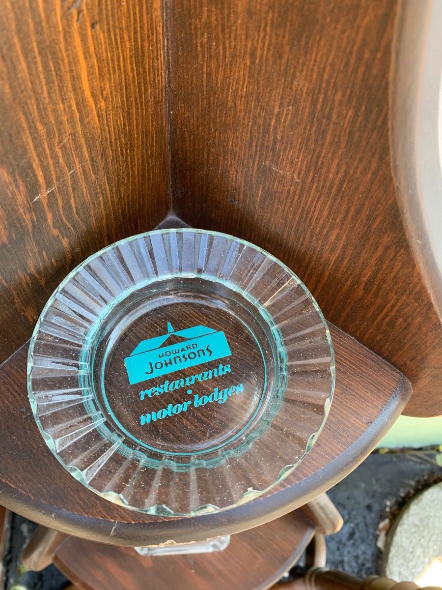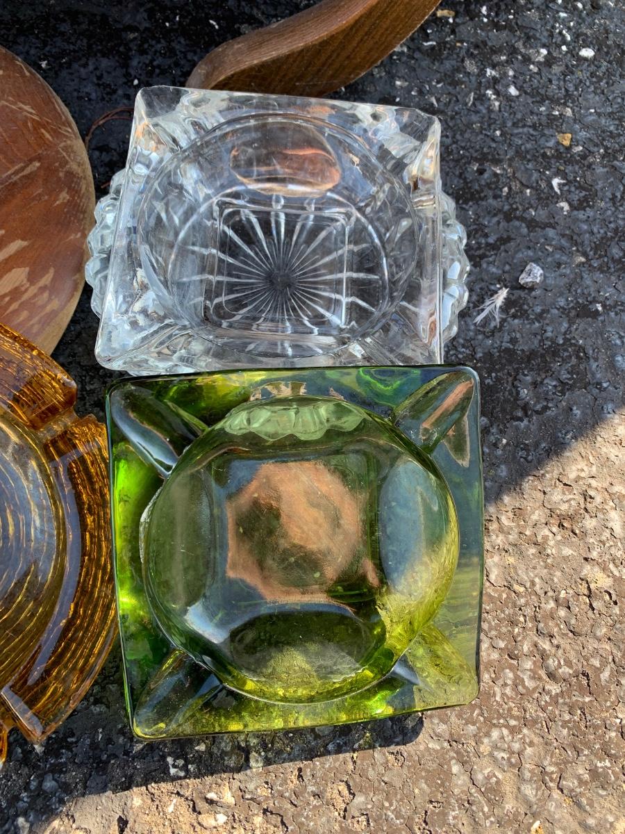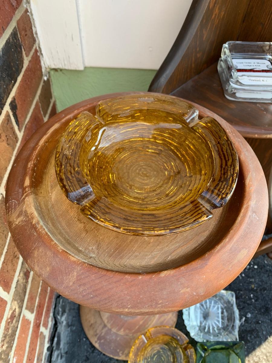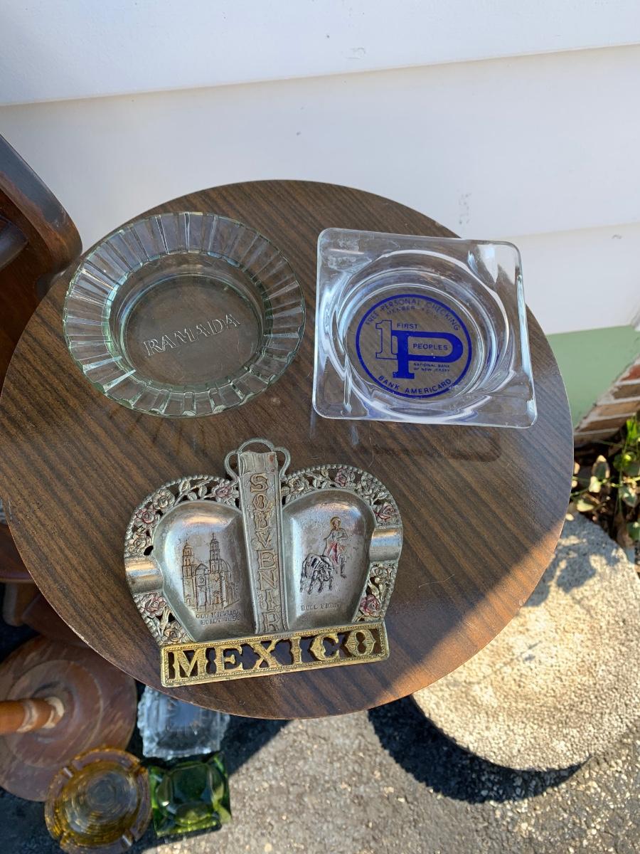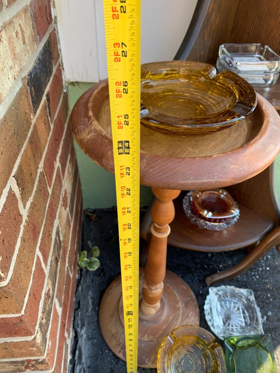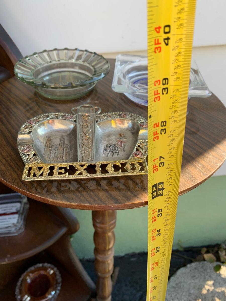 Includes three pieces of furniture and several glass ash trays. Corner shelf measures 59 inches tall, plant stands measure 36 and 24 inches each.