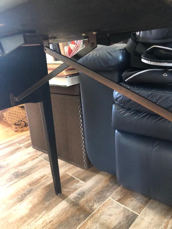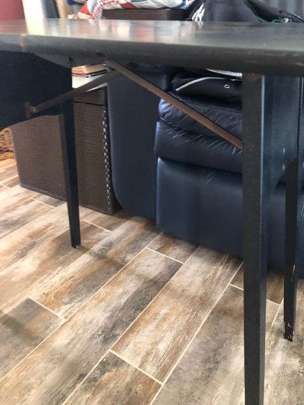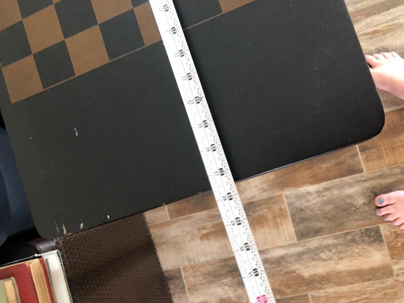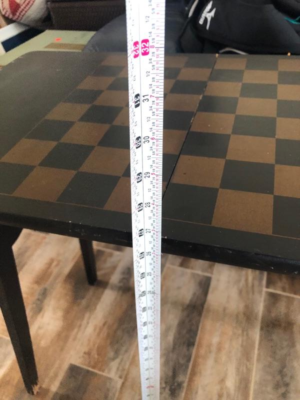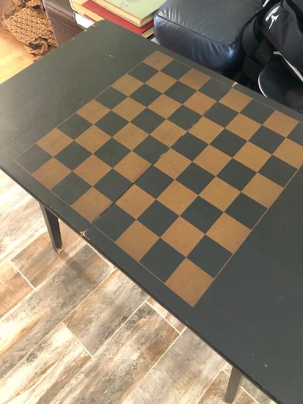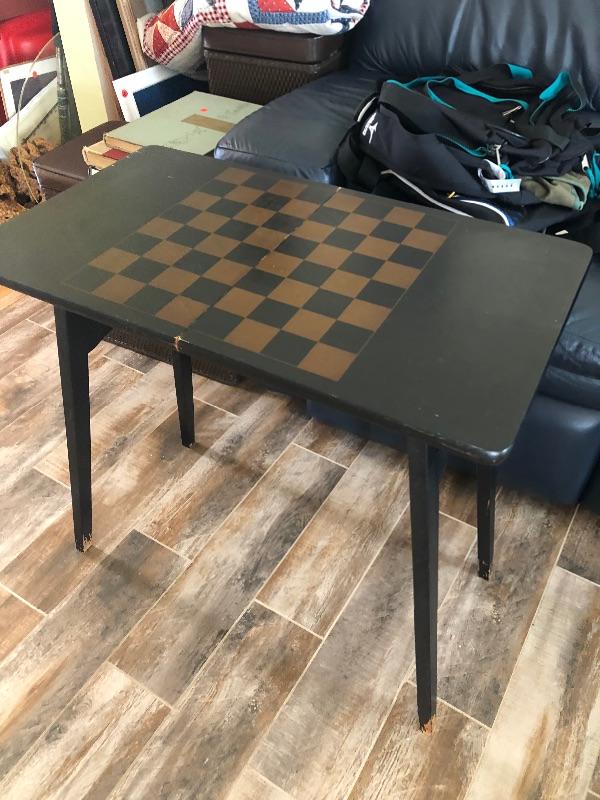 A fold up table with chess/checker board painted on top.