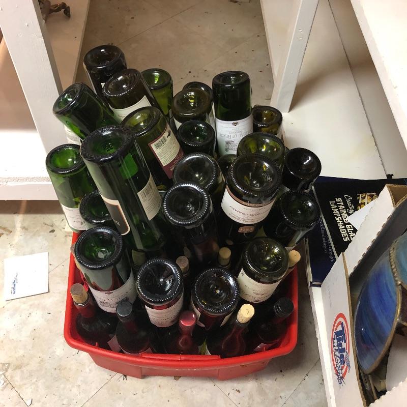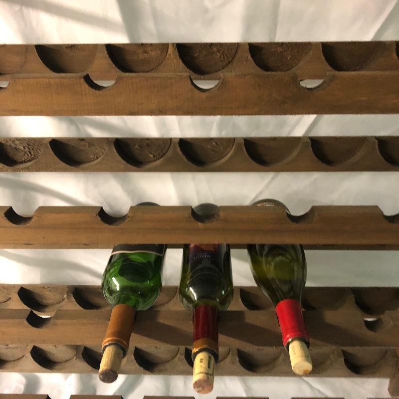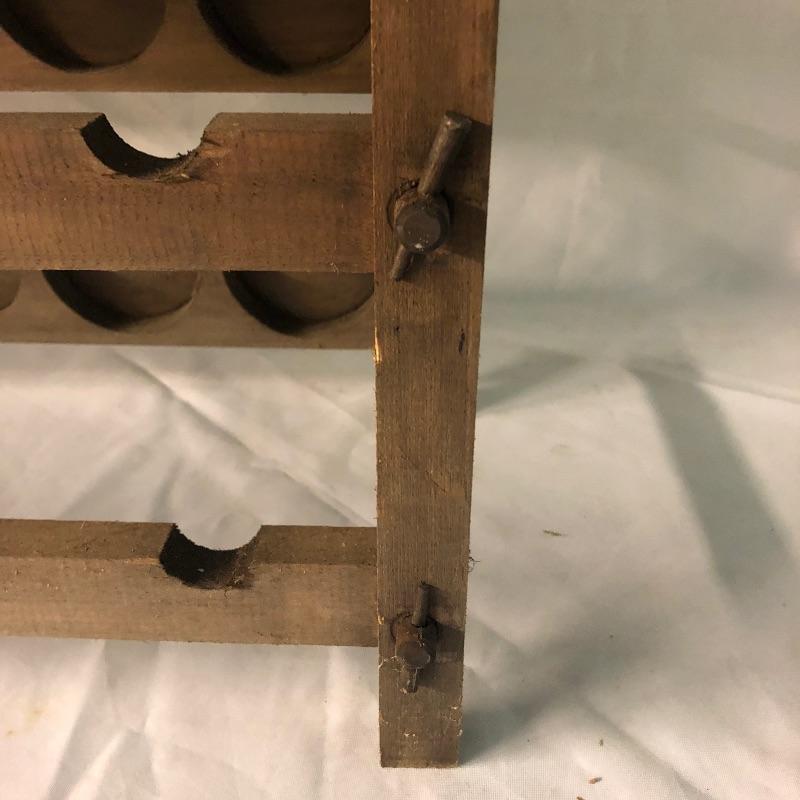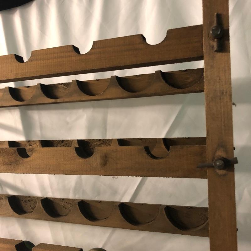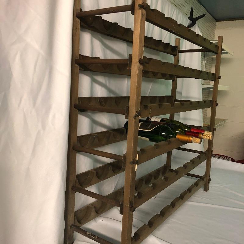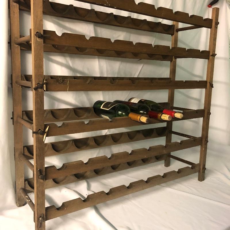 Stocking up on essentials a bit more these days! If so you will love this wine rack that holds a whopping 48 bottles. It appears to be a brown stained wood that needs a little attention to a few areas which are shown in images. We have also included a bunch of wine bottles; sorry folks they are empty, but will be great for crafts or candle holders, etc.